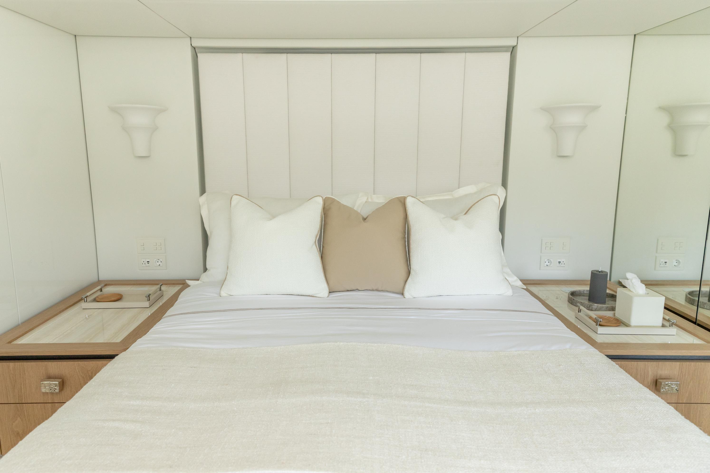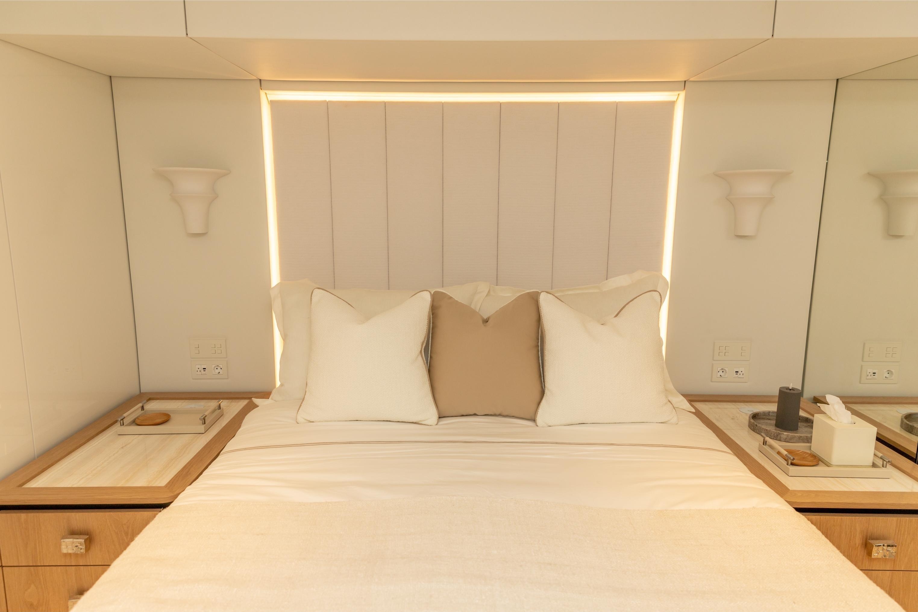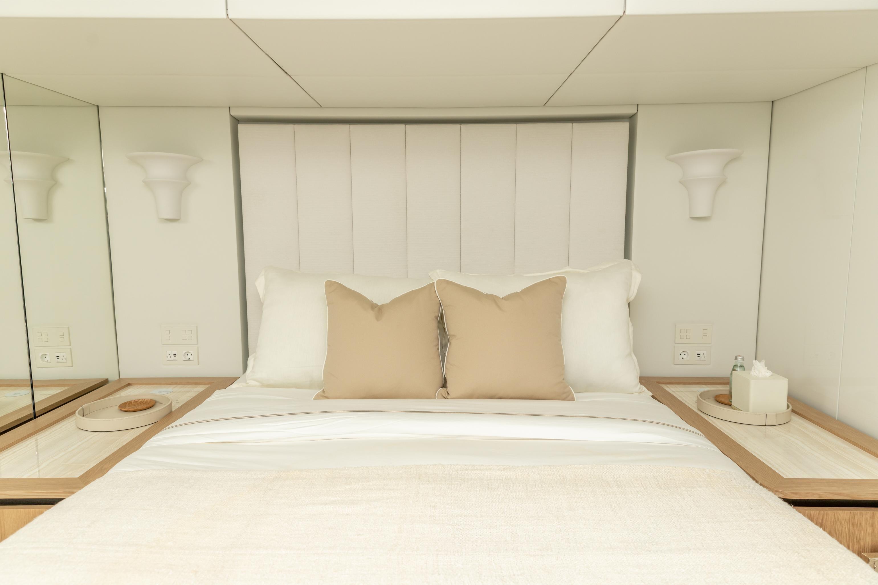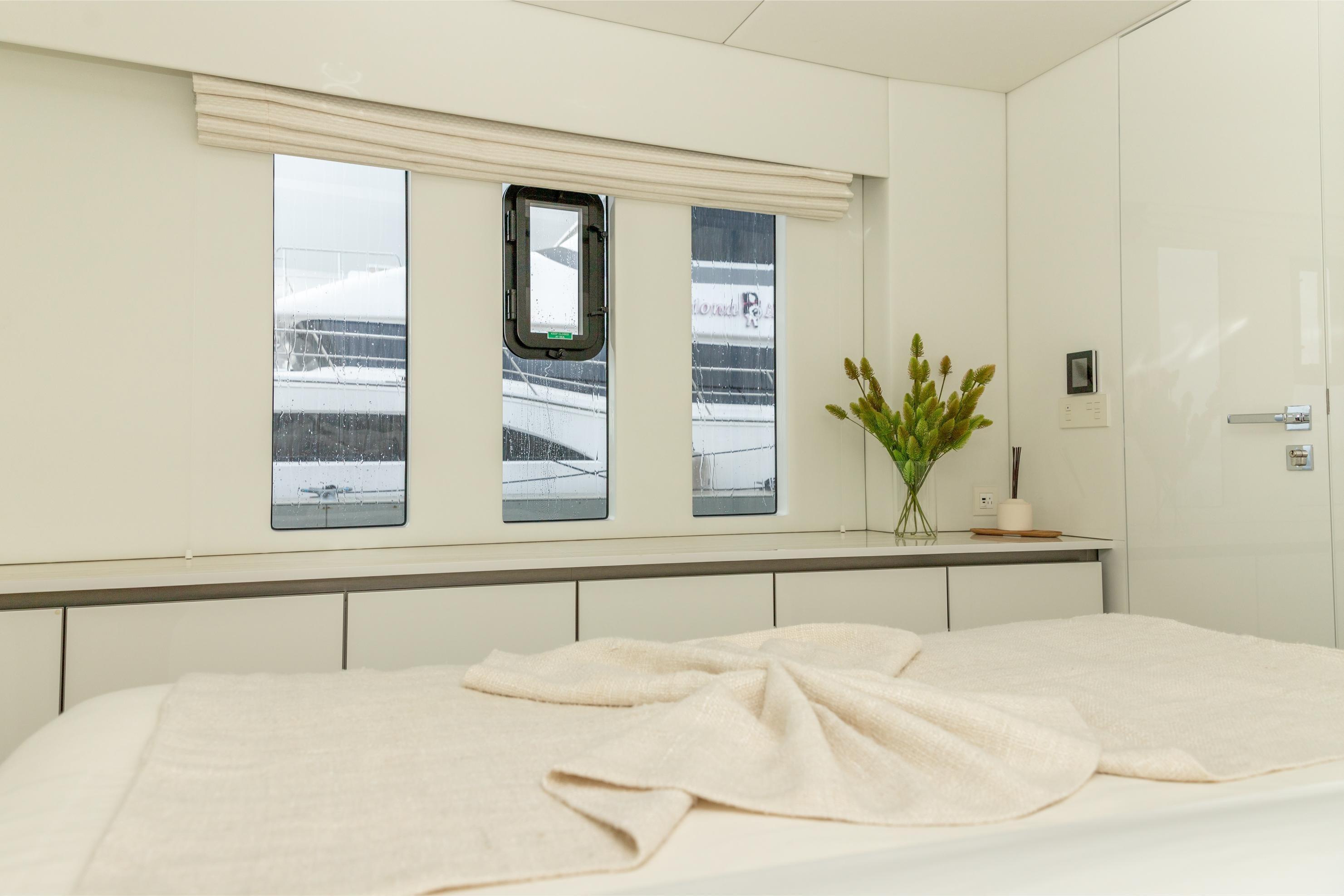 The 80 Sunreef Power is a universal multihull yacht for long cruises in ultimate comfort. Taking luxury and seaworthiness to a new dimension, this dynamic and elegant craft enters the Sunreef Yachts range, redefining the authentic power catamaran design. The yacht’s dynamic hull and superstructure stretch the living spaces to the extreme, offering infinite options for a bespoke layout and décor.With a bold, contemporary hull styling, the 80 Sunreef Power incorporates classic stainless steel portlights, teak sole decks, high bulwarks and subtle ambience lighting. Her massive garage combined with an aft platform allows the 80 Sunreef Power to take her dinghy, numerous water toys and jet-ski anywhere she goes. Easily accessed from the saloon, the yacht’s full-beam bow terrace is a vast, soothing retreat with amazing amounts of space for sunning and lounging. The 80 Sunreef Power’s immense flybridge offers enough breadth to house a spa pool, a wet bar and generous seating all around. One of the most spectacular features on board the 80 Sunreef Power is the master suite which can be set up in the bow section of the main deck. With a double bed facing the bow terrace, a bathroom with a walk-in shower, dressing and desk, the suite is bathed in sun from the skylight glazing. The same space can also be used to install a large lounge with ample seating and access to the foredeck.The main saloon opens wide onto the ample aft cockpit to combine the yacht’s interior dining space with the outdoor relaxation areas, where more seating is available along with a wet bar. The fully customizable saloon can also accommodate for a large galley, depending on the layout selected and houses an elevated interior navigation station.The immense volumes in the hulls of the 80 Sunreef Power give plenty of room to tailor every unit’s layout to the most specific requirements. The crew quarters along with the galley and crew mess can be accessed directly from the aft cockpit for more privacy on board. Multiple layout configurations are available to set up luxurious guest cabins for a supreme level of comfort on board.