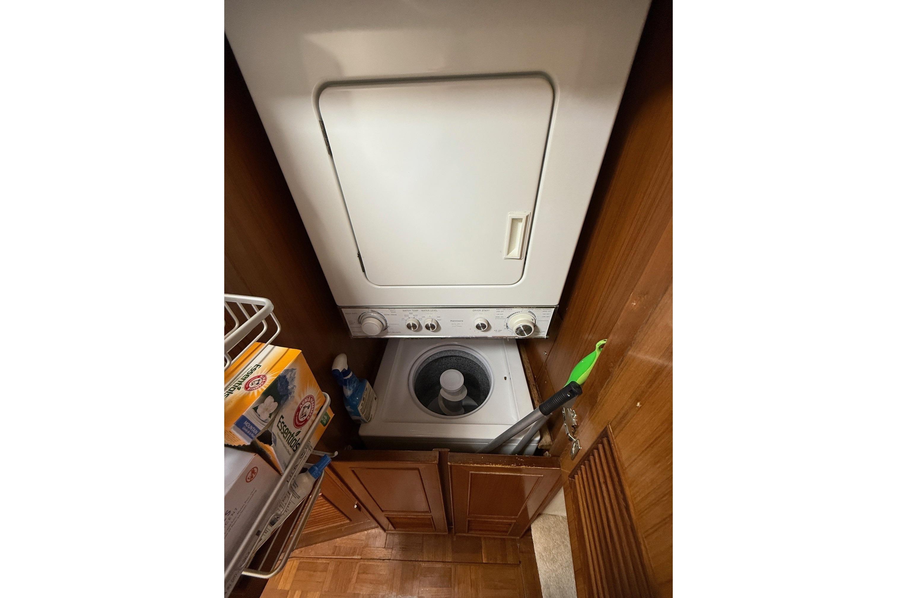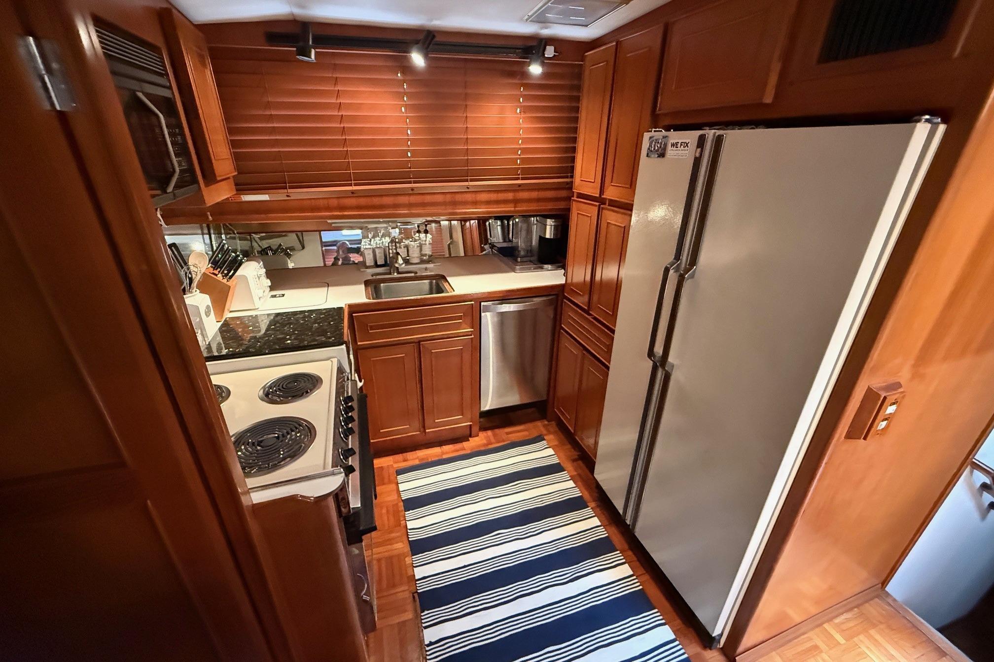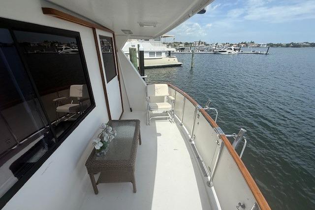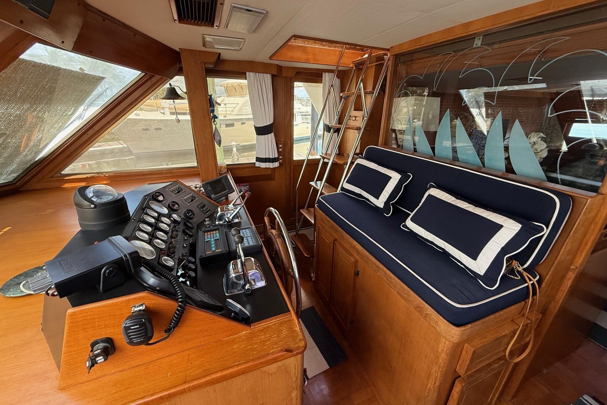 The vessel's layout facilitates access to the main deck via tide ride ladders on either side, leading into the pilot house. Positioned forward of the expansive salon and aft deck, the pilot house provides entry to the full galley, which includes an L-shaped dinette, located a few steps down. Proceeding forward from the galley, a guest stateroom features over/under berths and a private head with shower. Aft of the galley, a companionway houses a washer/dryer within a closet, alongside a second guest stateroom equipped with a full berth. A head with shower is across the hall. Further aft are twin engine rooms and the master stateroom, situated at the stern, complete with a centerline queen berth and a head/shower with tub. The flybridge, accessible from the pilothouse, offers a secondary steering station, an L-lounge, bench seating, and a boat deck at the aft end, equipped with a davit and Zodiac dinghy.