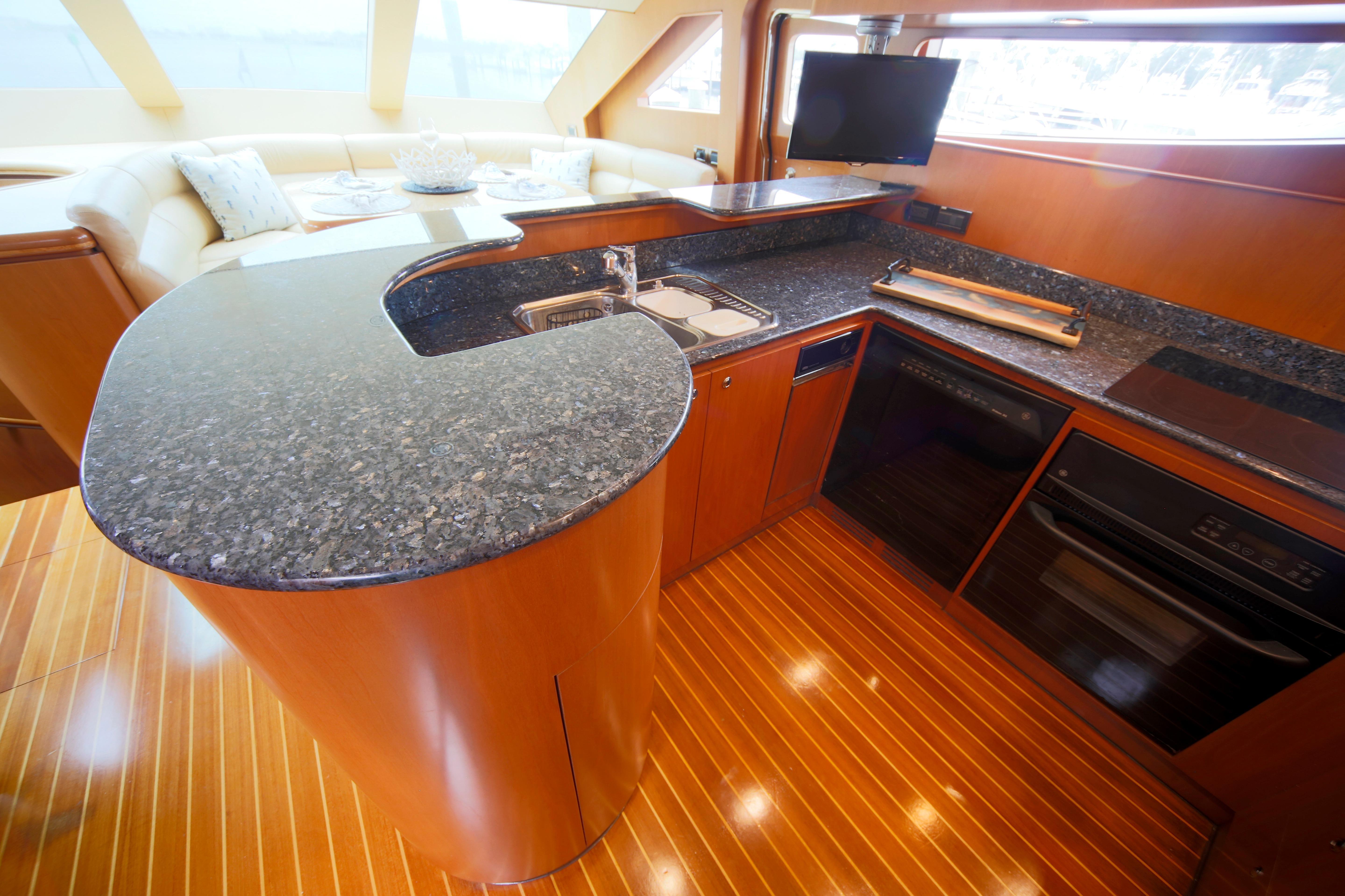 GalleyOne step up and just forward of the salon is the open galley. The sole is teak and holly, countertops are granite. The galley is U-shaped off the starboard side of the yacht. There is a U-shaped dinette forward, with a country kitchen arrangement. ICOM VHF radio in the galley. Forward of the galley but open to the area is a small cherry table and a C-shaped settee to seat four.