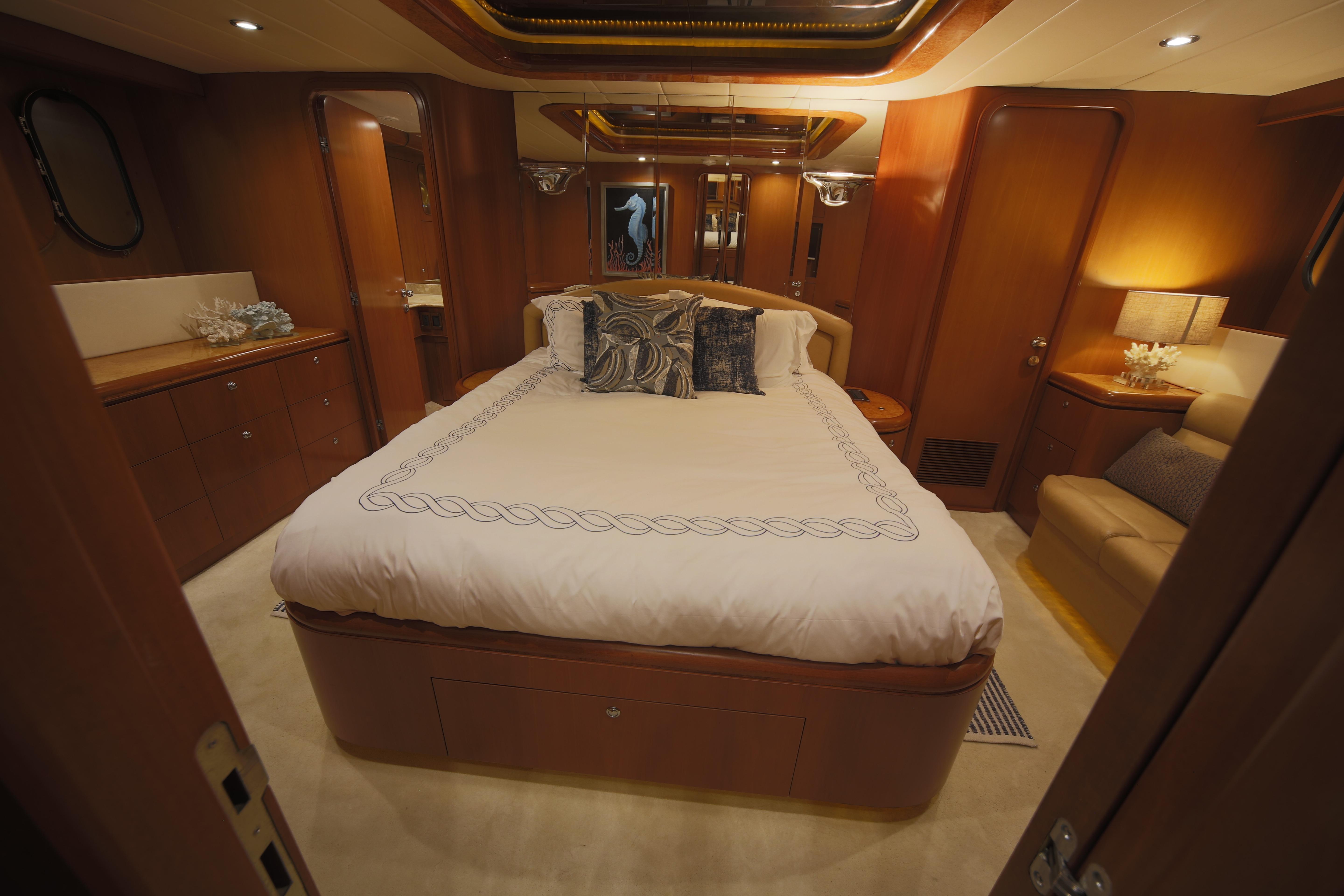Master StateroomLocated centerline of the yacht, this cabin offers maximized beam, a quiet and stable ride, and the highest level of fit and finish. Entering from the forward end, there is a king-size berth on the centerline with rope lighting and abundant storage below.