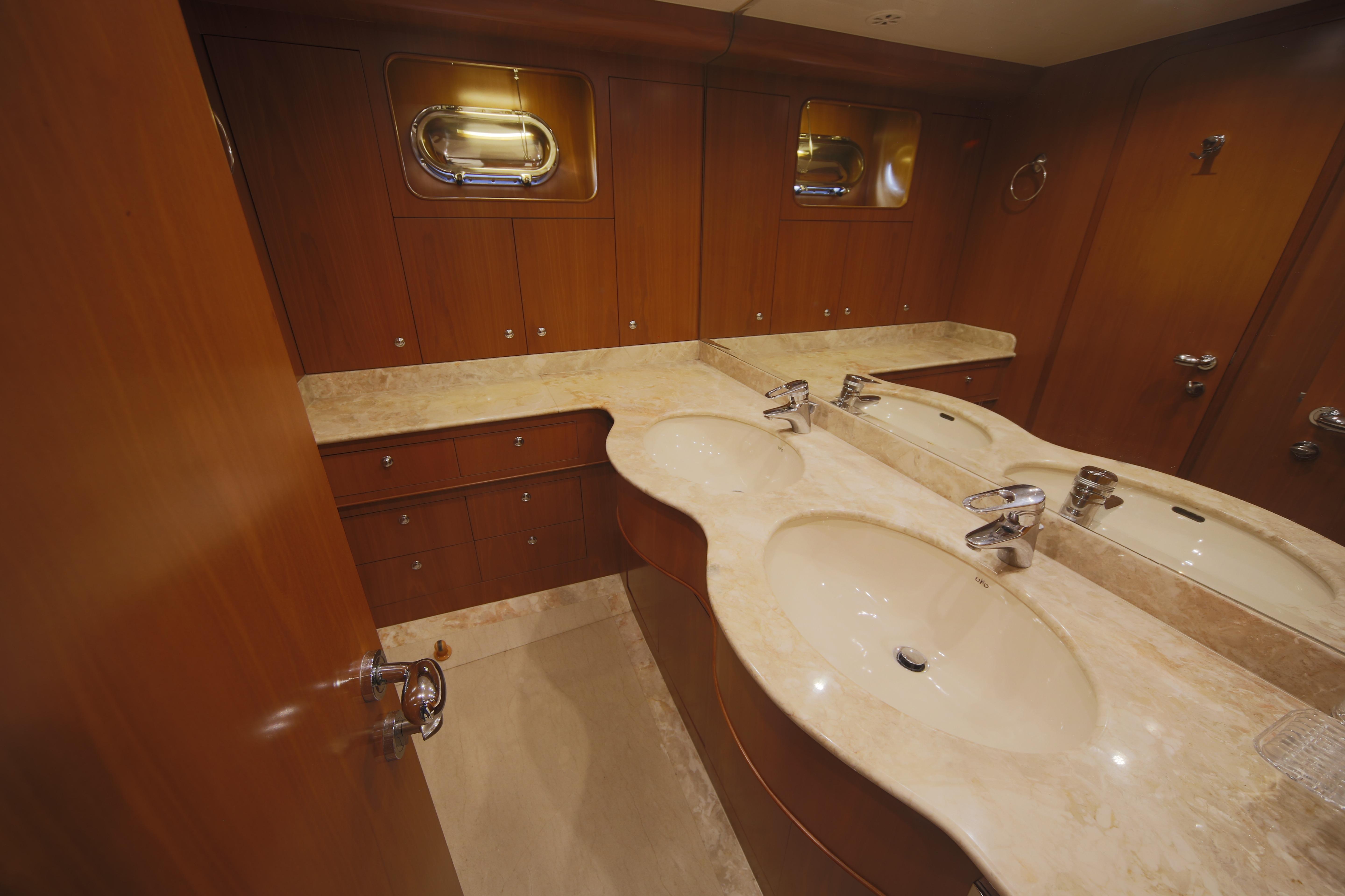 Master HeadThe master head is entered from the aft starboard corner of the master stateroom. The sole is a marble slab with a contrasting border and brass inlay. The twin bow front vanity has storage below, two under-mount sinks, and a marble countertop. There are ample mirrors and medicine cabinet storage. The Head Hunter Royal Flush toilet is centerline in its own enclosed room with a stall shower to port. The shower fixture is hand-held or wall-mountable, the shower has a clear glass shower door, and a marble tile sole.