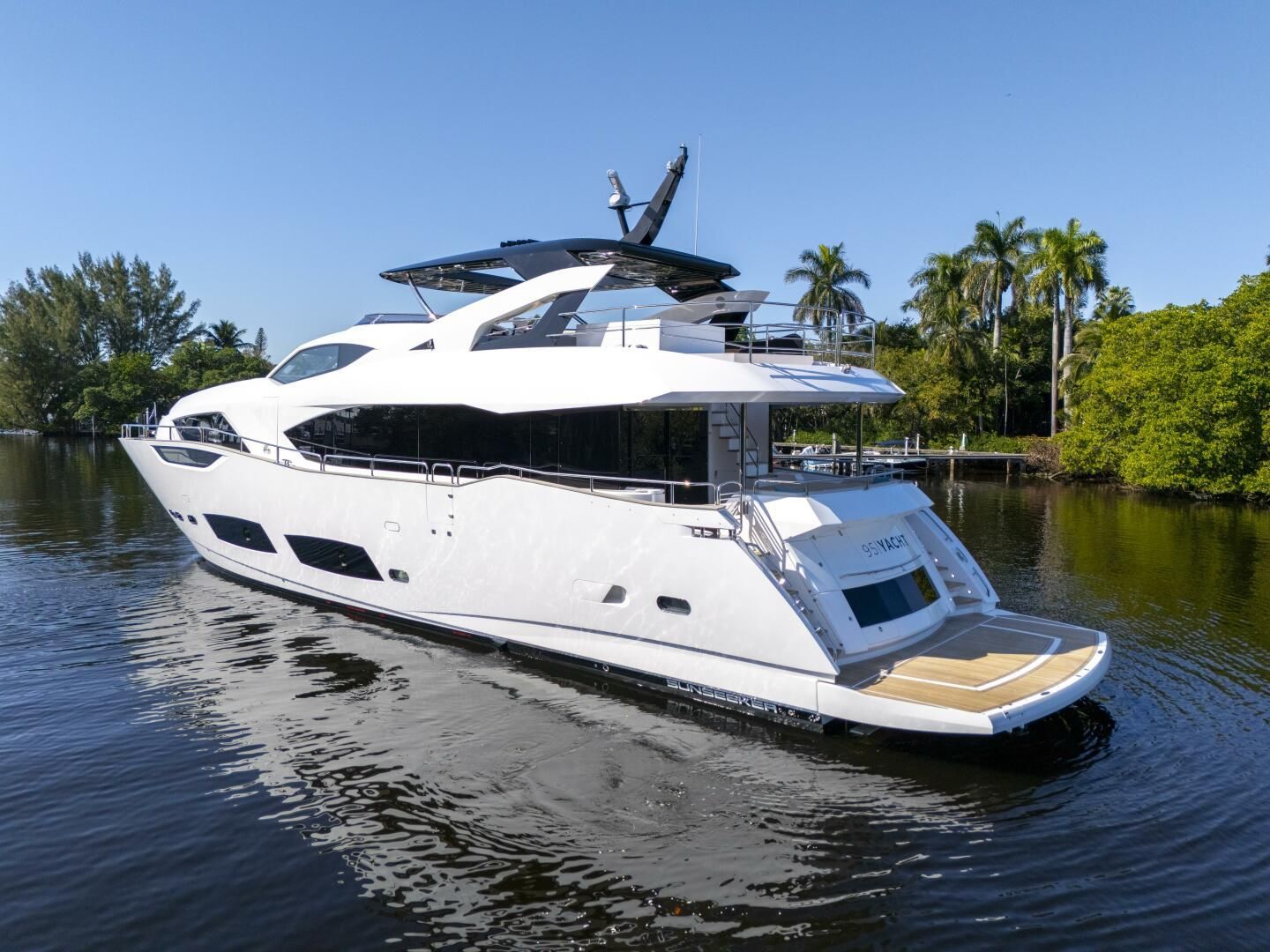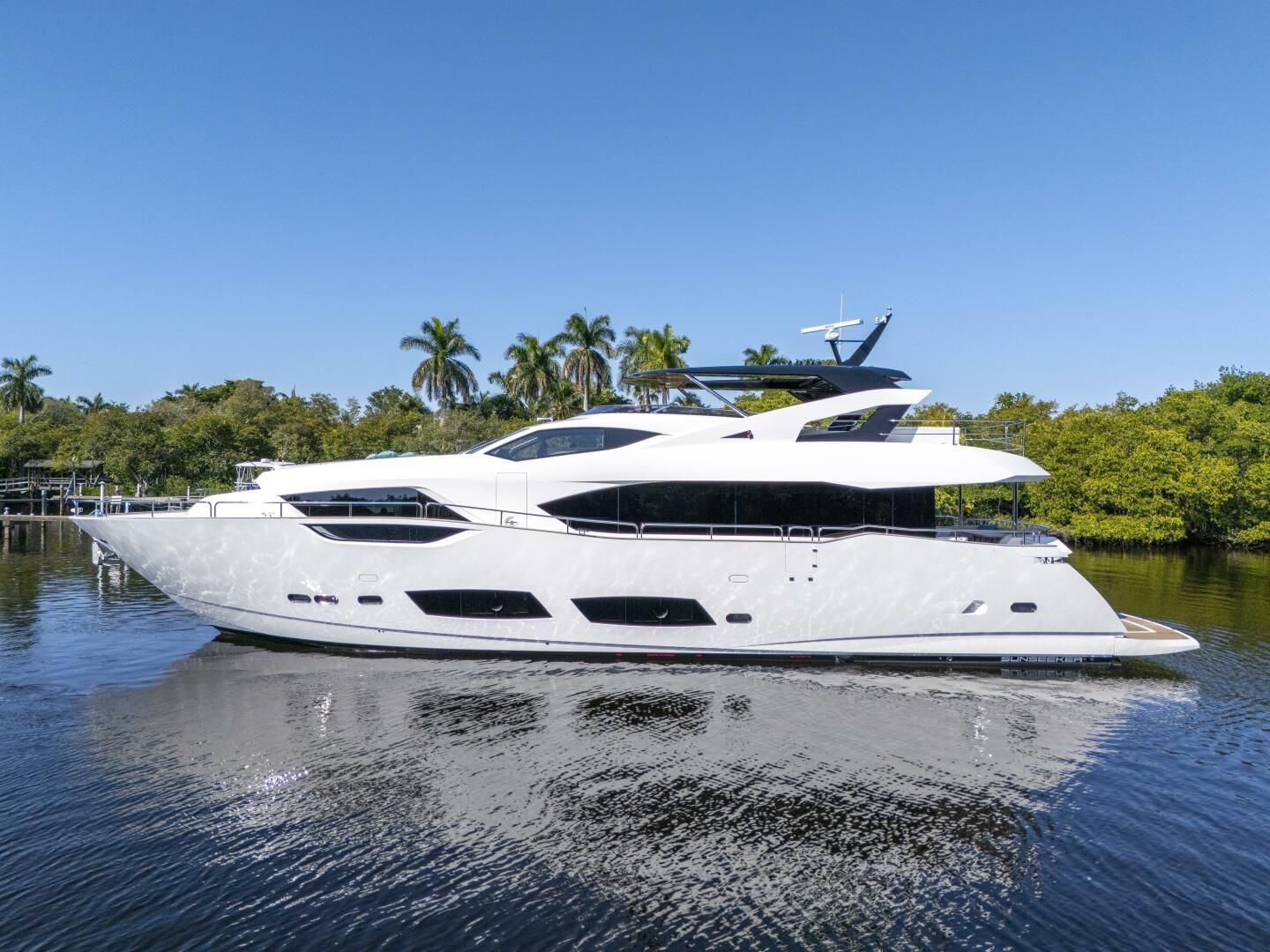 ONLY THIS BOAT AVAILABLE AT THIS PRICE. INCLUDES ALL AVAILABLE REBATES AND A SPECIAL FACTORY INCENTIVE. CALL ABOUT THIS ONE-TIME BUYING OPPORTUNITY.ALSO TAKE ADVANTAGE OF PRE-TARIFF IMPORTING. ALL DUTIES HAVE BEEN PAID & THE BOAT HAS BEEN IMPORTED TO THE US.This Sunseeker 95 Yacht’s striking lines and innovative layout exemplify Sunseeker’s cutting-edge design and advanced build processes, merging the grandeur of a superyacht with the practical benefits of a motor yacht in this size range.One standout feature is the unique main deck layout, which includes a special master cabin configuration offering exceptional flexibility and space typically found in larger yachts. The luxurious master stateroom on the main deck leads to a mid-level dressing area and a sumptuous en-suite bathroom via a forward staircase. The raised pilot house enhances this expansive main deck layout, providing remarkable spaciousness for a yacht of this size.Above deck, the spacious flybridge is well-equipped with a second helm, a bar, a hot tub, and ample seating for stylish guest entertainment. Built on the classic deep V hull, the 95 Yacht combines luxurious performance with timeless design, ensuring a magnificent yachting experience.
