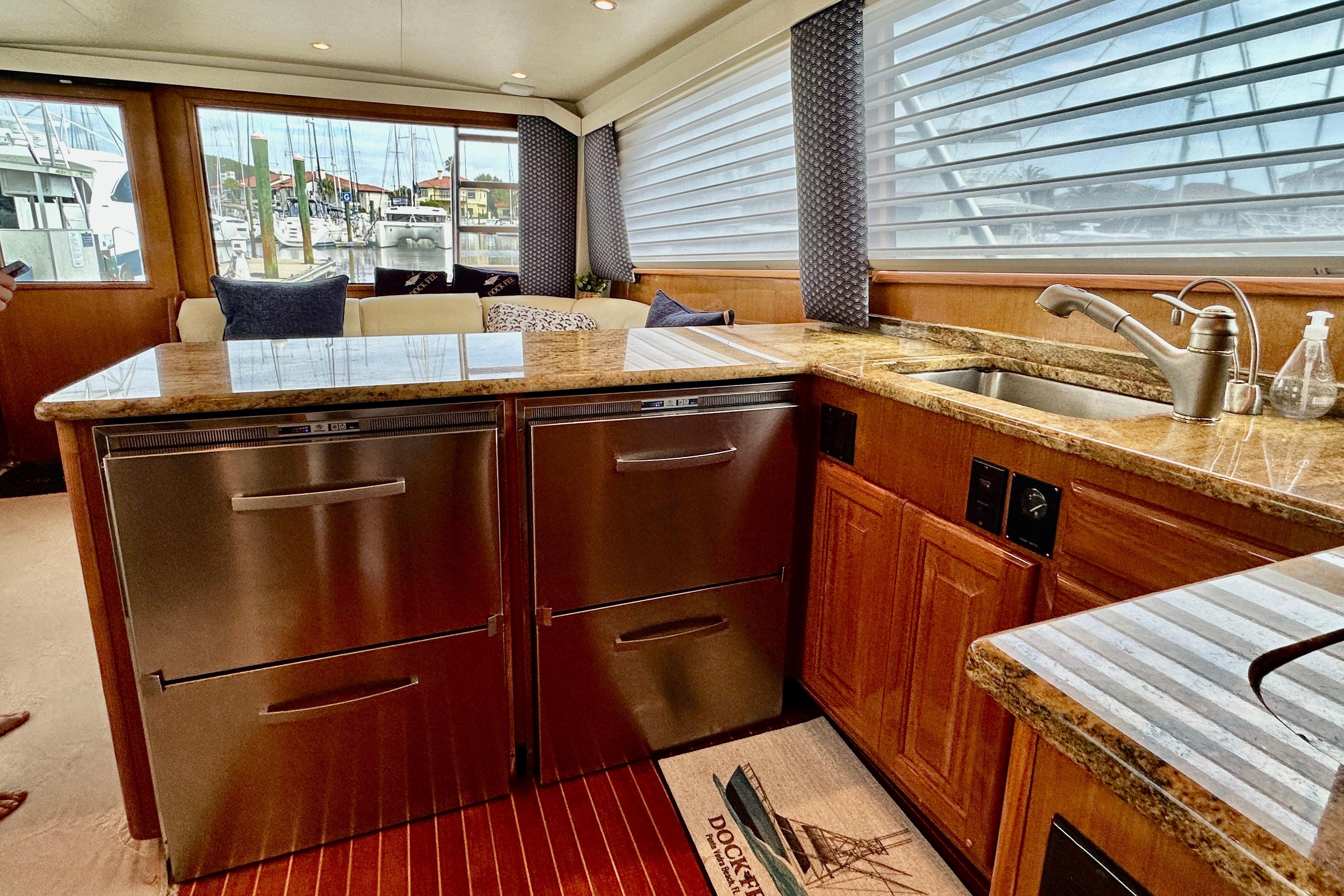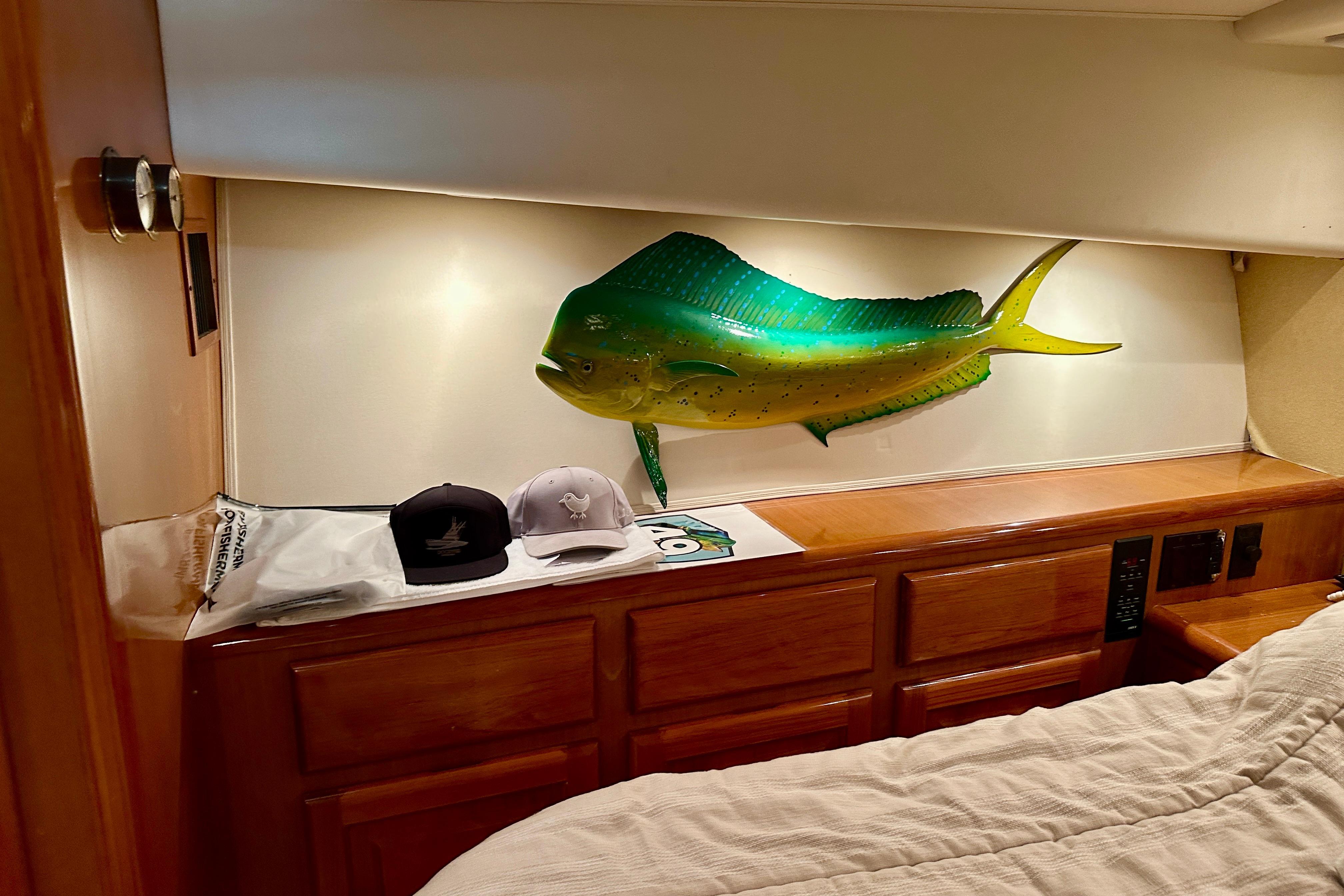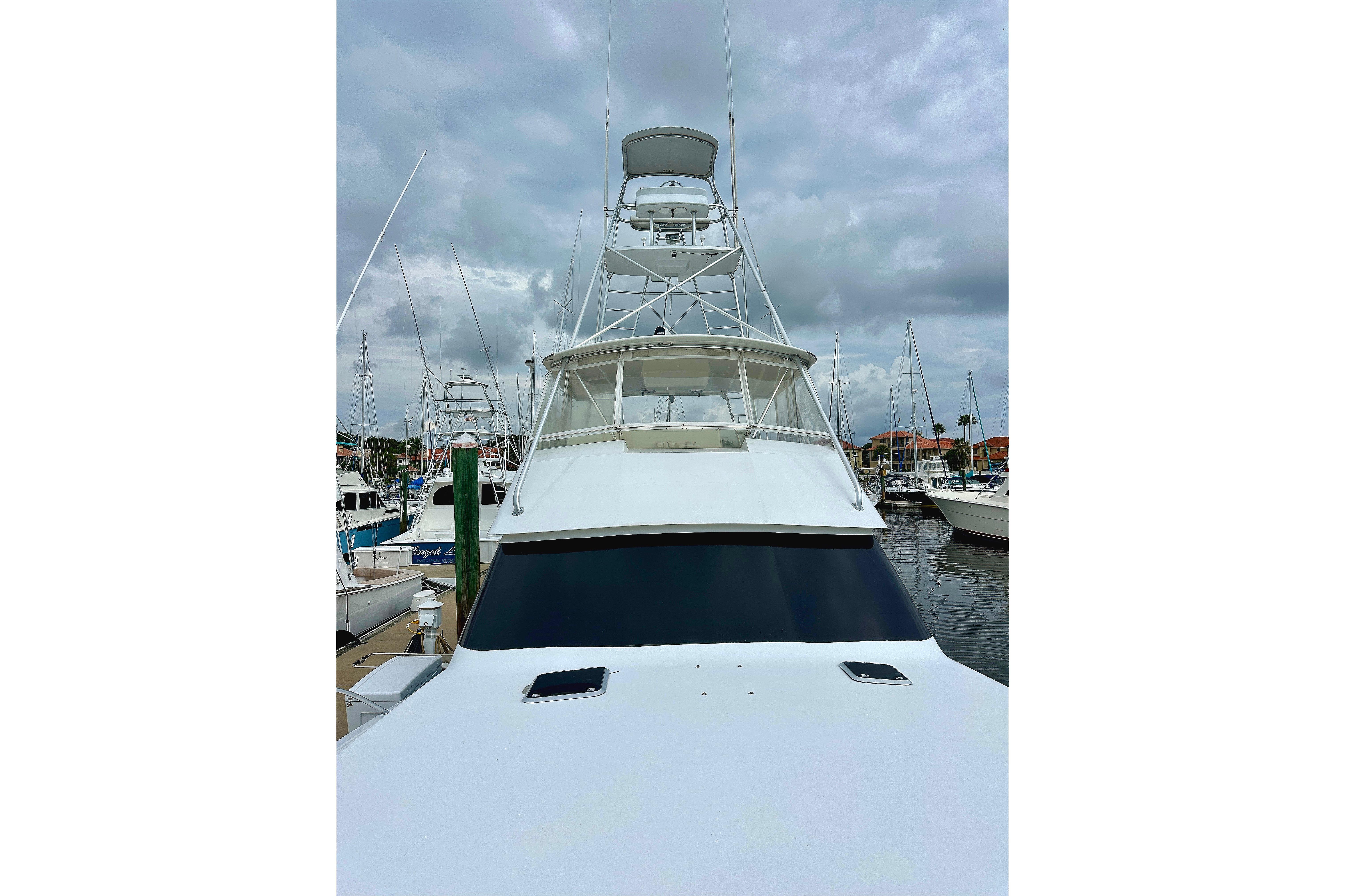 The 50' Viking Convertible features a spacious and functional 3-stateroom, 2 head, galley up layout. The VIP guest stateroom is all the way forward with over and under berths. The guest head is just aft with electric Vacuflush head, stall shower and Corian countertop and sink. The washer and dryer stacked units are located in the companionway just ahead of the 3rd stateroom. Located to port, the guest stateroom has over and under berths, hanging locker, and storage drawers. Across to starboard is the master stateroom which is located amidship and features a walk-around queen berth. There is an ensuite private head with stall shower, Vacuflush head, & Corian countertops. Going up 3 steps will bring you into the galley which features updated stainless Vitrifrigo refrigerator/freezer drawers, a microwave/convection oven, & granite countertops. The salon features an L-shaped settee with storage below, new OLED TV, and entertainment system with Starlink.