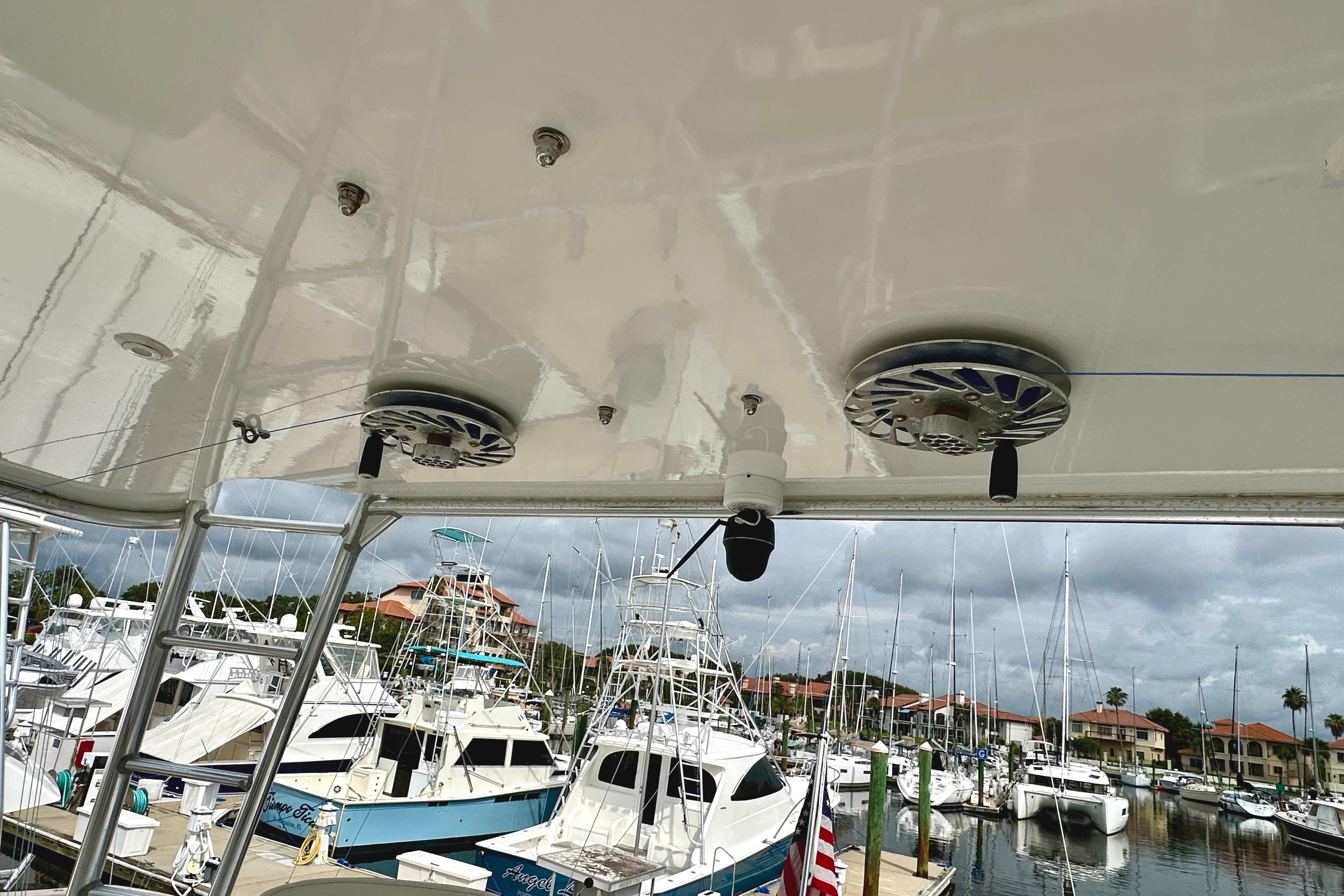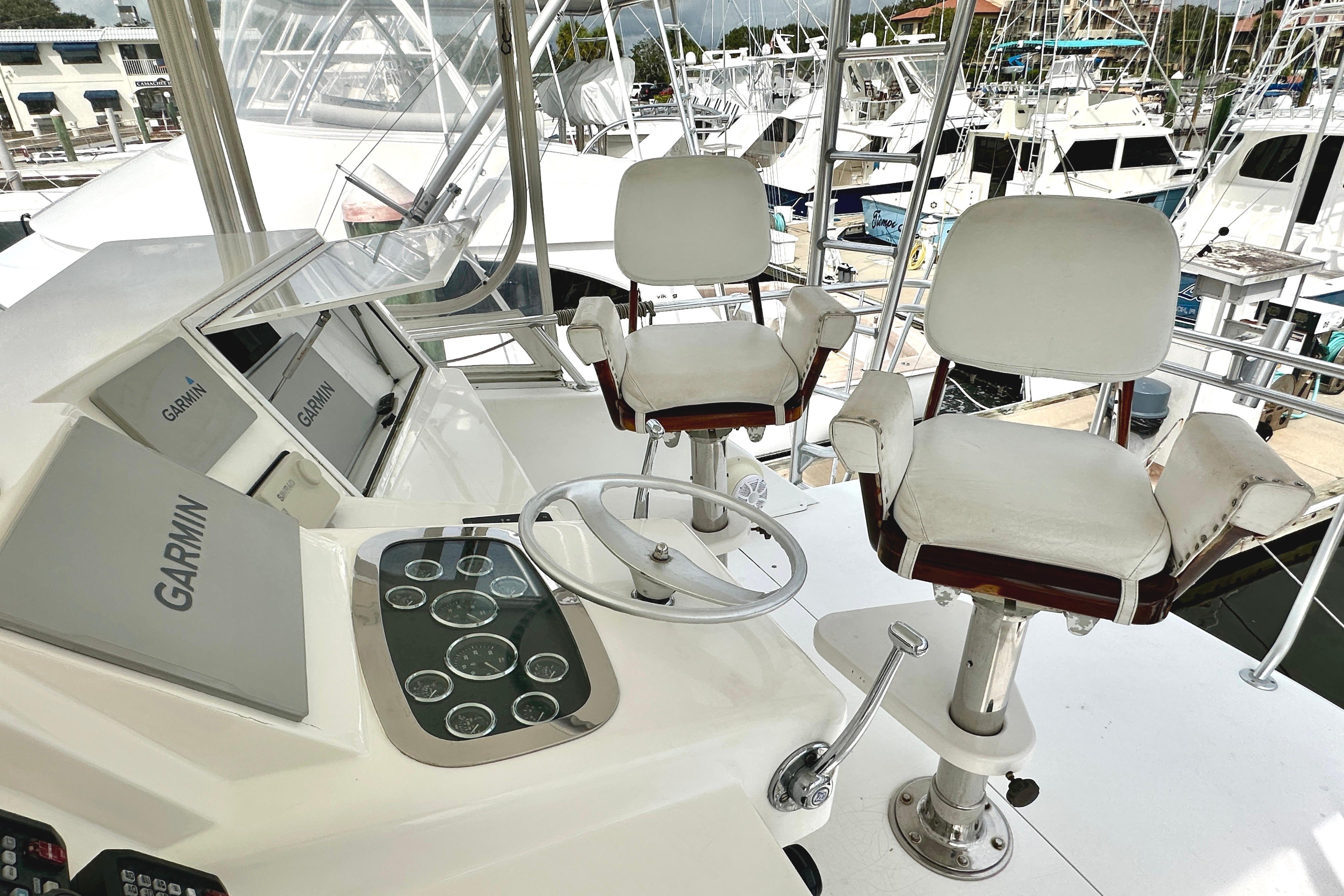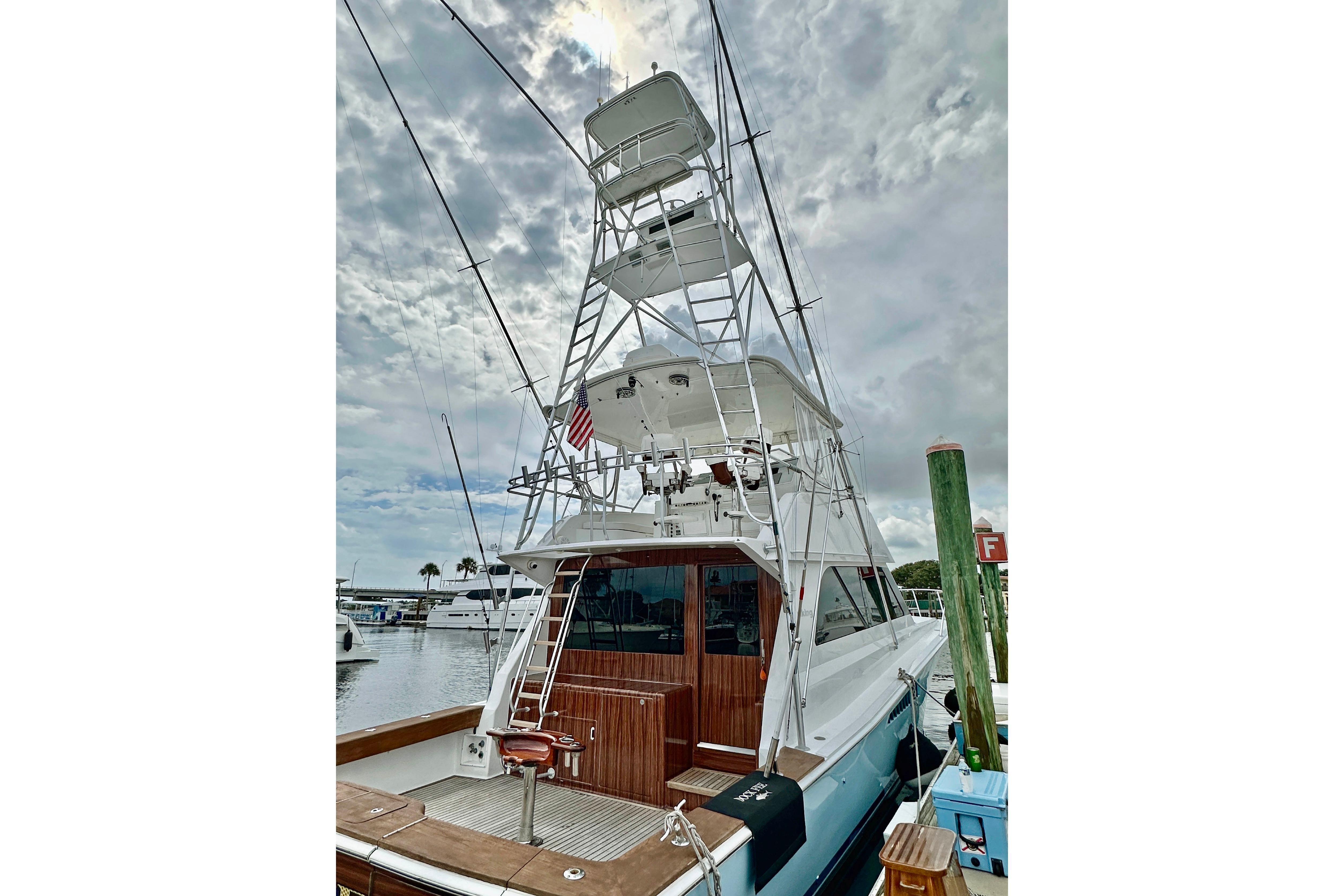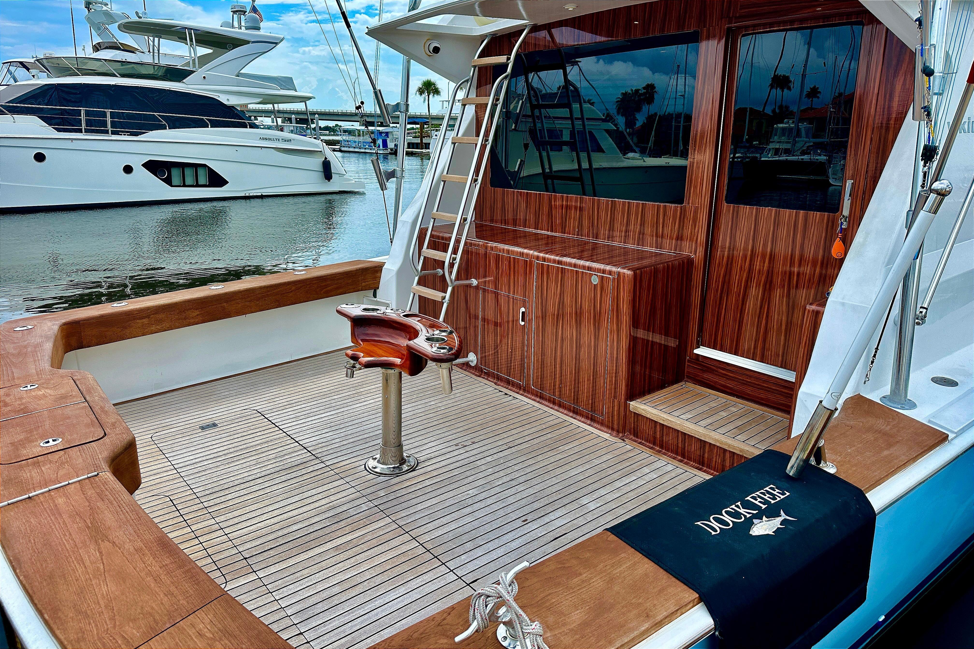 "Dock Fee" is a three stateroom, two head, 50 Convertible, with a factory tower and "Sky Blue" painted hull. One of the rare 50's built with 1200hp MANs, this boat absolutely flies! Updated Garmin electronics, many house and galley updates, entertainment upgrades like OLED tvs and Star Link. Her teak cockpit, and covering boards were redone a few years back and are great shape, and to top it off, a gorgeous Mariteak battle saddle adds to the eye candy.
