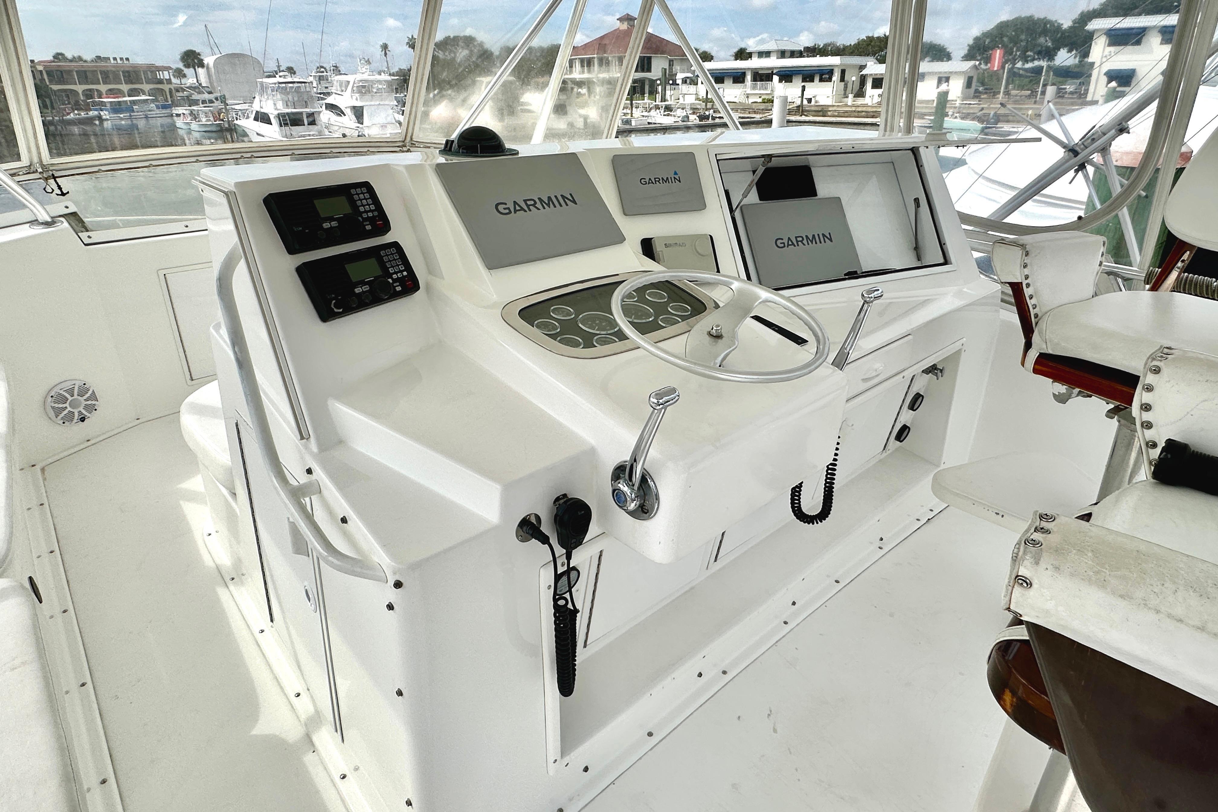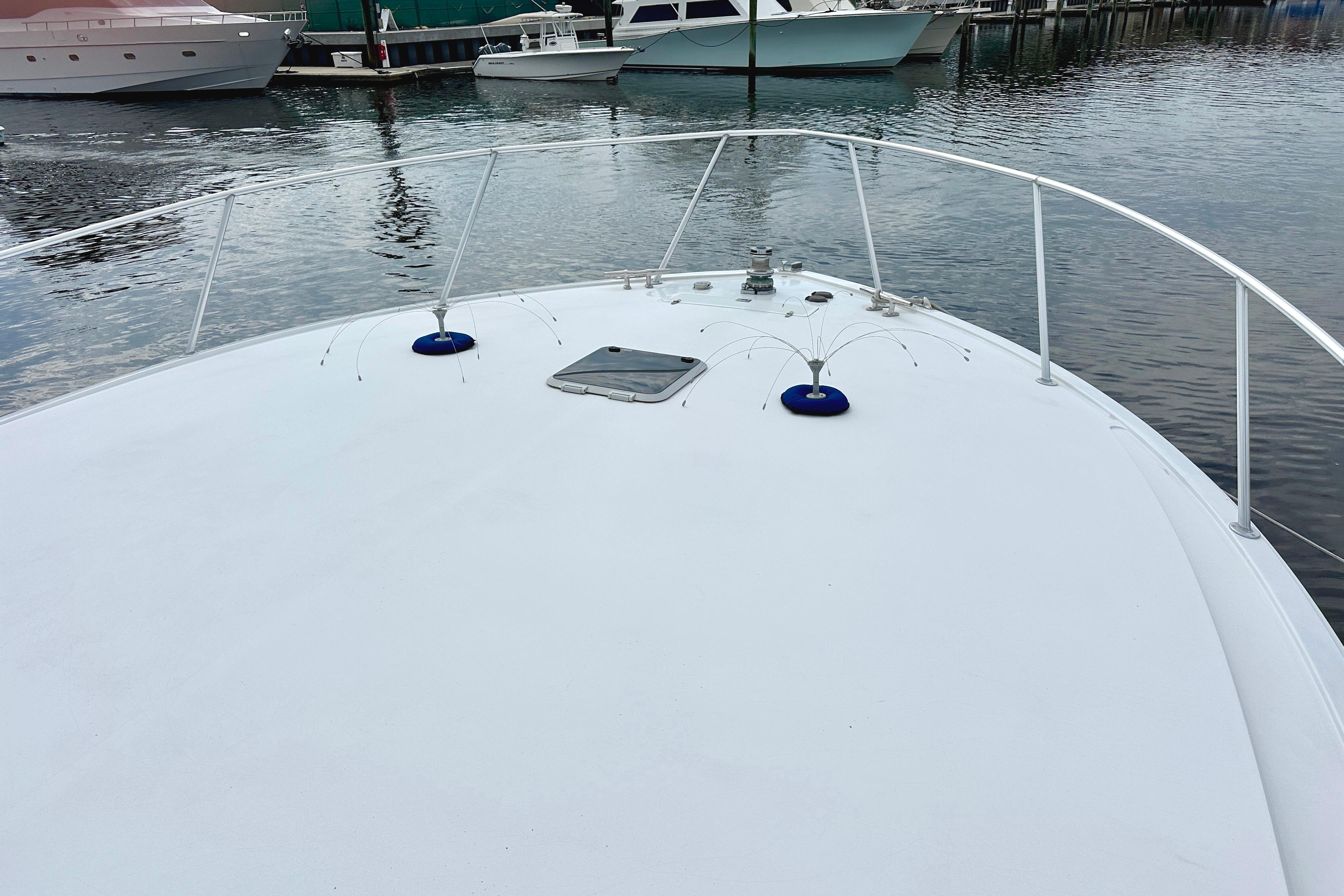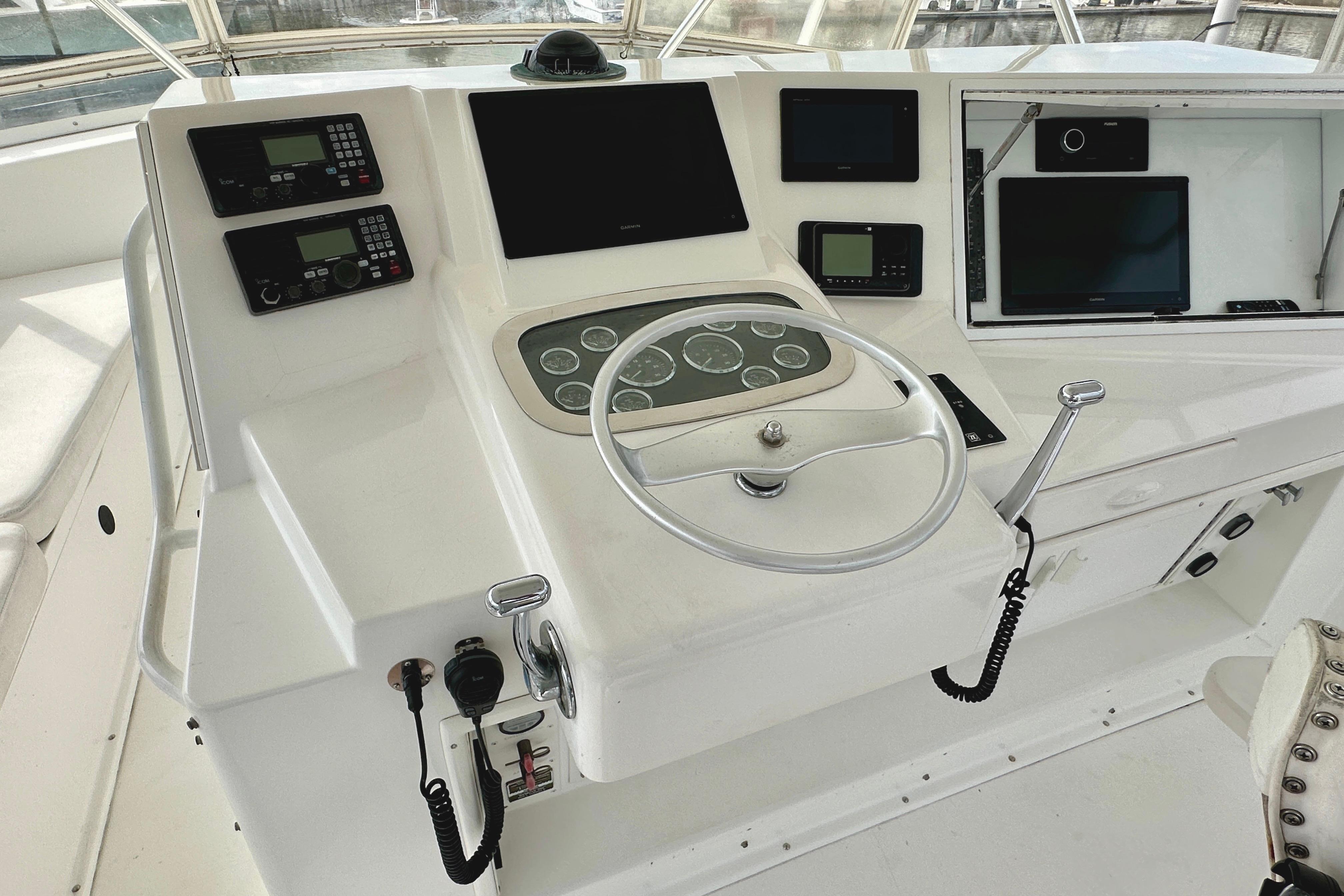 "Dock Fee" is a three stateroom, two head, 50 Convertible, with a factory tower and "Sky Blue" painted hull. One of the rare 50's built with 1200hp MANs, this boat absolutely flies! Updated Garmin electronics, many house and galley updates, entertainment upgrades like OLED tvs and Star Link. Her teak cockpit, and covering boards were redone a few years back and are great shape, and to top it off, a gorgeous Mariteak battle saddle adds to the eye candy.