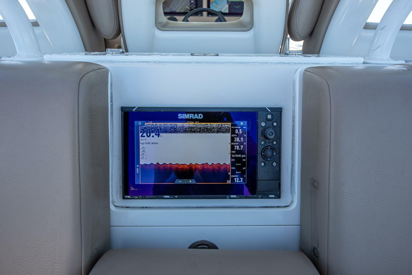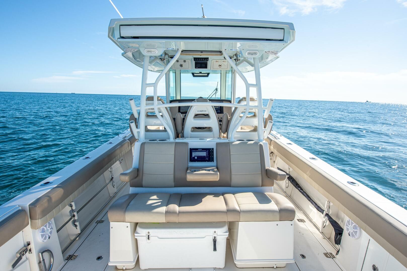 - Leaning Post w/ 3 person Helm Seating and 3 Person Aft Facing Seat w/ Flip Down Armrest & Cup Holders, Cooler, Fridge, Storage, Powered Driver’s Seat Slide and Landing for rear Facing Bottom Machine