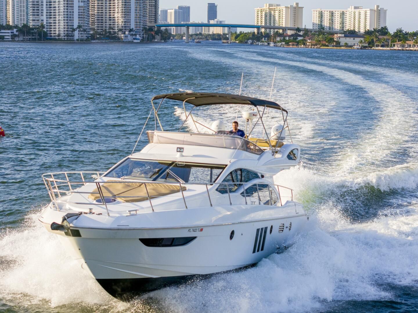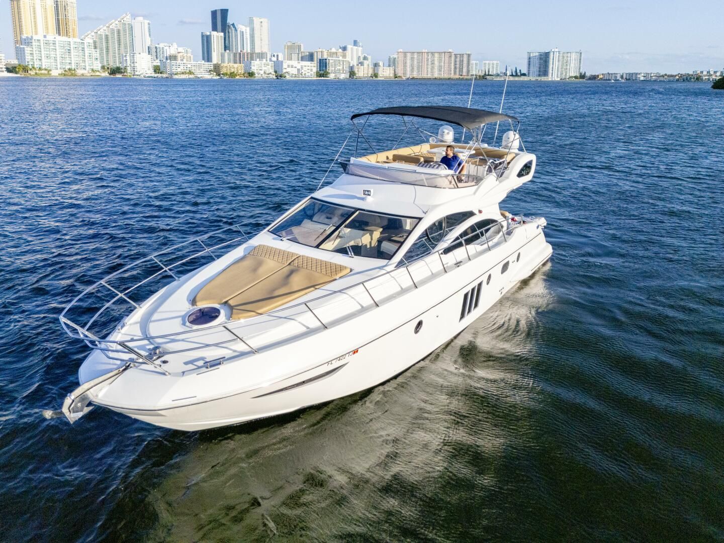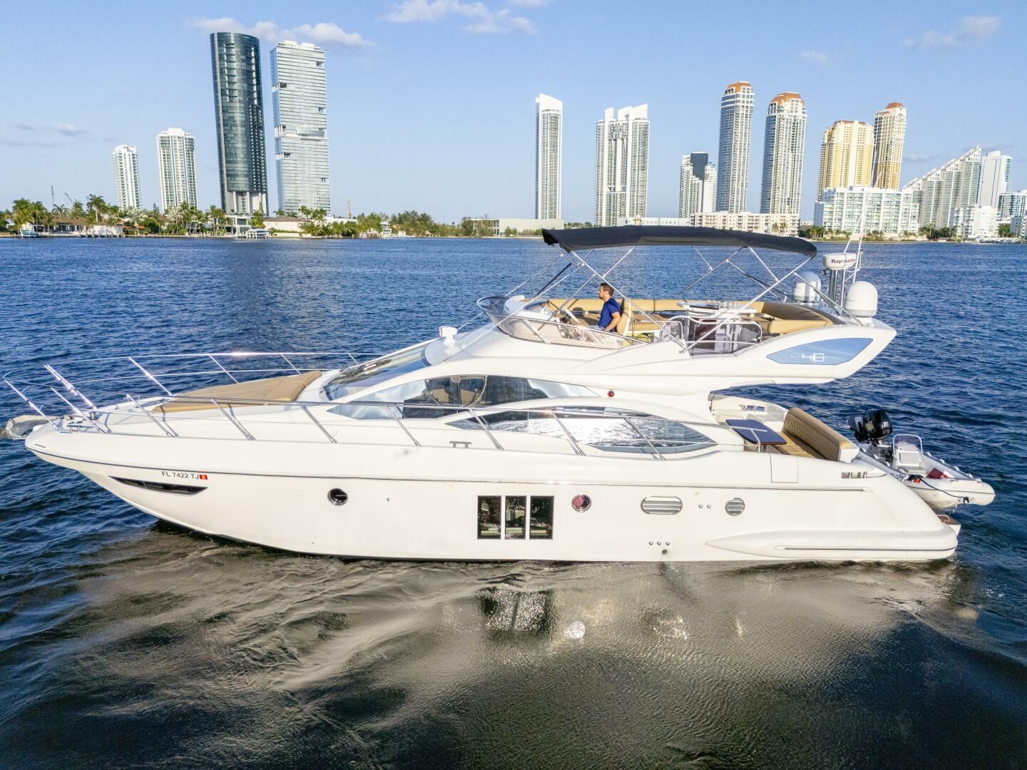 2014 Azimut 48 Flybridge2nd Owner Boat - NEVER CHARTEREDHighlights:Powered with twin Cummins QSC 8.3L 600 HP - Approx 850 hours18 KW Kohler Generator Replaced in 2021 - Approx 450 hoursXenta Joystick on both helms2019 Gala 10' Dinghy 25hp OB includedTeak Cockpit and Hydraulic Swim PlatformServices completed in December 2023 Shafts, Props, Gears, Bottom Paint, New Underwater Lights, Hydraulic Hoses for the Swim Platform, & all New StrainersHELM: Two-seater-helm bench with adjustable wheel and sliding side windows Engine control levers Raymarine Gold Package Electronics Optical and Audible Alarms Main Engine Ignition Keys with start/stop buttons Generator Control (on the electric panel to port of displays) Battery parallel switch Compass Xenta Joystick with bow thruster control Anchor Winch control Autopilot Trim Tabs Gauges: Diesel fuel level, Fresh water level, Engine Temp indicator, Engine and Gear Oil Pressure 12V socket GALLEY: Glass ceramic range with 4 hot plates and stainless steel pot holders Combination Microwave oven Worktop with single sink, hot and cold water faucet Exhaust vent 7 cu ft - 24V fridge/freezer behind Zembrano wood decorative door Zembrano wood furniture and teak flooring throughout cabinACCOMADATIONS:Master Suite: Centerline double berth which lifts up for luggage storage Two large storage spaces above master windows Drawer under bed Leather bed frame Two hanging lockers Panoramic windows Escape Hatch Cabin A/C Control TV with Sat TV LED Lights Master Head: Separate shower with circular cubicle and teak wooden grate Marine head with macerator pump Zembrano Iooring Vanity storage and mirror Wooden venetian blinds Guest Cabin (Port): Two single side by side berths Leather bed frames Drawers under beds LED lights Cabin A/C Control TV Guest Cabin (Starboard): Two single side by side berths Leather bed frames Drawers under beds LED lights Cabin A/C Control TV Guest Head: Circular shower with plexiglass doors and wooden grating Marine head with macerator pump Shower column with faucet and shampoo bottle holder Vanity with hanging closet and mirror Accessible Porthole Zembrano Flooring Wooden venetian blinds Hull and Deck Features Sunlounge on Bow Non-skid walkways Dual boarding entry side doors Teak flooring in cockpit area Stainless steel handrails Mirror-Finished windows Navigations lights Dual fuel filler's with protective covers Exposed fresh water filler Exposed black water tank discharge outlet Engine room access via cockpit floor COCKPIT:Aft Deck: Tempered glass double door for salon access Cockpit bench seating Teak table Crew quarter (storage) access Overhead lighting Teak stairway to Flybridge Access to transom/hydraulic platformIce Maker TRANSOM/PLATFORM: Hydraulic remote controlled platform to hold tender and chocks Stainless Steel foldable swim ladderNEW Underwater LED LightsFLYBRIDGE: Non-skid decking Full Helm instrumentation and controls Large Sun-lounge and settee Table with BBQ Storage Stainless Steel railing Bimini soft cover topTwo Floodlights on Aft Flybridge ELECTRICAL: 110V - 60Hz 24V DC 2022 Generator Kohler 18 KW - approx 450 hours Shore power cord (with retractable Glendinning spooler) Batteries: 6 AGM - for House, 4 AGM for engines, 1 AGM for Generator Multi-bank battery charger (Electronic)MECHANICAL: Twin diesel Cummins QSC 8.3L 600hp direct drive inboard engines - approx 850 hours Underwater exhaust system Engine room extraction and ventilation system with filters Side Power Electric 24V Bow thruster (8hp) Dual Racor fuel/water separator filters Engine bronze seawater intakes with shut-oJ valves and mesh filterGenerator bronze seawater intake with shut-oJ valve and mesh filter