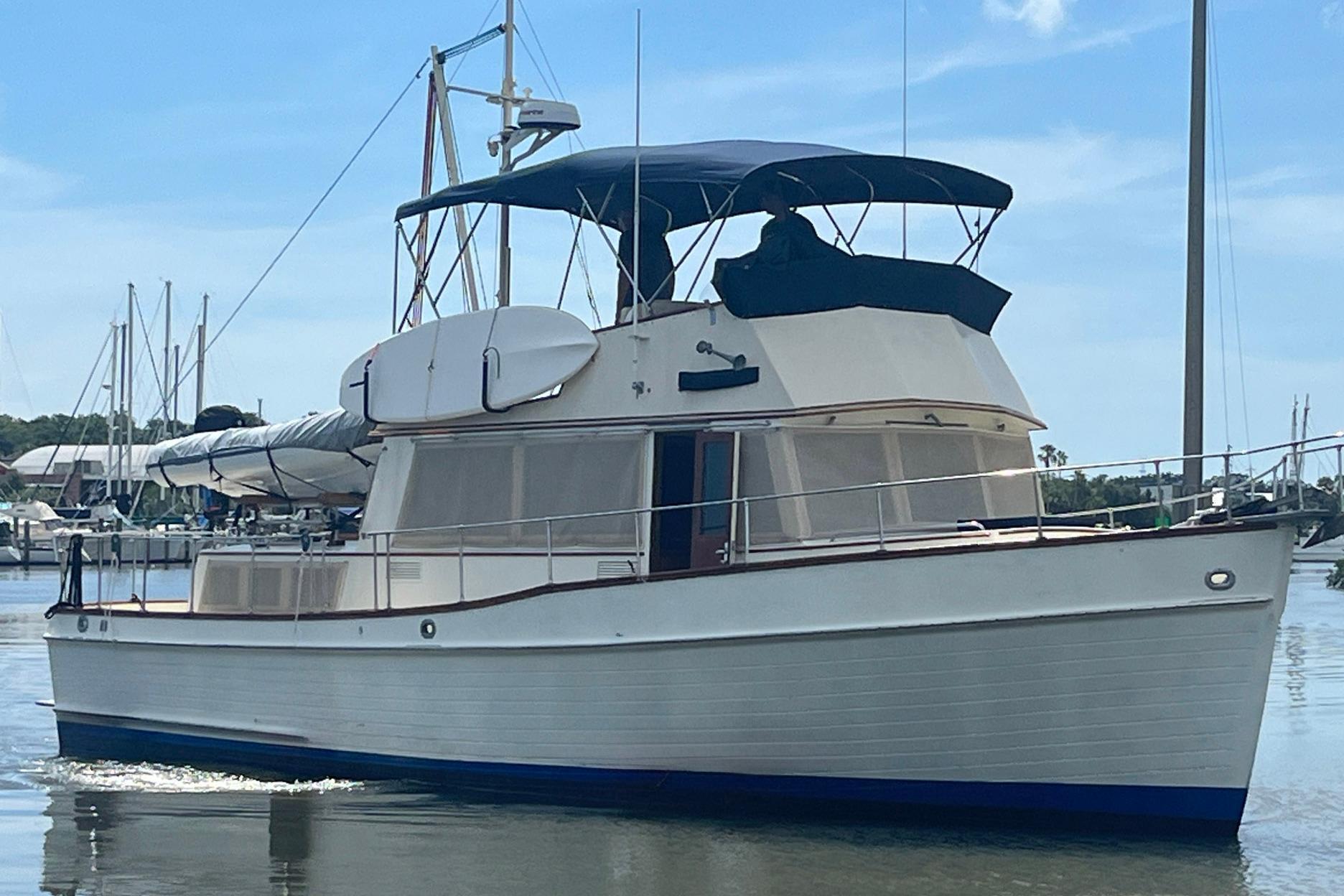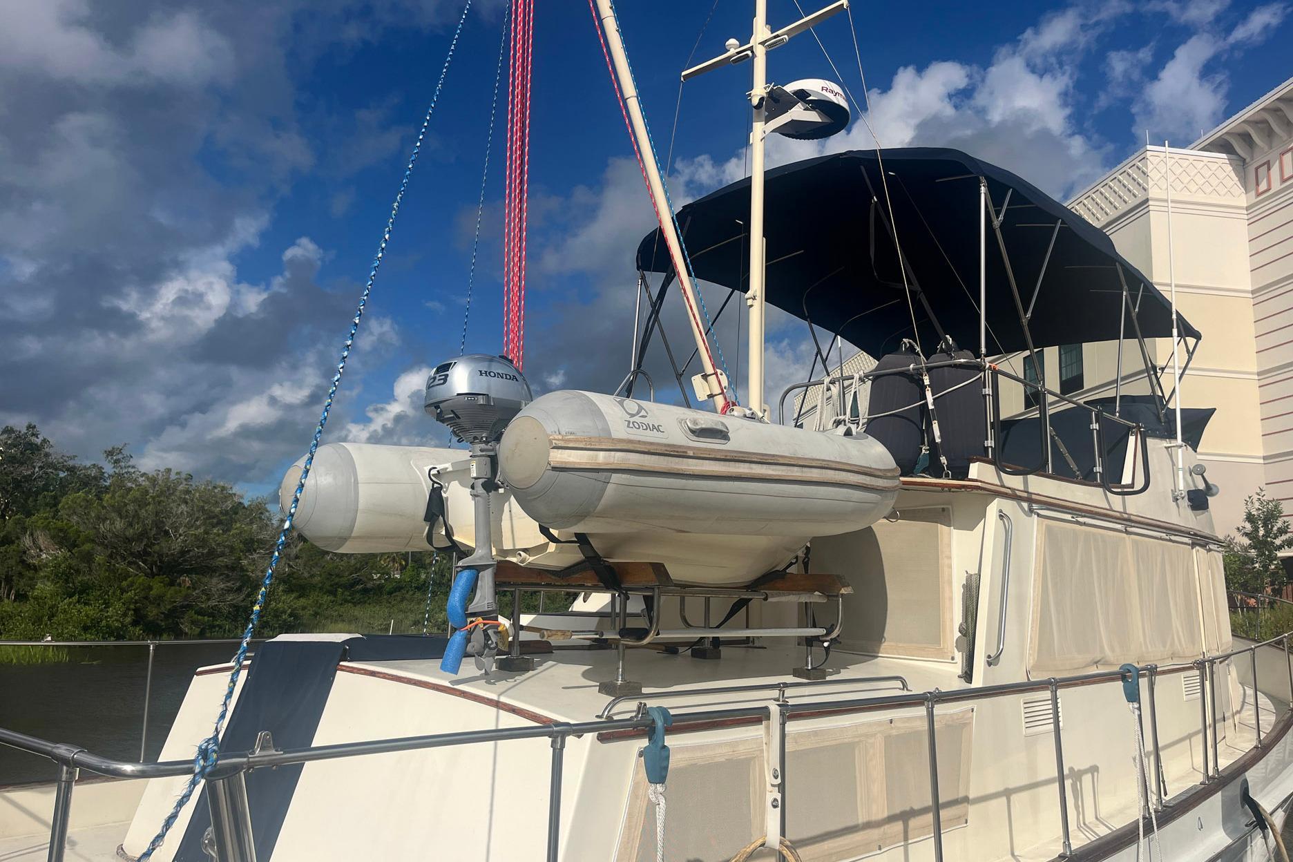 Chosen Sun is a clean, well-maintained Grand Banks 42 Classic trawler. She offers efficient fuel-sipping twin Ford Lehman 120 hp engines. The fold-down mast allows an attainable height of 16 ft. 2 in., which makes this grand lady an excellent option for America’s Great Loop as well as offshore or intercoastal cruising. She has a spacious interior, great storage, and the teak fit and finish one expects from a Grand Banks yacht of this vintage. With a two-stateroom and two-head layout, she suits both guests and cruising families.The sellers have cruised her on the ICW and off the coast of South Carolina, the Atlantic Coast of Florida and the Florida Keys. Chosen Sun was their first large boat, and they found her easy to handle.2020 ZODIAC 270 TENDER INCLUDED