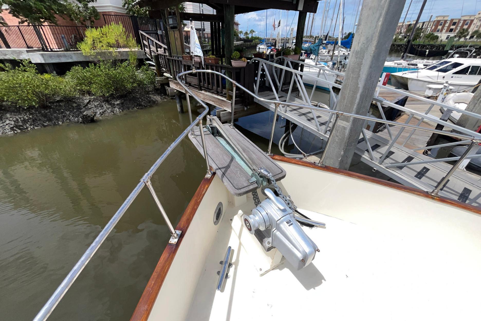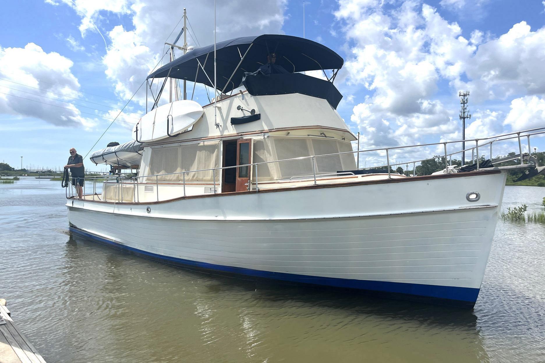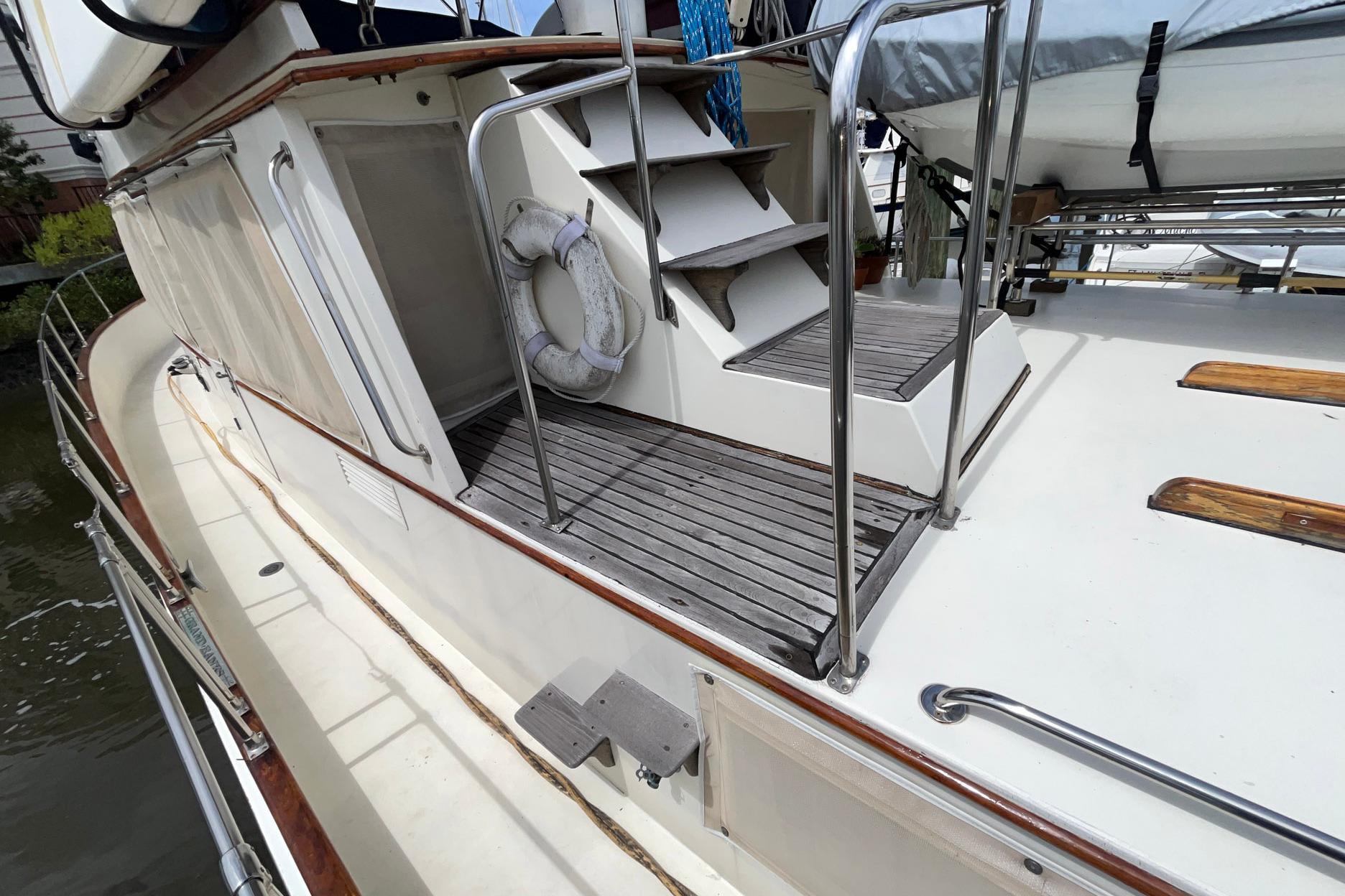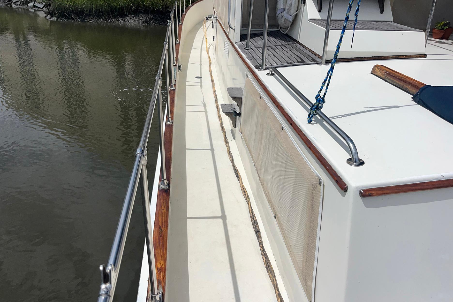 Deck, Flybridge and HullChosen Sun is a “trunk-style” trawler with a full walk-around deck. This aids in maneuverability for line handling. The original teak decks were removed in 1998 and replaced with fiberglass with non-skid paint. The toe-rail is varnished teak. There is no wood on the handrail. The steps leading to the flybridge are natural teak, as is the sole of the flybridge.