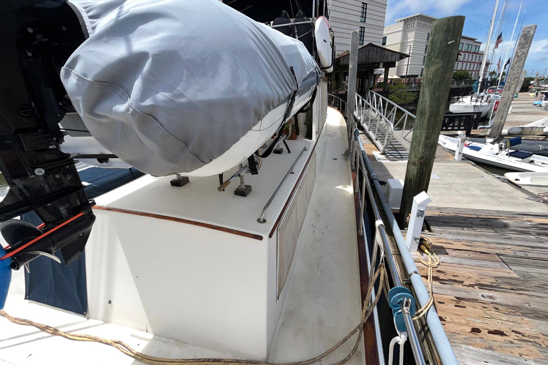The tender is stored on the trunk deck. The mast/tender davit with winch was rebuilt in 2025. The block and tackle were replaced at the same time. The trunk deck also has a hatch with a dark blue Sunbrella cover, which allows access to the master stateroom. There is a storage lazarette in the deck aft. A covered Magma grill is mounted on the aft rail.