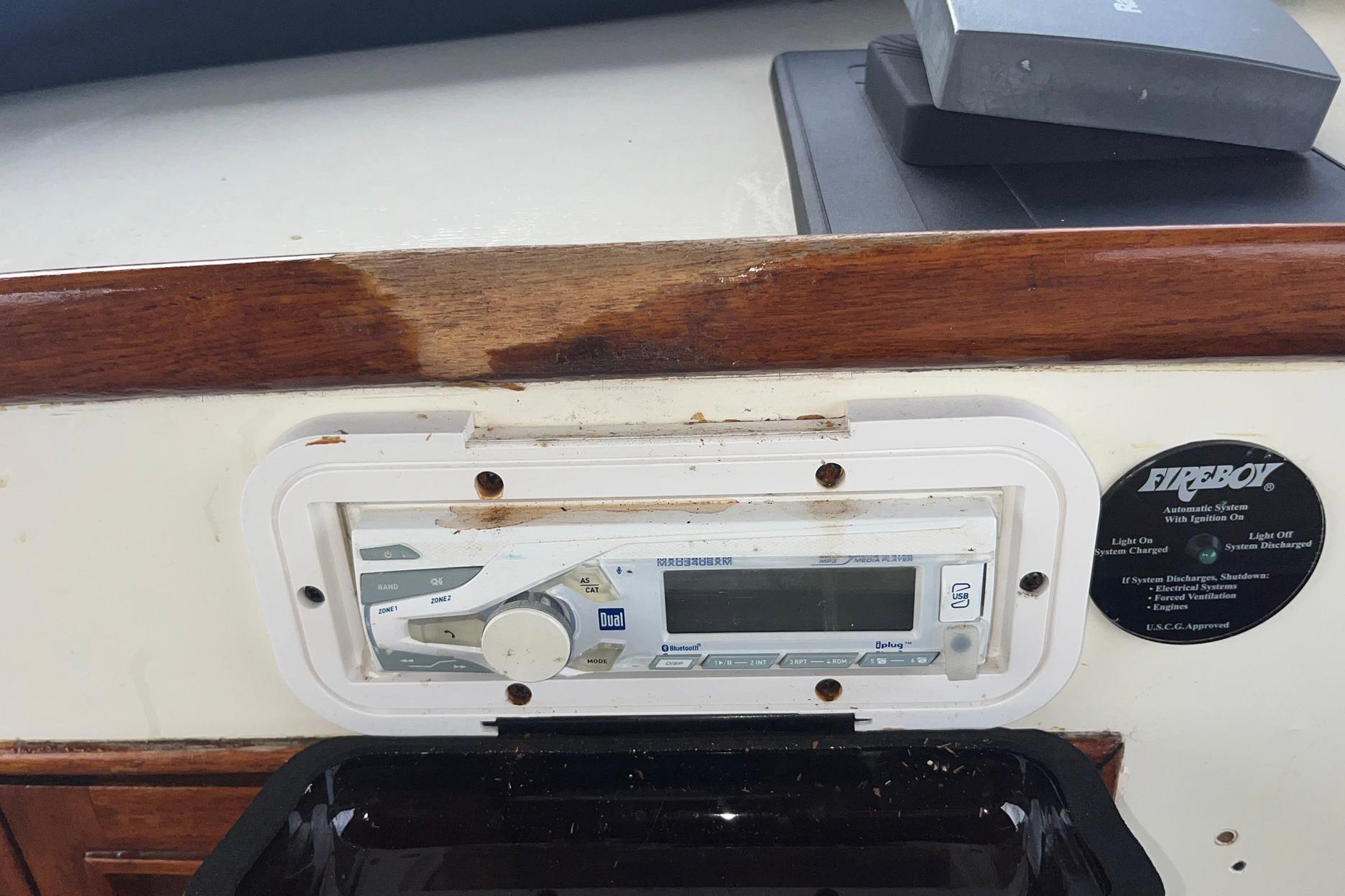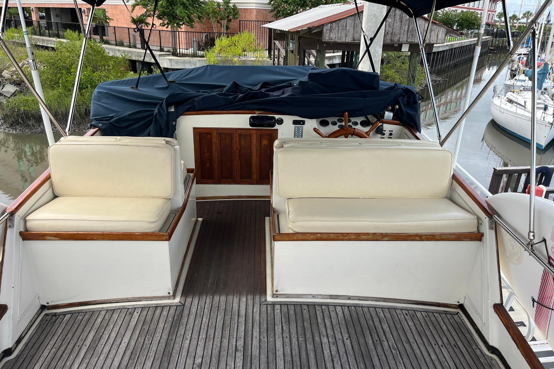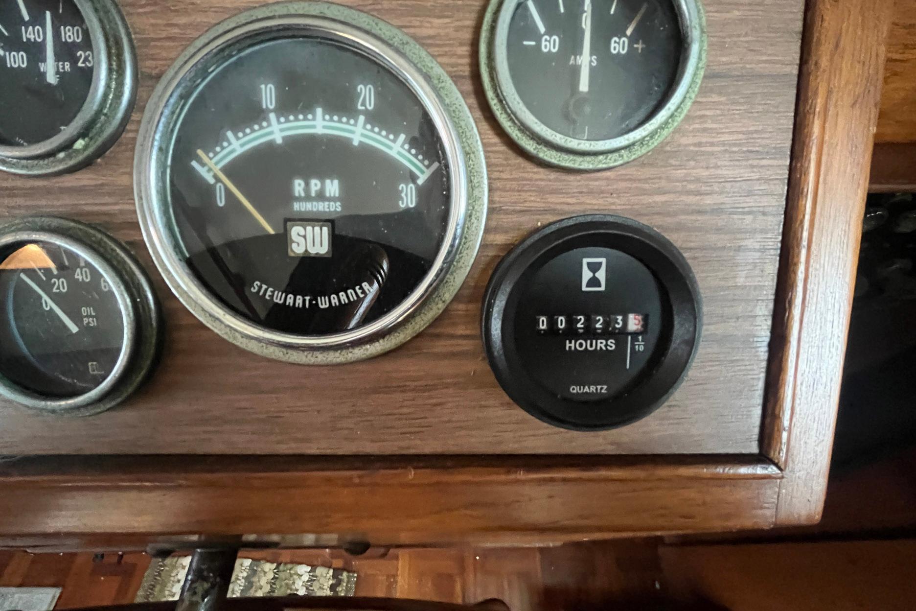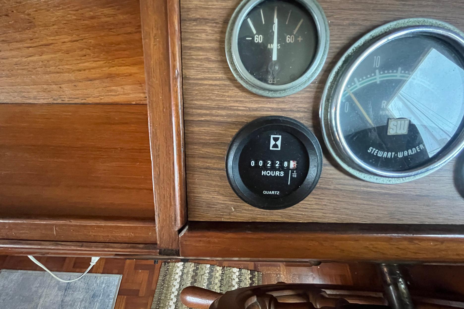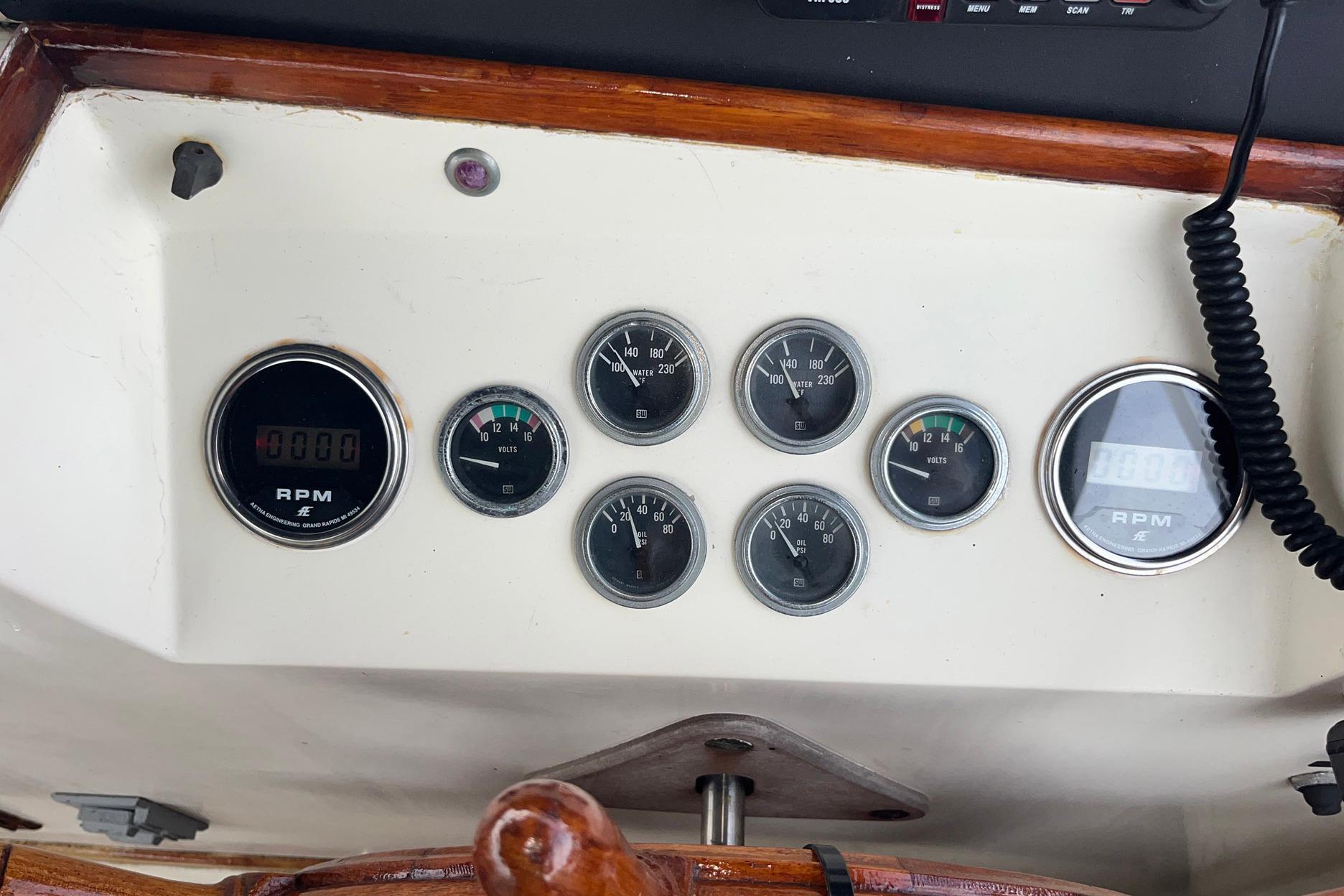 The lower helm station is to starboard. It features a teak ship’s wheel as well as a full complement of gauges, throttles, and electronics. The electrical panel is located below the helm station, to starboard. There is a three-piece windshield; the center window opens for ventilation. The port side window has a crack that has been sealed. A storage area for navigational tools is built into the helm station surface.