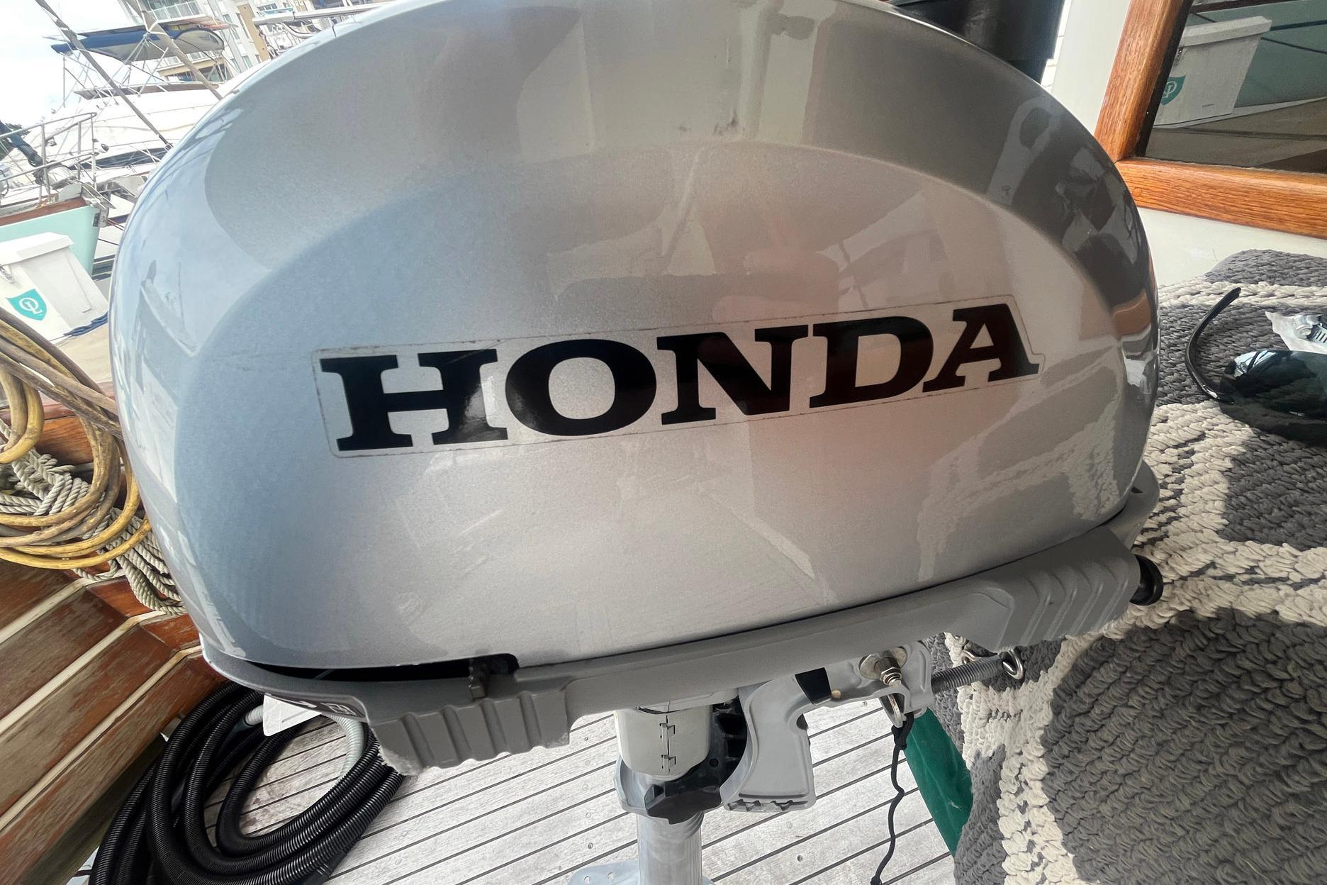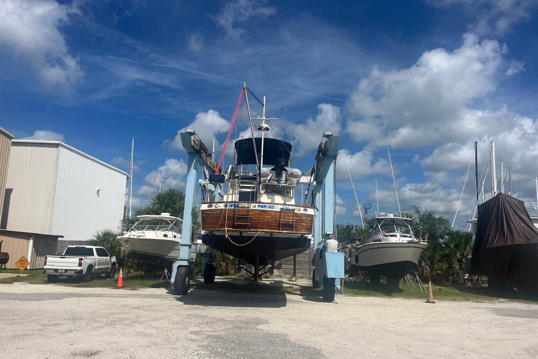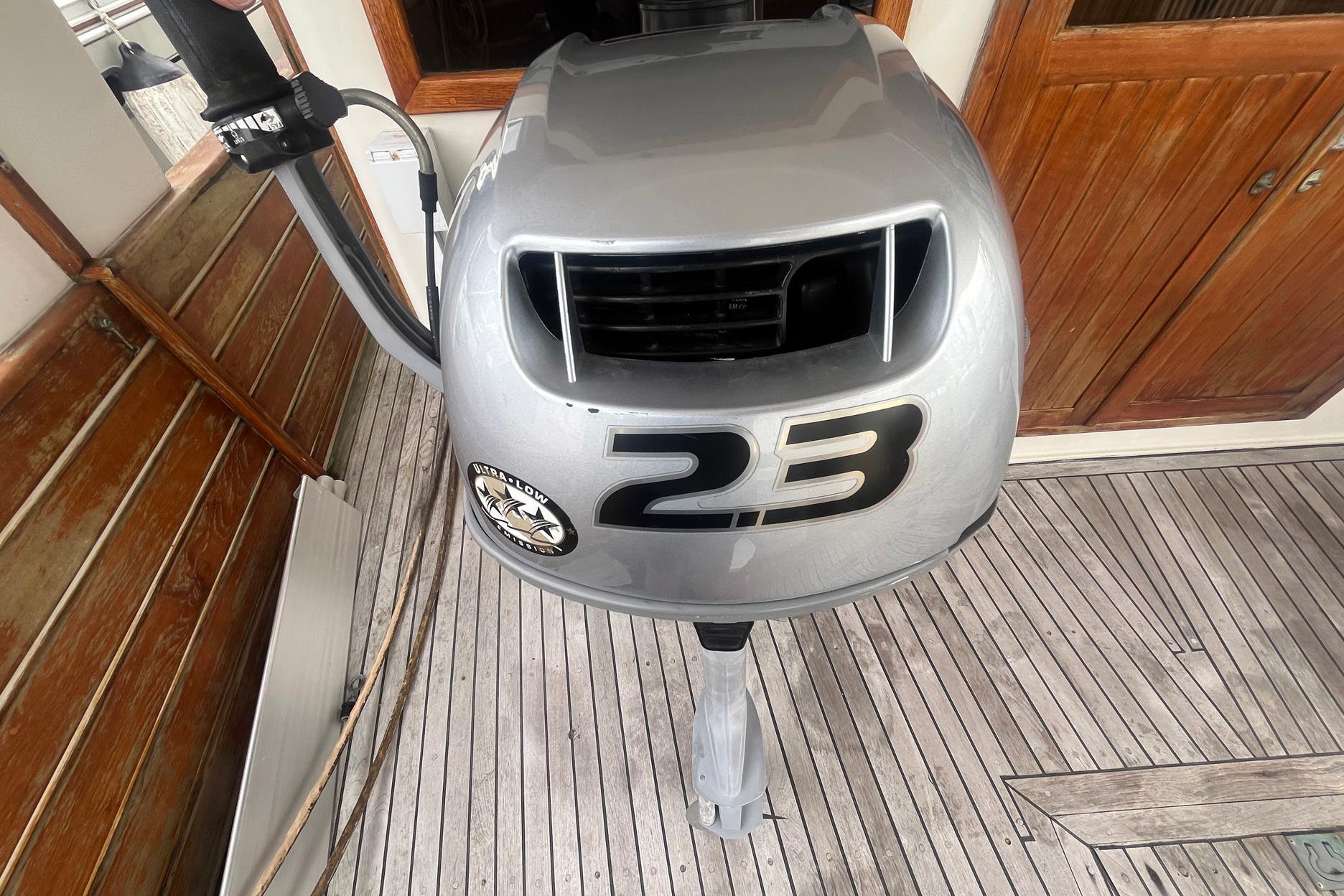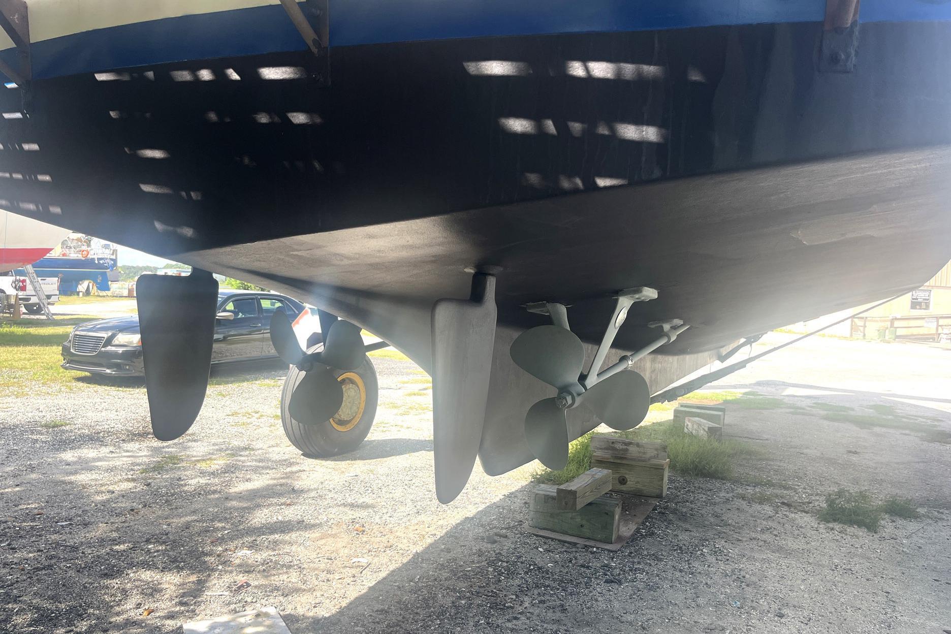The stern is varnished teak, and the swim platform is natural teak and has a swim ladder. The bottom of the hull of Chosen Sun was regularly maintained with monthly cleaning and the replacement of anodes. The vessel was hauled out in August 2025. The bottom was professionally sanded and repainted. A barnacle barrier was also added to the propellers and running gear, and the cutlass bearings were replaced. The propellers are 23 in. 3-Blade on 1 ½ in. stainless shafts. There are spare propellers on board.