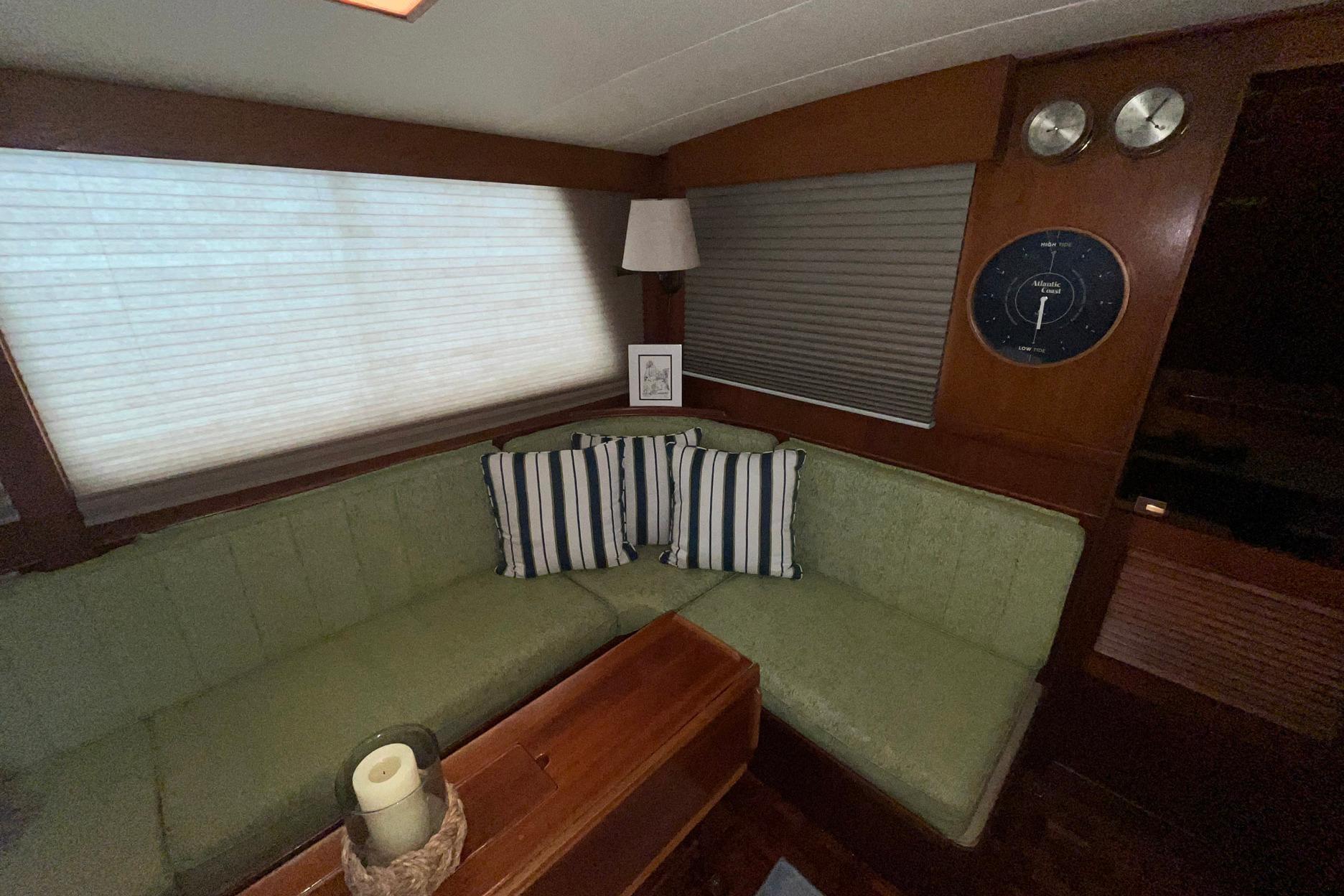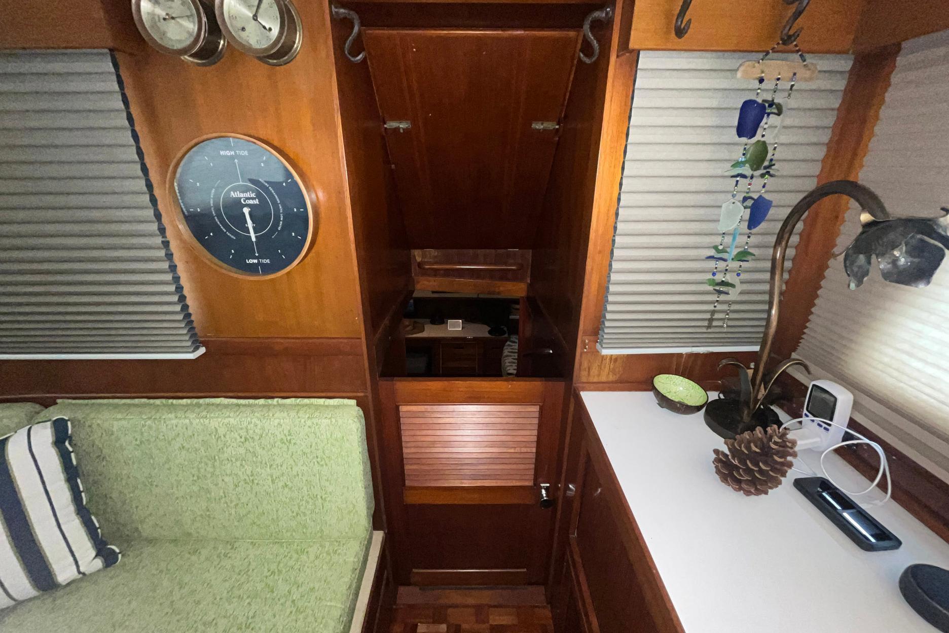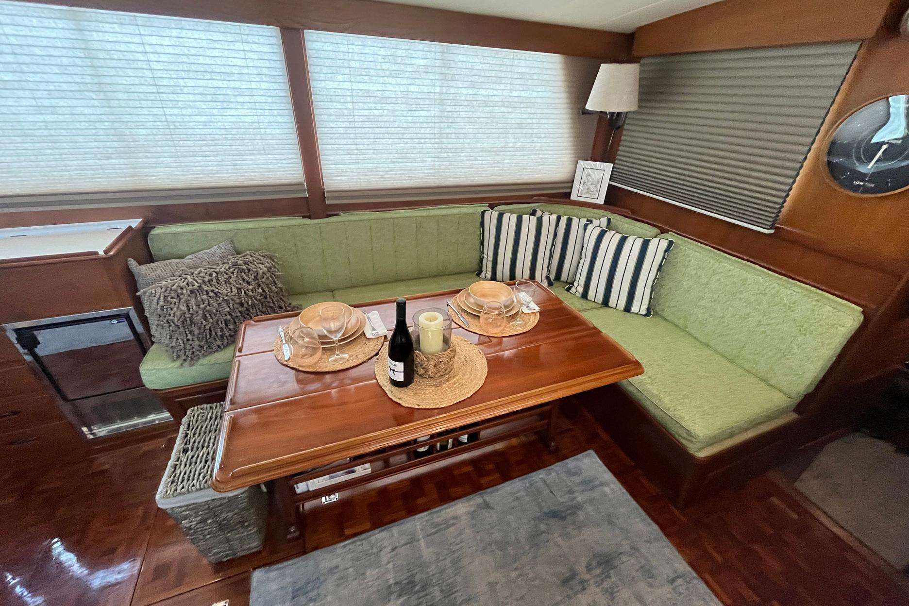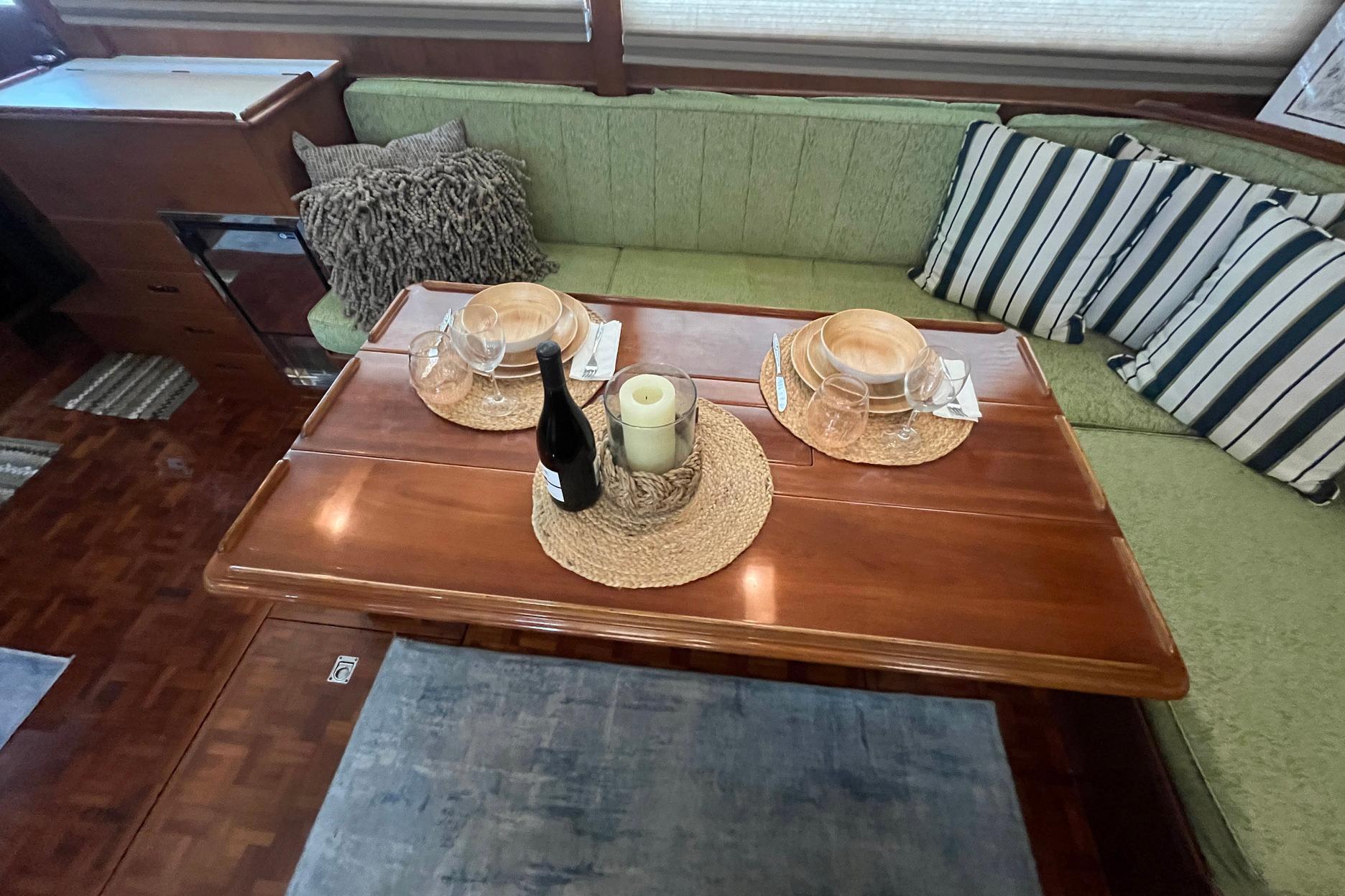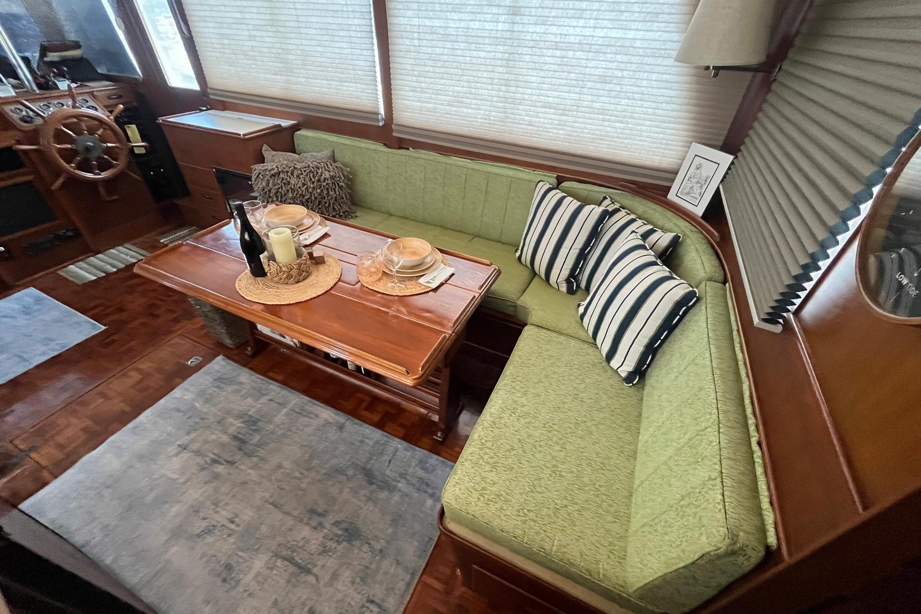The L-Shaped settee, to starboard, is a light green fabric. The cushions and the fabric were all replaced in 2023. There is tremendous storage, as expected of a Grand Banks, under the settee. One of the highlights of the salon on Chosen Sun is the beautiful and versatile drop-leaf dining table. The center of the top opens to reveal storage; there are small hidden drawers on both sides for storage; the base features both bottle storage and magazine/book storage.