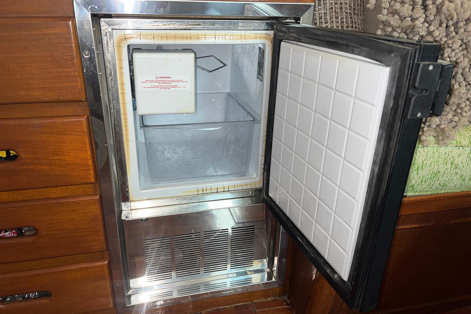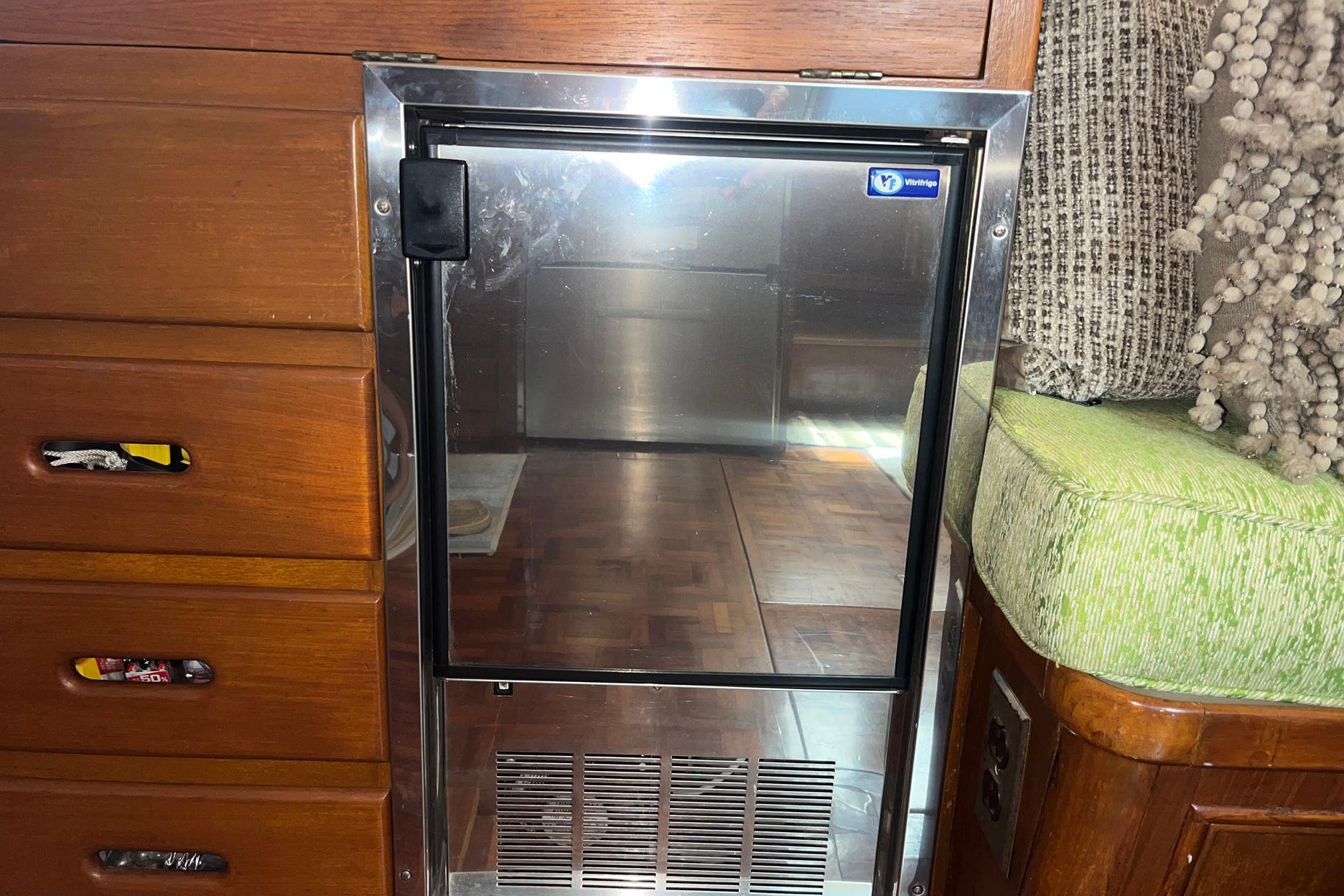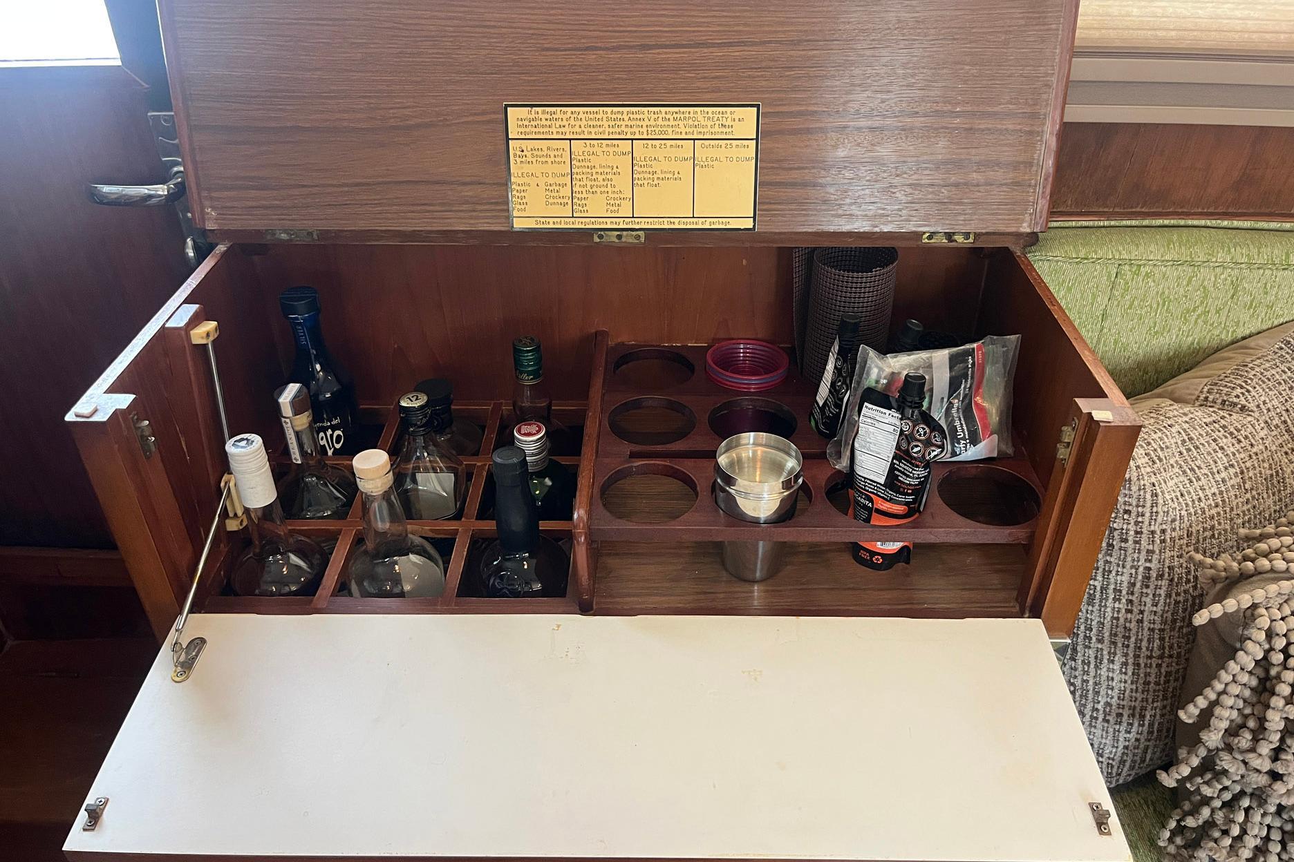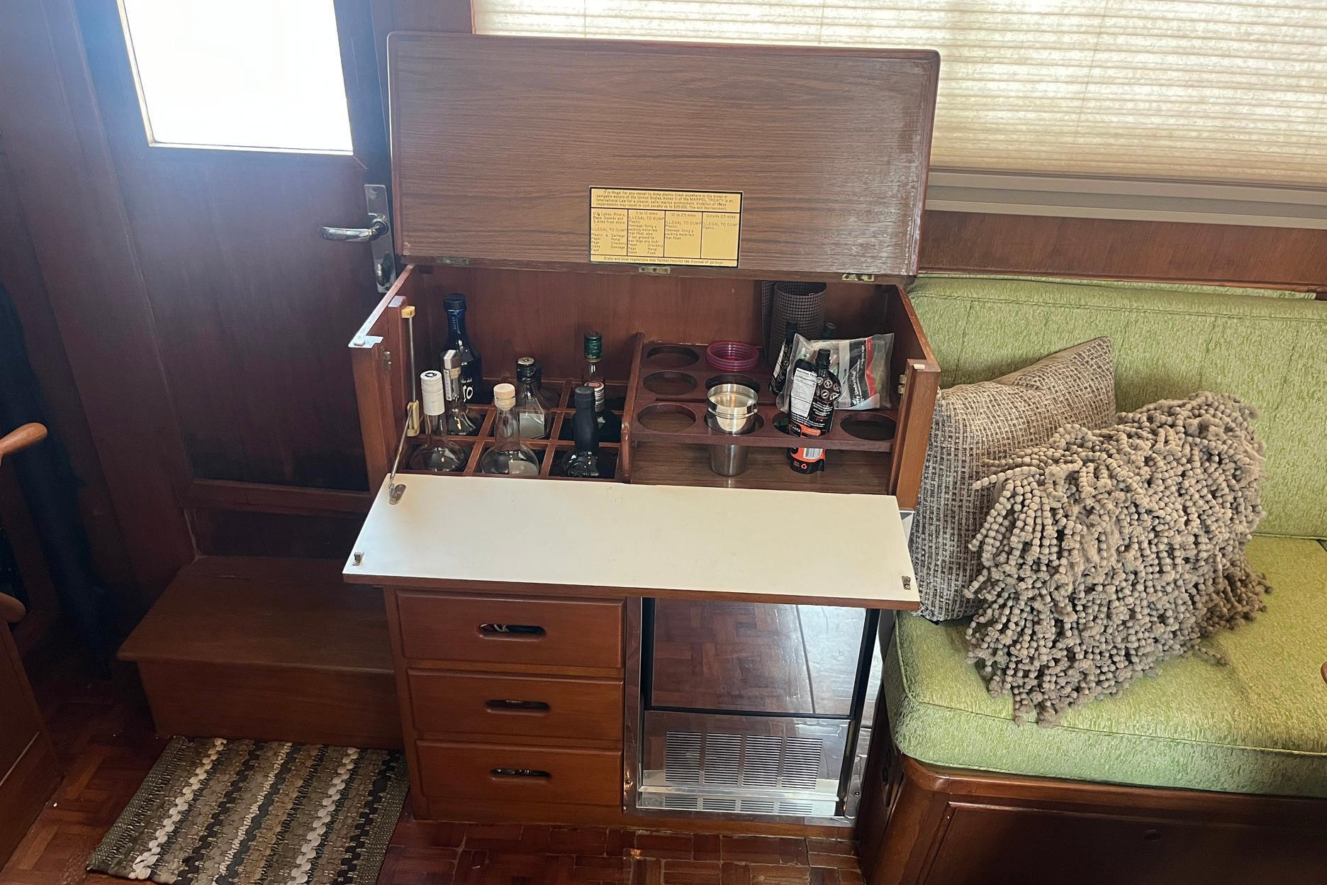 Directly aft of the helm station, to starboard, is the liquor cabinet and ice maker. The liquor cabinet top opens to reveal bottle and glass storage. The cabinet front opens to provide a handy ledge for mixing beverages. A Vitrifrigo ice maker (2020) is below the liquor cabinet, as well as several storage drawers.