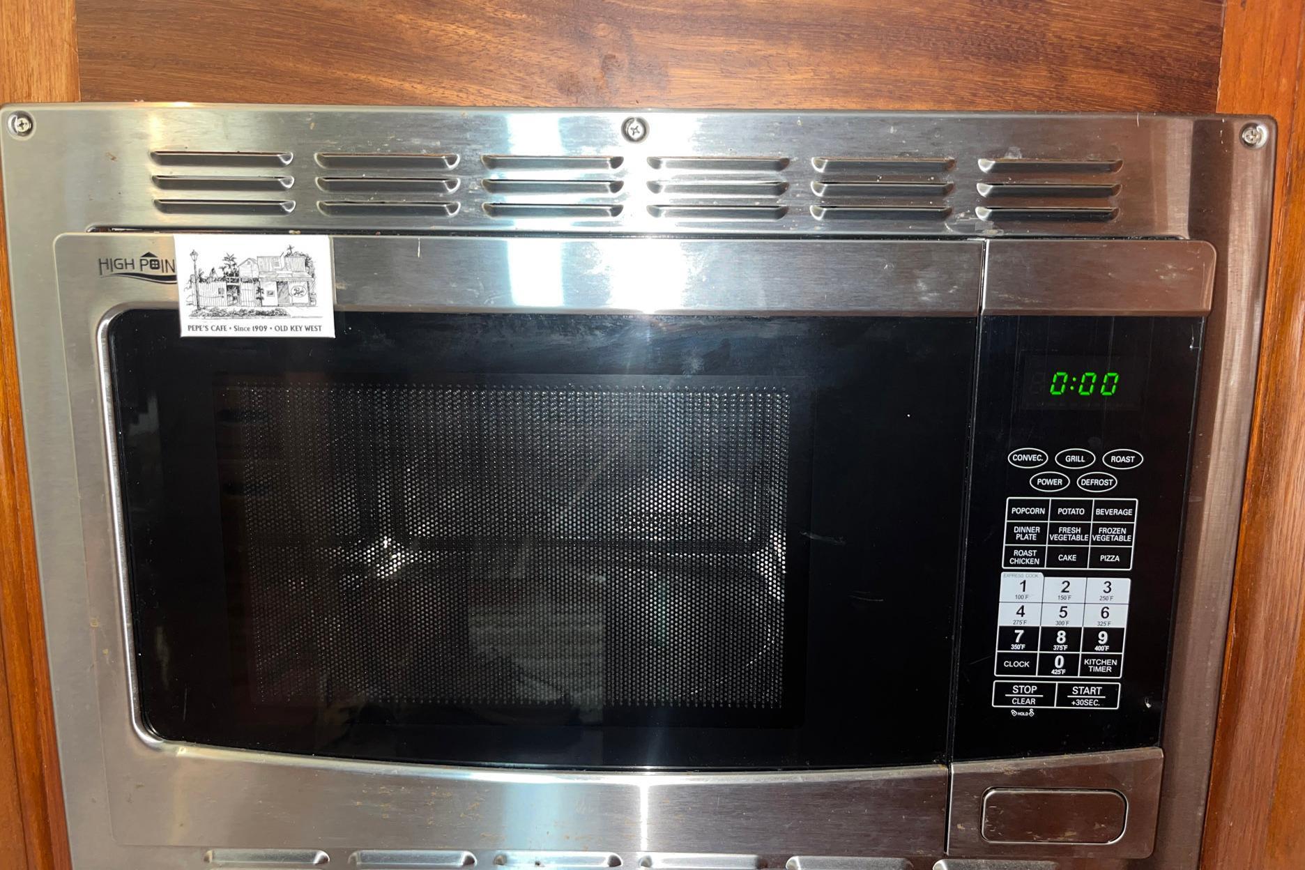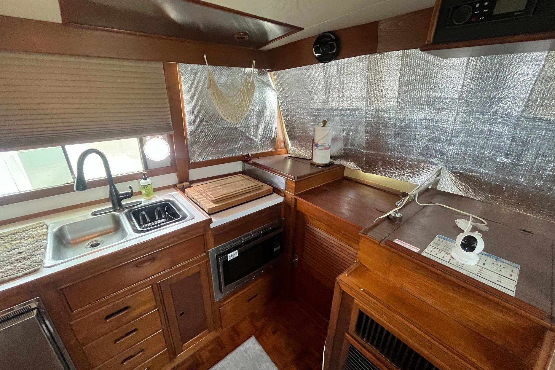 The galley on Chosen Sun is to port, across from the interior helm station. It is equipped with an Empava two-burner electric induction stove, a built-in High Pointe microwave/convection oven, a two-drawer Vitrifrigo refrigerator/freezer, and a double stainless steel sink. The faucet was replaced in 2023. There is storage in multiple cabinets and drawers, including an in-counter cabinet with dividers for dishes.
