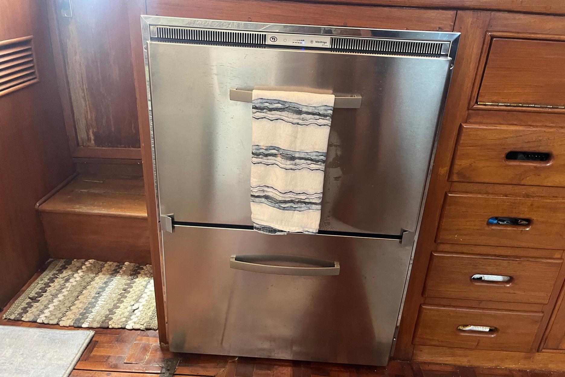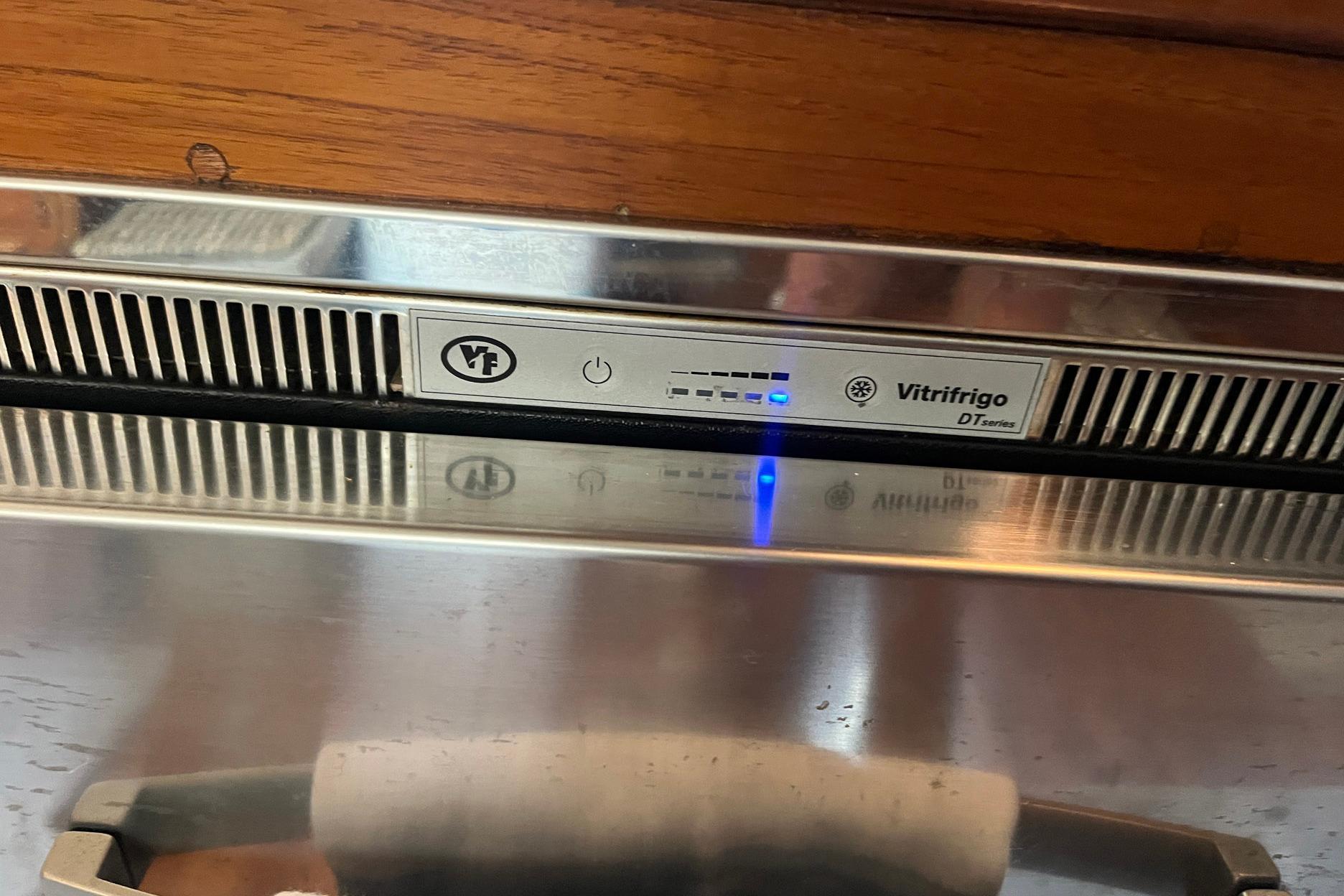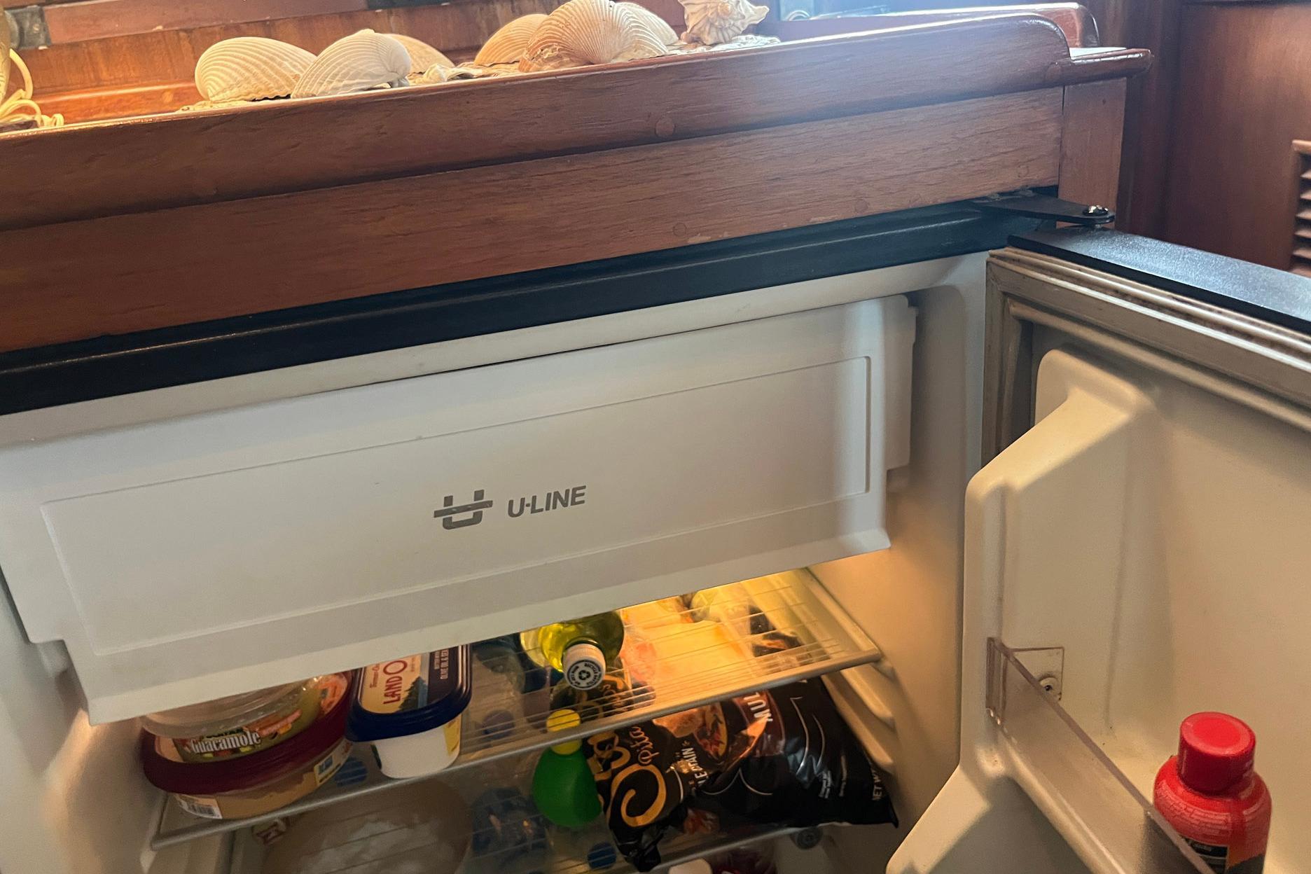 Across from the settee, to port, is a large storage area. There is a full-length strip of electrical outlets, which is handy for the many electronic devices in use today. The counter would make an ideal space for a television, if the new owner wants to add one. A counter-height U-Line refrigerator with a small freezer compartment is located forward in the storage area.