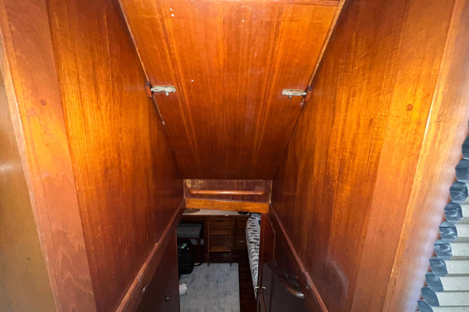 The storage in the master stateroom includes a large hanging locker to port, drawers under both berths, hinged cabinets in the steps, and the drawers in the dresser.