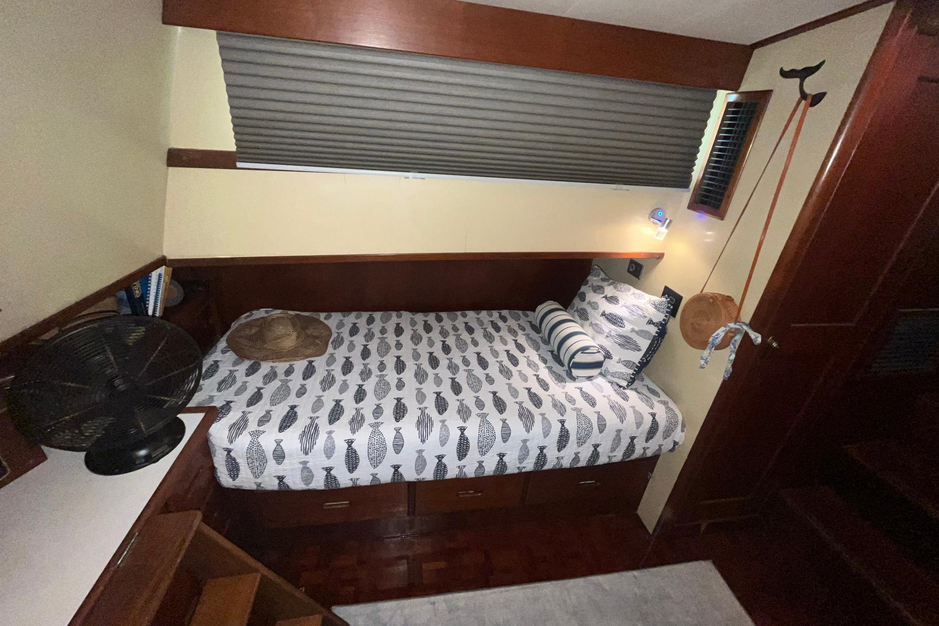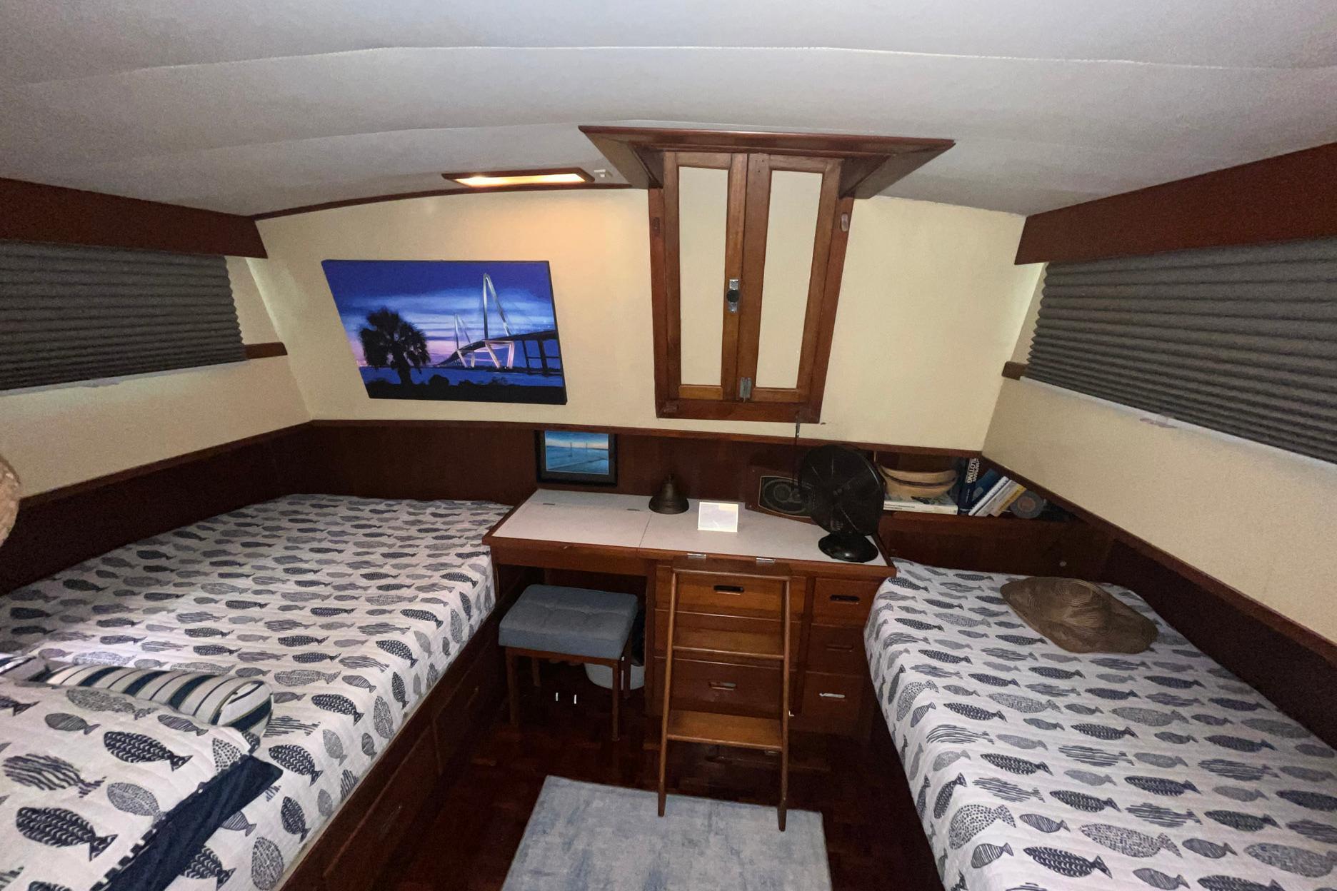 The full-beam, en-suite, master stateroom on Chosen Sun is aft. It is four steps down from the salon and has a privacy hatch/door. The sole is highly glossed teak parquet. The master stateroom can also be accessed from the deck using a hatch and step ladder, which latches out of the way for convenience. A full berth (54 in. x 75 in.) is located to starboard. A single berth (42 in. x 75 in.) is located to port. Both mattresses were replaced in 2023. The berths are separated by a dresser with drawers and a make-up cabinet with a stool. This area would be ideal to use as a workspace if needed.