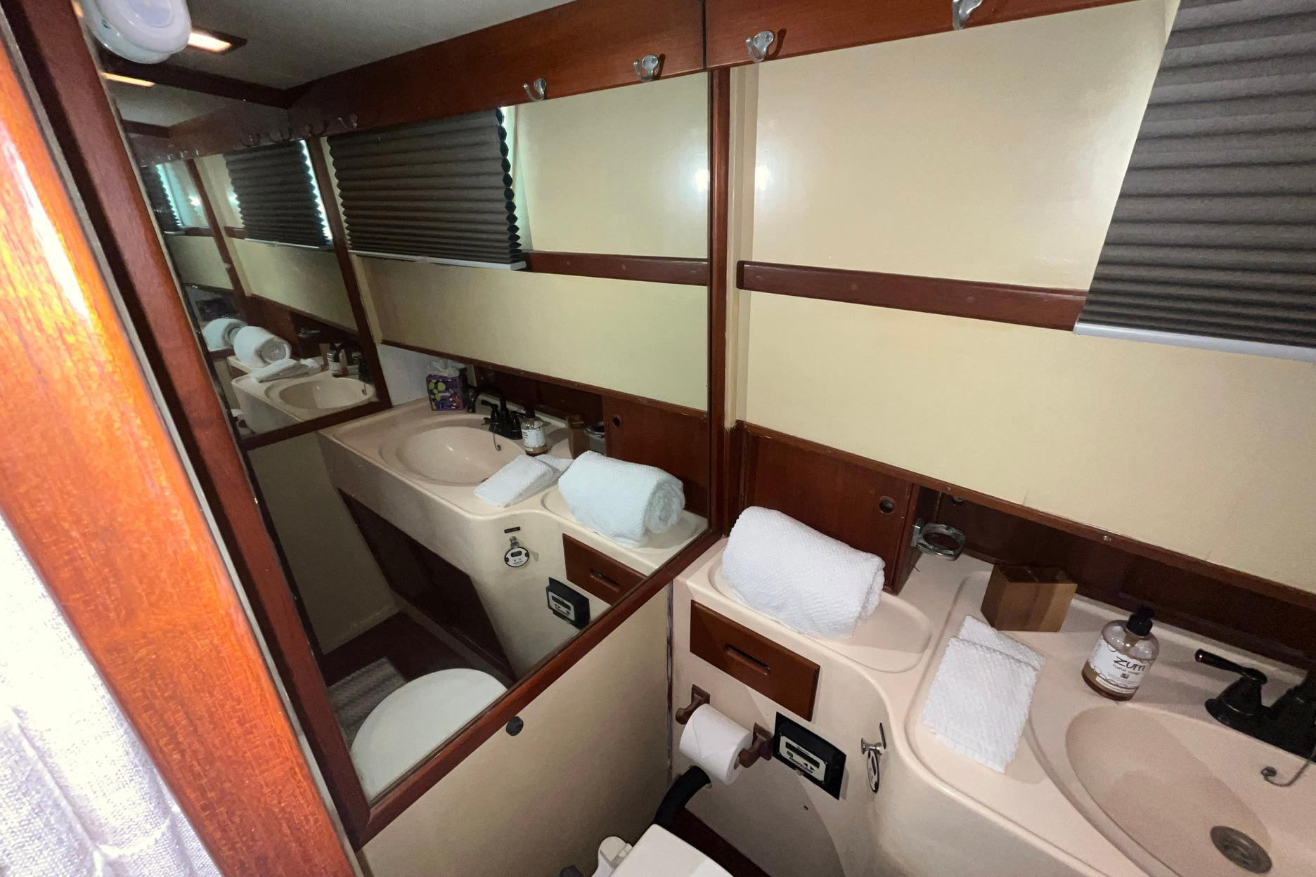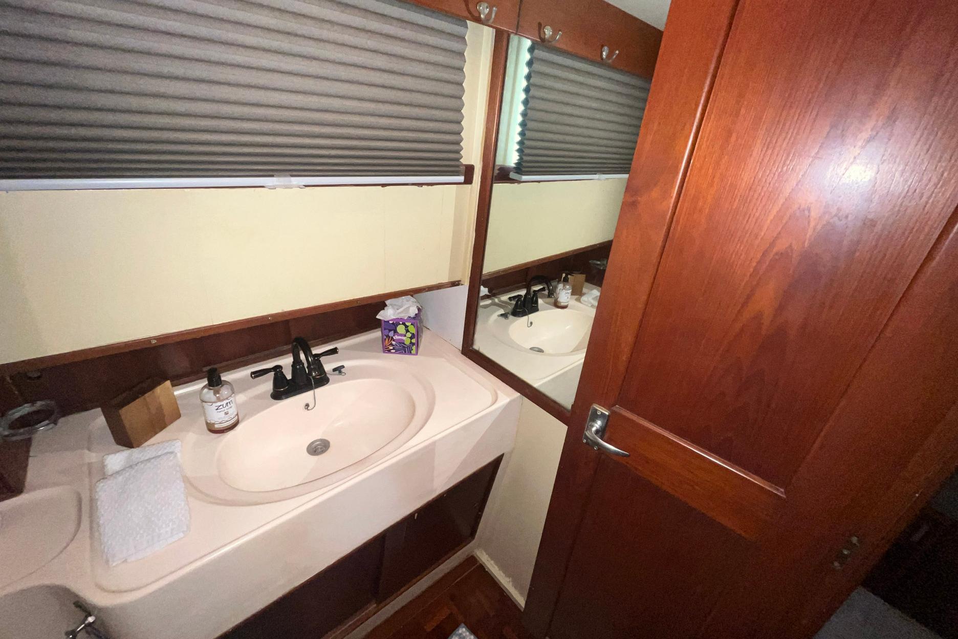 There are room-darkening honeycomb blinds on the windows on both sides of the master stateroom (2023). The reading lights on both berths were replaced in 2024. The master stateroom also features a full-length wall mirror and an en-suite head.