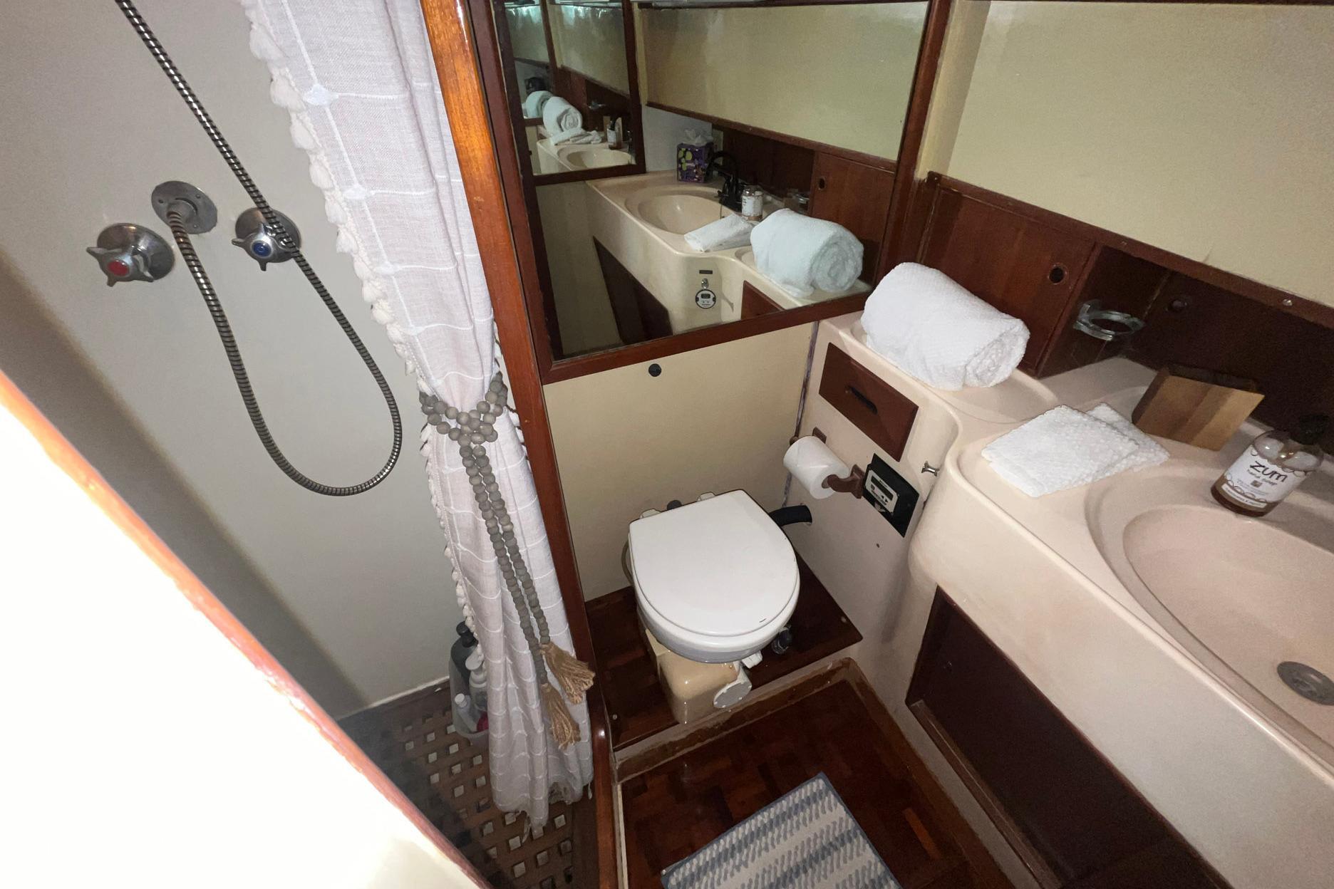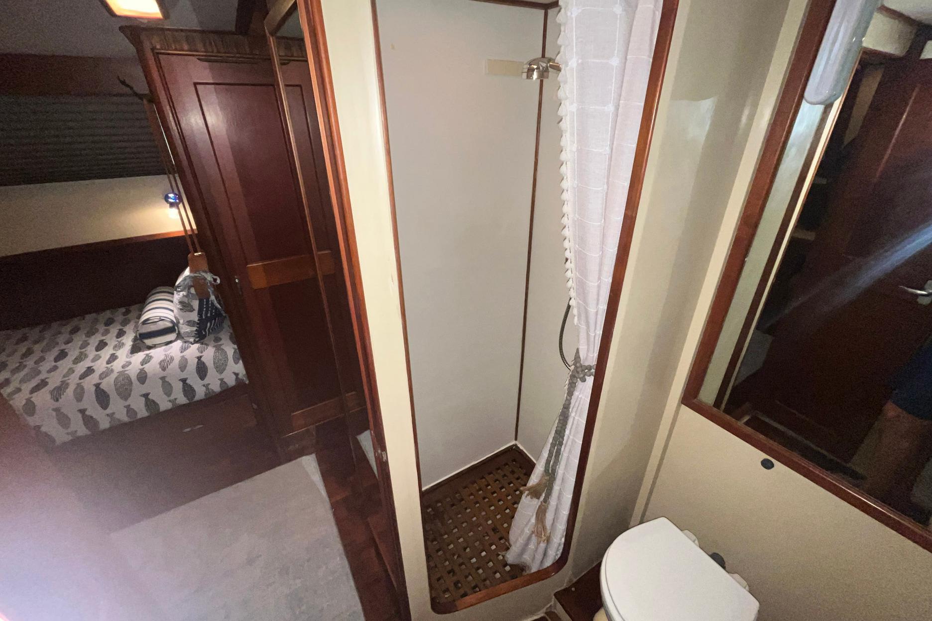 The guest head on Chosen Sun is to starboard in the Guest Stateroom. It has a full door for privacy. The entire sole is a teak grate. There is a shower curtain to separate the shower area. There is a molded counter and sink below a window with a room-darkening honeycomb blind (2023). There is storage both under and over the vanity, and a towel bar mounted on the door. The removable shower head and sink faucet were replaced in 2023. The electric toilet is attached to an Electra Scan system. A wall-mounted mirror is next to the sink. Access to the lower helm station electrical connections is through a cabinet in the bulkhead.