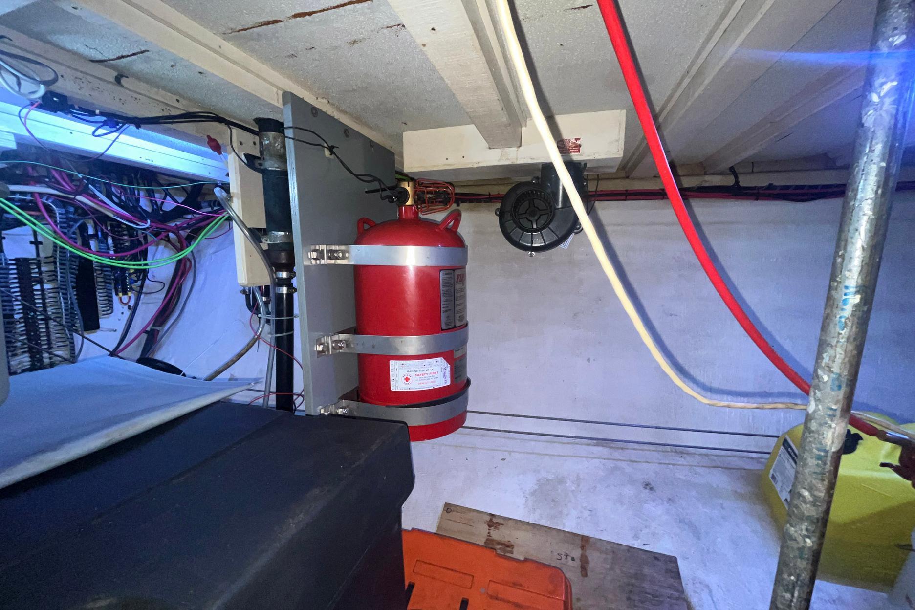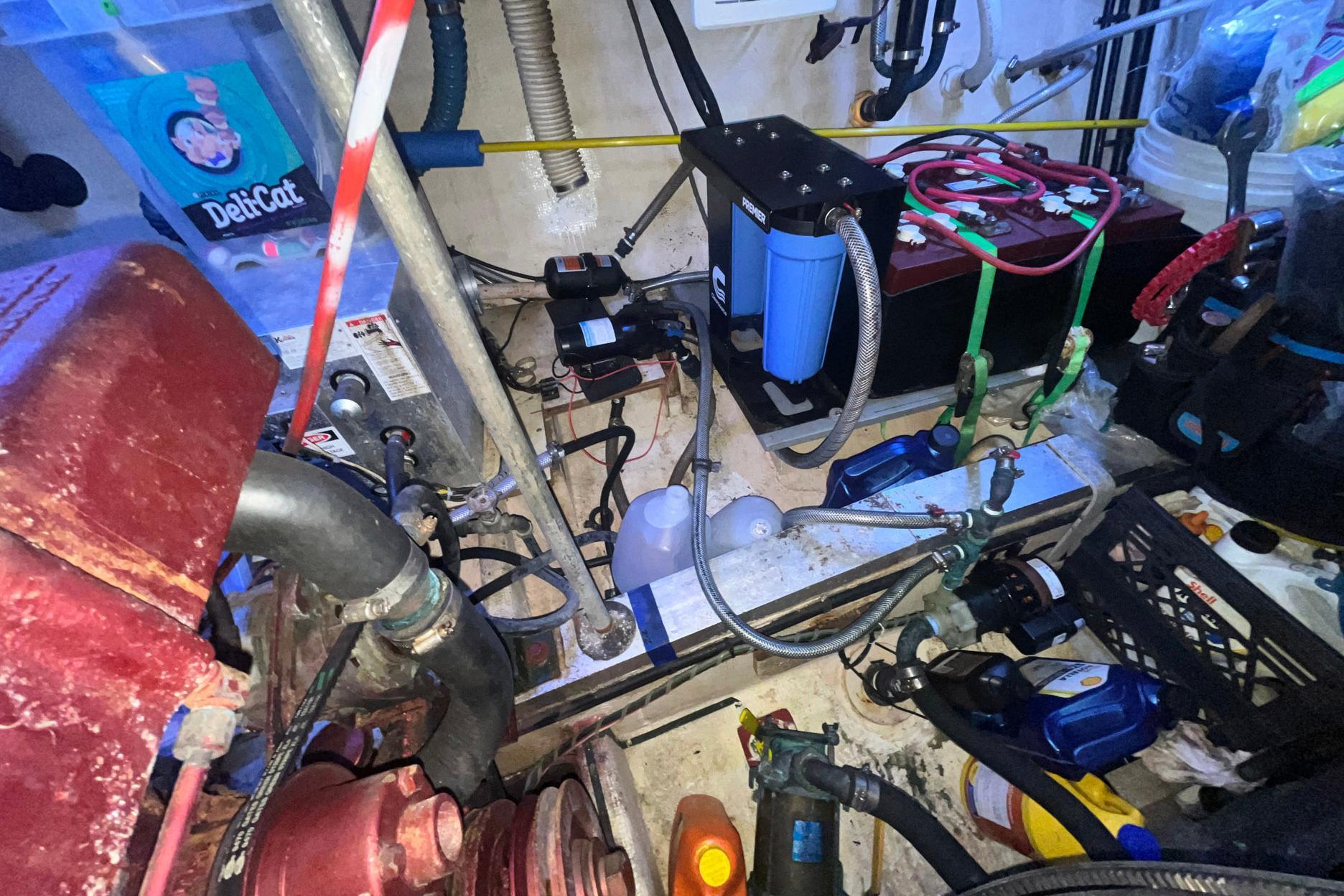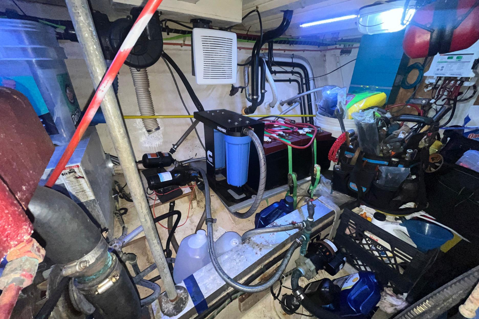 Access to the anchor locker is forward. Access to the forward area of the engine room is under the stairs down from the salon. The en-suite head is to starboard.