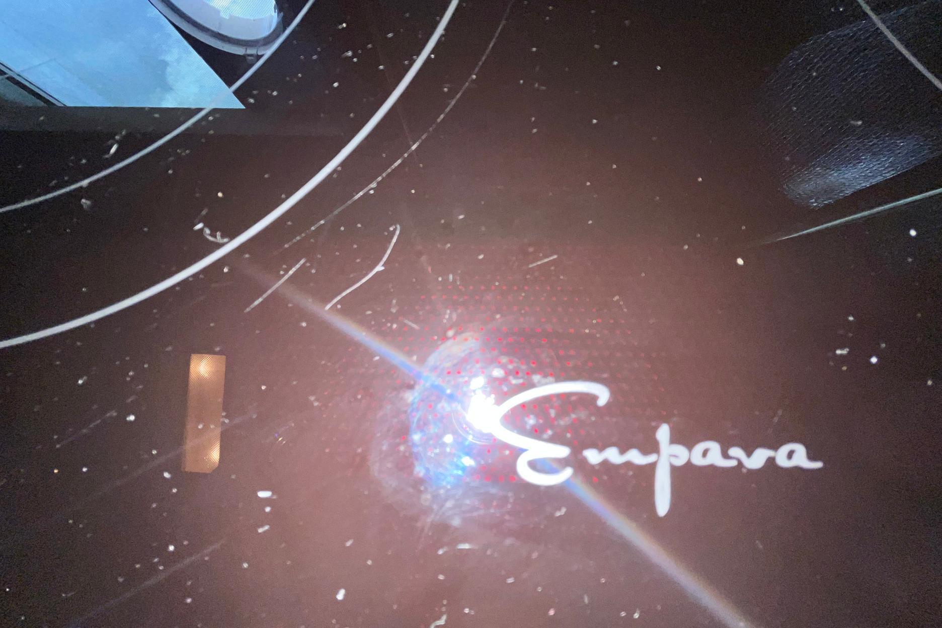 Chosen Sun can be boarded at either the port or starboard handrail gate or via the swim platform ladder. The interior can be entered via either side-deck door. The classic open deck is aft and stores the tender, which is conveyed with the vessel. Steps to port lead from the deck to the flybridge.