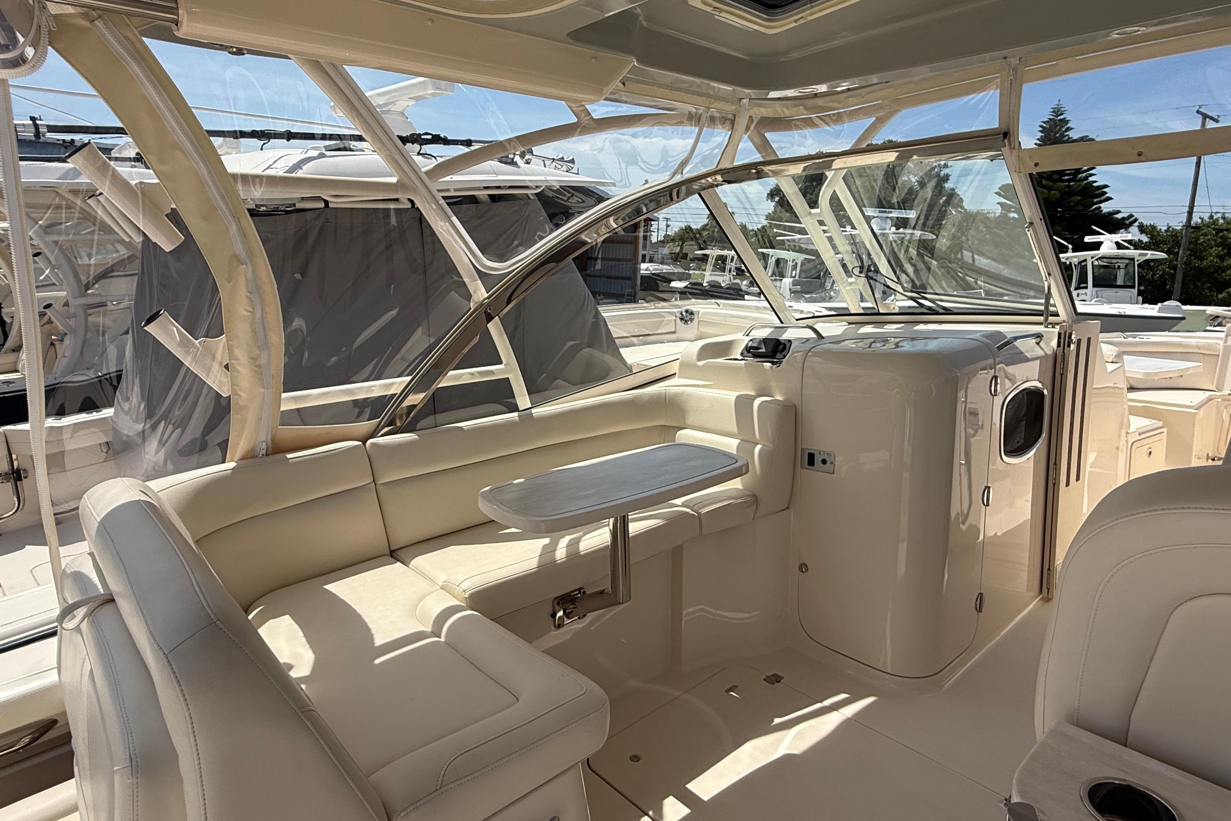 - Wet bar w/refrigerator, sink, storage drawers, trash bin, drink holders (2) & fire extinguisher holder (integrated with electronically operated helm seat)
