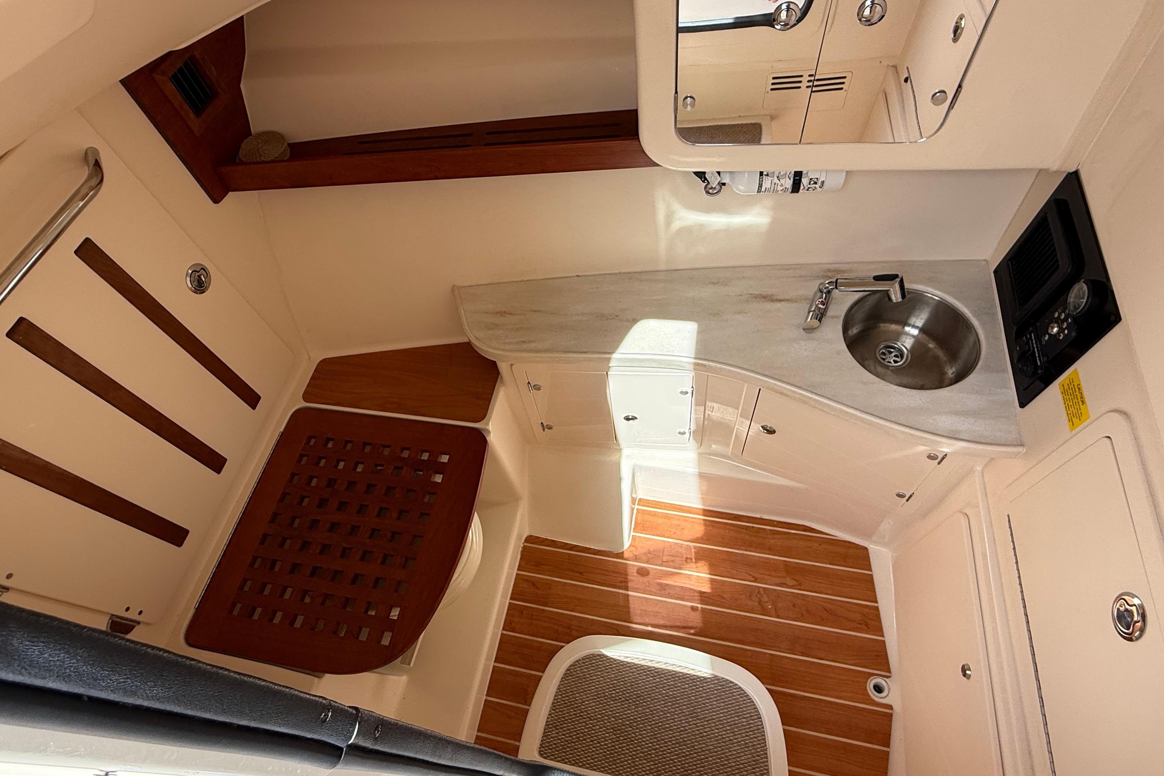 - Starboard console w/shower, sink, drawers, microwave, lighting, bulk storage, fold down seat & VacuFlush® head w/freshwater supply, 10-gallon (38 l) holding tank, overboard discharge & deck pump out