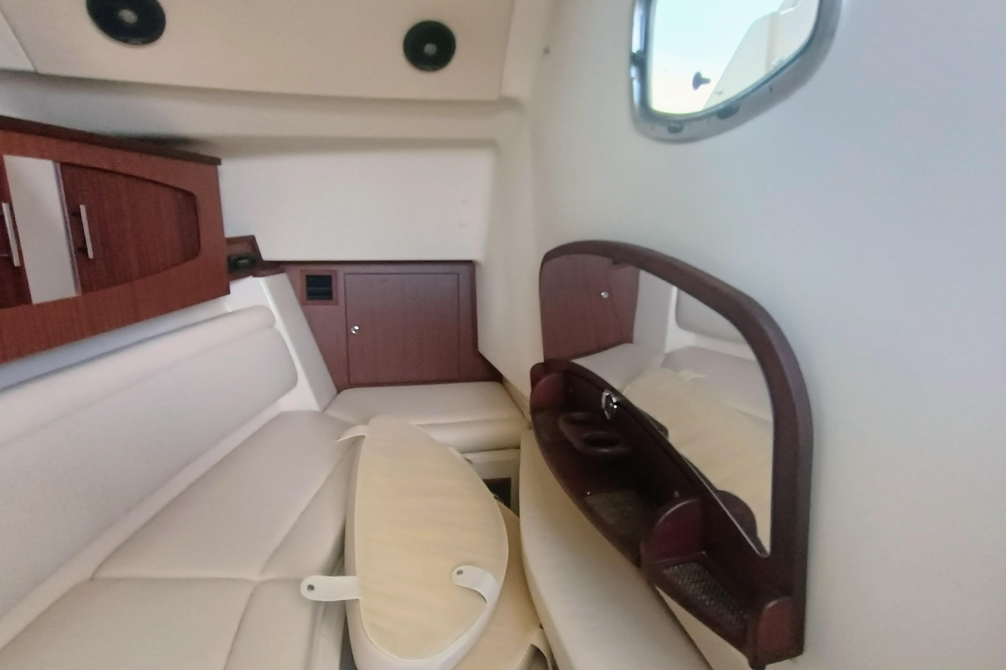 - Starboard console w/shower, sink, drawers, lighting, microwave, bulk storage, mirror w/vanity lighting, fold down seat w/cushion & VacuFlush® head w/freshwater supply, 10-gallon (38 l) holding tank, overboard discharge & deck pump out