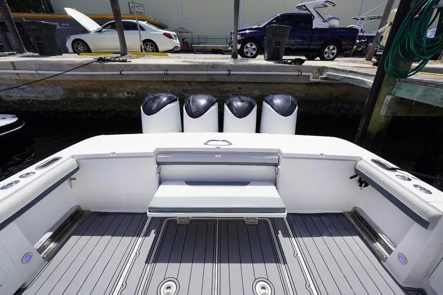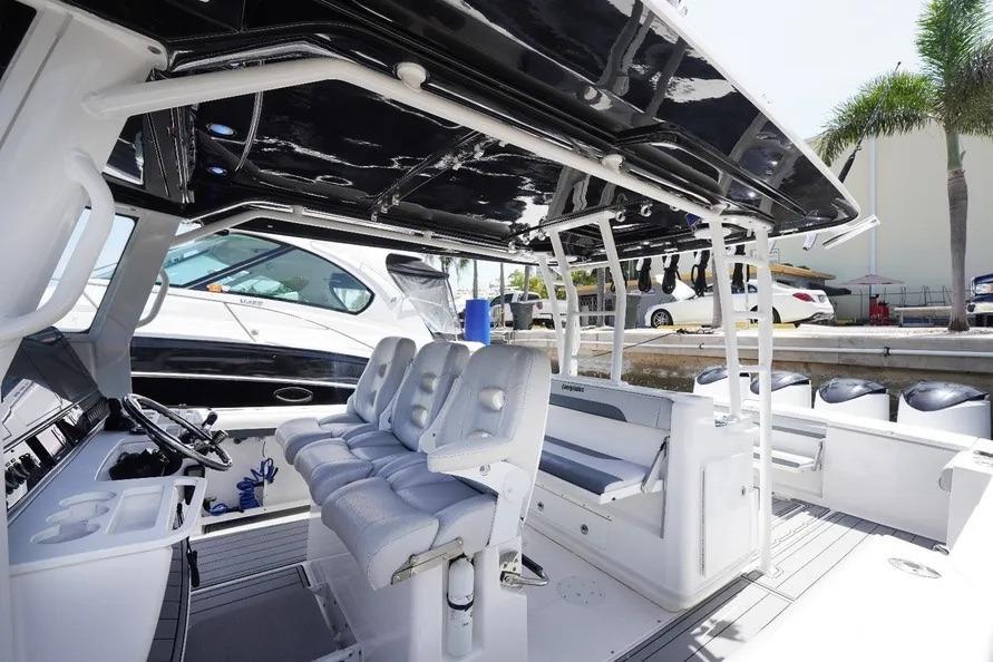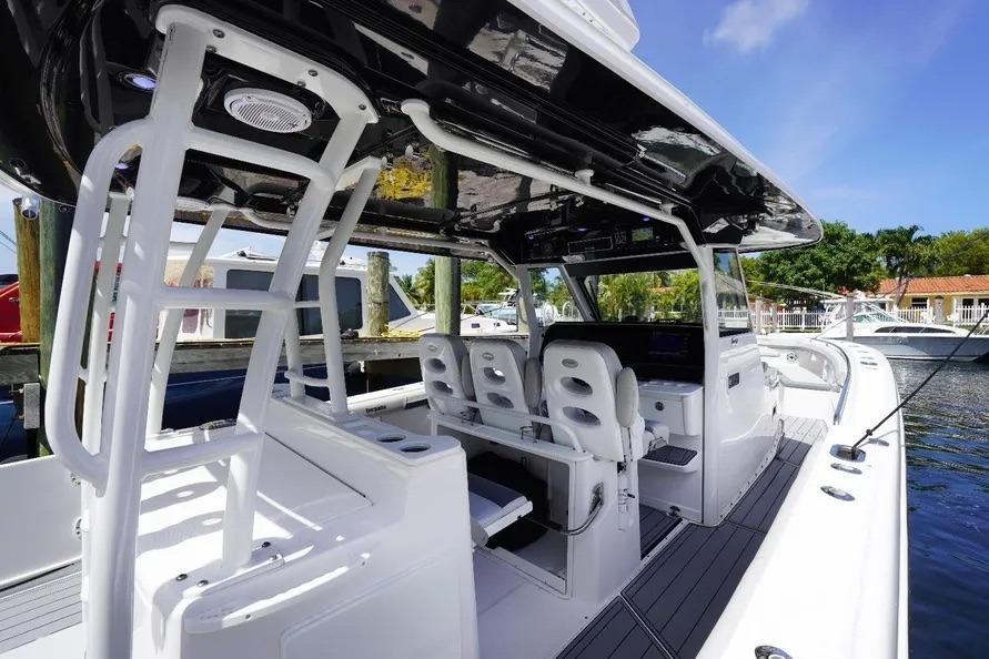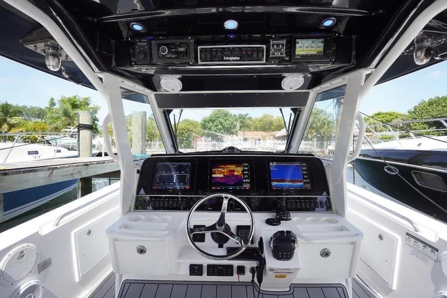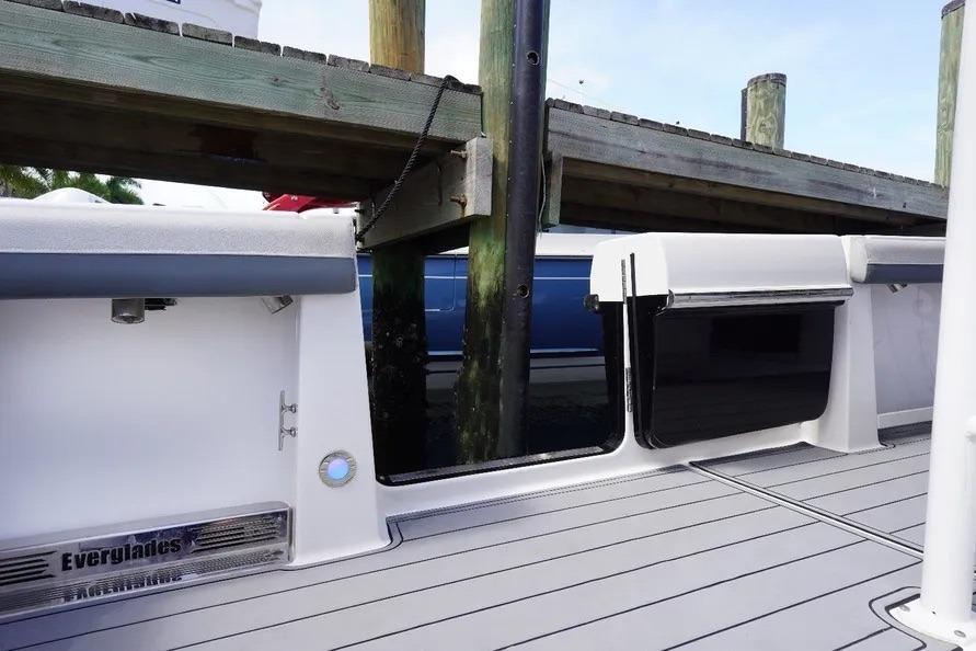 43 ft 2016 Everglades 435 Center ConsoleQuad Yamaha F350 350 hp outboards (1,400 hp total) · 1,082–1,090 hours across engines · Yamaha Helm Master joystickGarmin marine electronics package · Garmin autopilot · radar · FLIR infrared night vision · LED light bar · premium JL Audio stereo · satellite TVLOA 45 ft · Beam 12 ft · Fuel 610 gal · Fresh water 75 gal · Holding 30 gal · Cruising 40 kn · Max 60 kn · hydraulic opening windshield · electric bow table · forward seating · ladder-back helm chairs · side dive door · windlass anchor · outriggers · electric reel outlets · brand-new Odyssey batteries · fresh bottom paint · maintained at Lauderdale Marina—This Everglades 435 CC pairs big-water performance with a fully appointed deck for tournament runs and long family days. Quad Yamaha F350s with Helm Master joystick make close-quarters handling intuitive and carry a fast, dry ride (seller-reported) at speed. A 12-foot beam opens the cockpit for work or play, while forward seating and an electric bow table convert the bow from casting zone to sundown lounge in seconds.At the helm, Garmin navigation with autopilot, radar and FLIR night vision extend confident range day or night, and a JL Audio system with satellite TV sets the soundtrack between spots. Fish-ready details include outriggers, electric reel outlets and a side dive door for quick water access. Service notes are strong—new Odyssey batteries, fresh bottom paint and ongoing care at Lauderdale Marina—so you step aboard with the essentials already handled.Contact us today to arrange your private viewing.