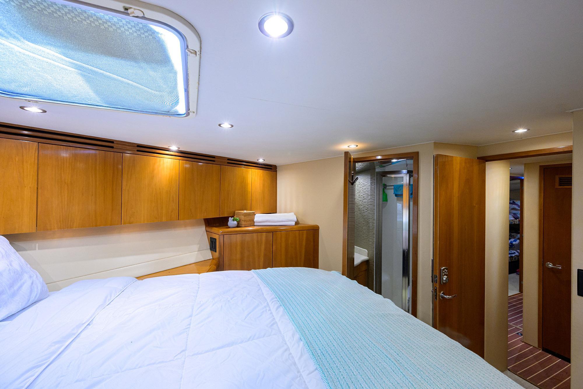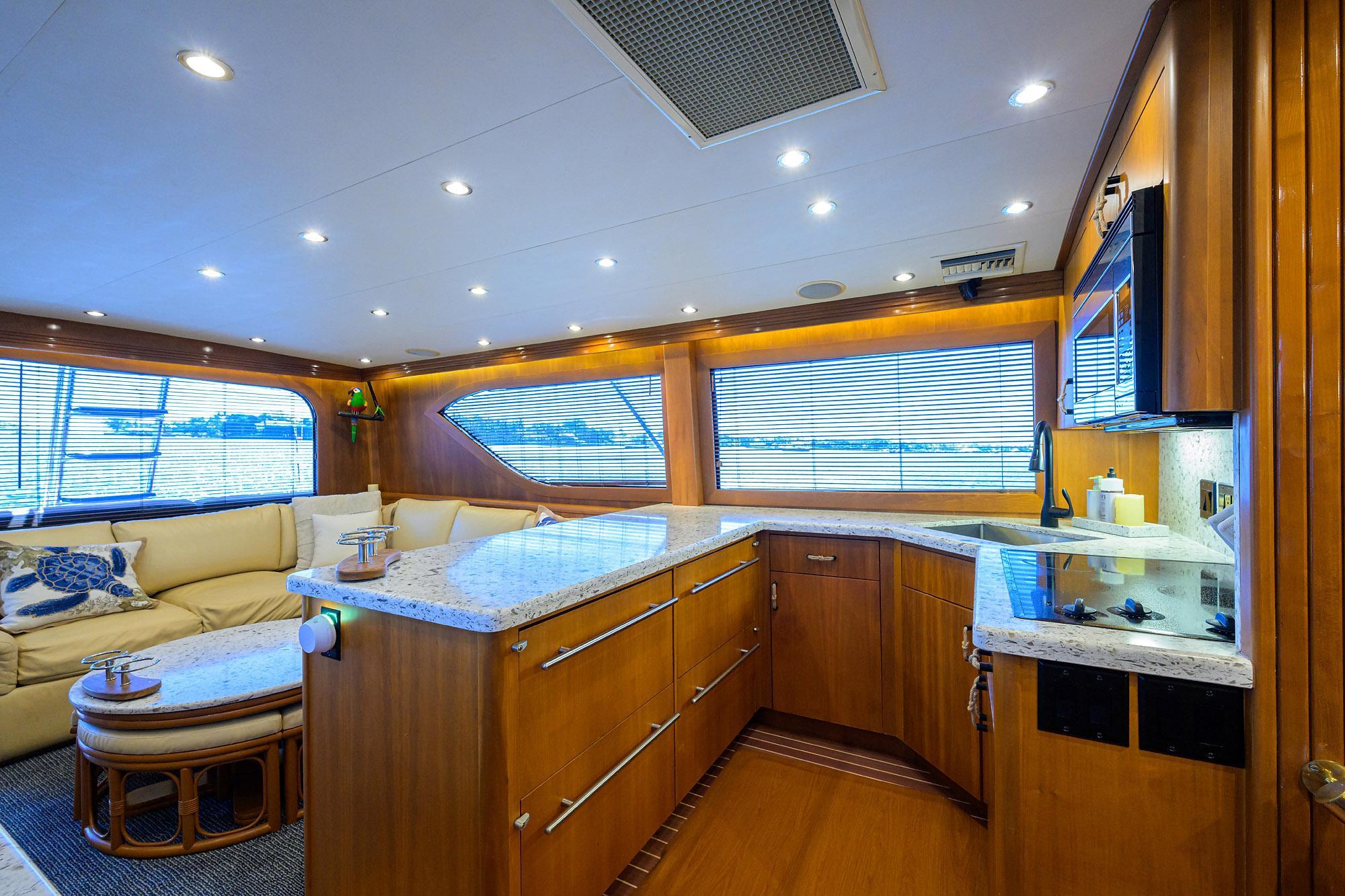 Entering the Salon from the Cockpit, to the Portside you will find a L-shaped sofa with Storage Underneath. A New Cocktail Table with 4 Small Stools. To the Starboard Side there is a 42" Flat screen TV. Forward on the Starboard Side is the Dinette with a 50" Flat screen TV Mounted on the Bulkhead Wall. To Port is the Galley with New Granite Counter Tops with New S/S Sink.