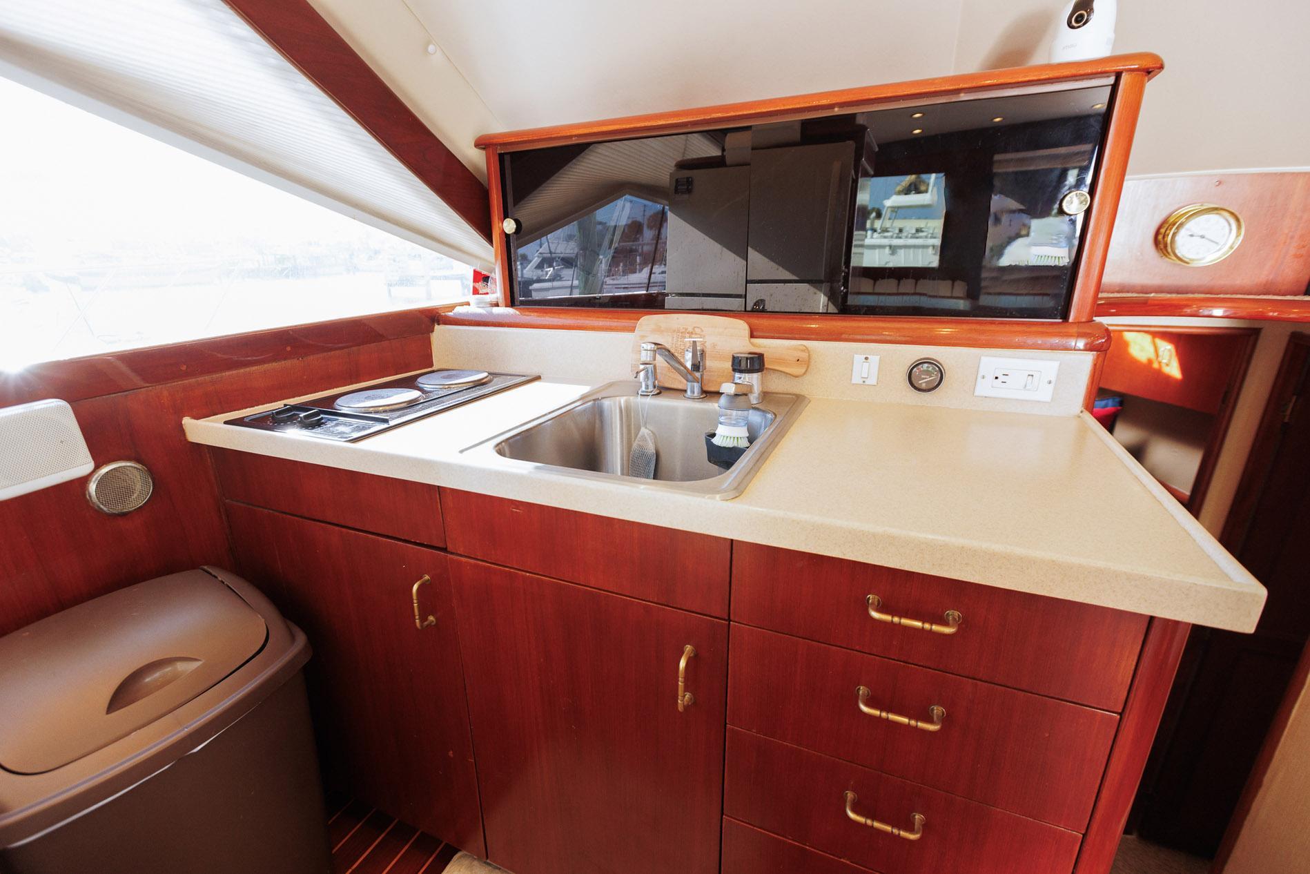 The new custom Ivory upholstery on the L-shaped sofa and cocktail chair is the perfect contrast to the rich wood finish. Dinette is forward to starboard with L-shaped seating, galley is to starboard featuring a full-size refrigerator freezer.