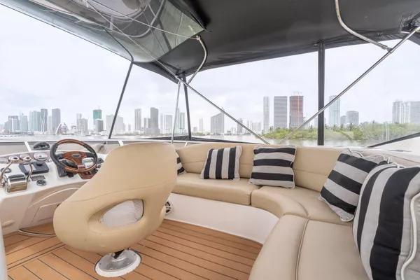 Outdoor spaces are equally impressive. The flybridge and aft deck provide shaded lounges with commanding views, while the new (2025) premium custom decking adds a modern touch. Forward, enjoy the large bow sun pad, and aft, the extended swim platform makes water access a breeze.