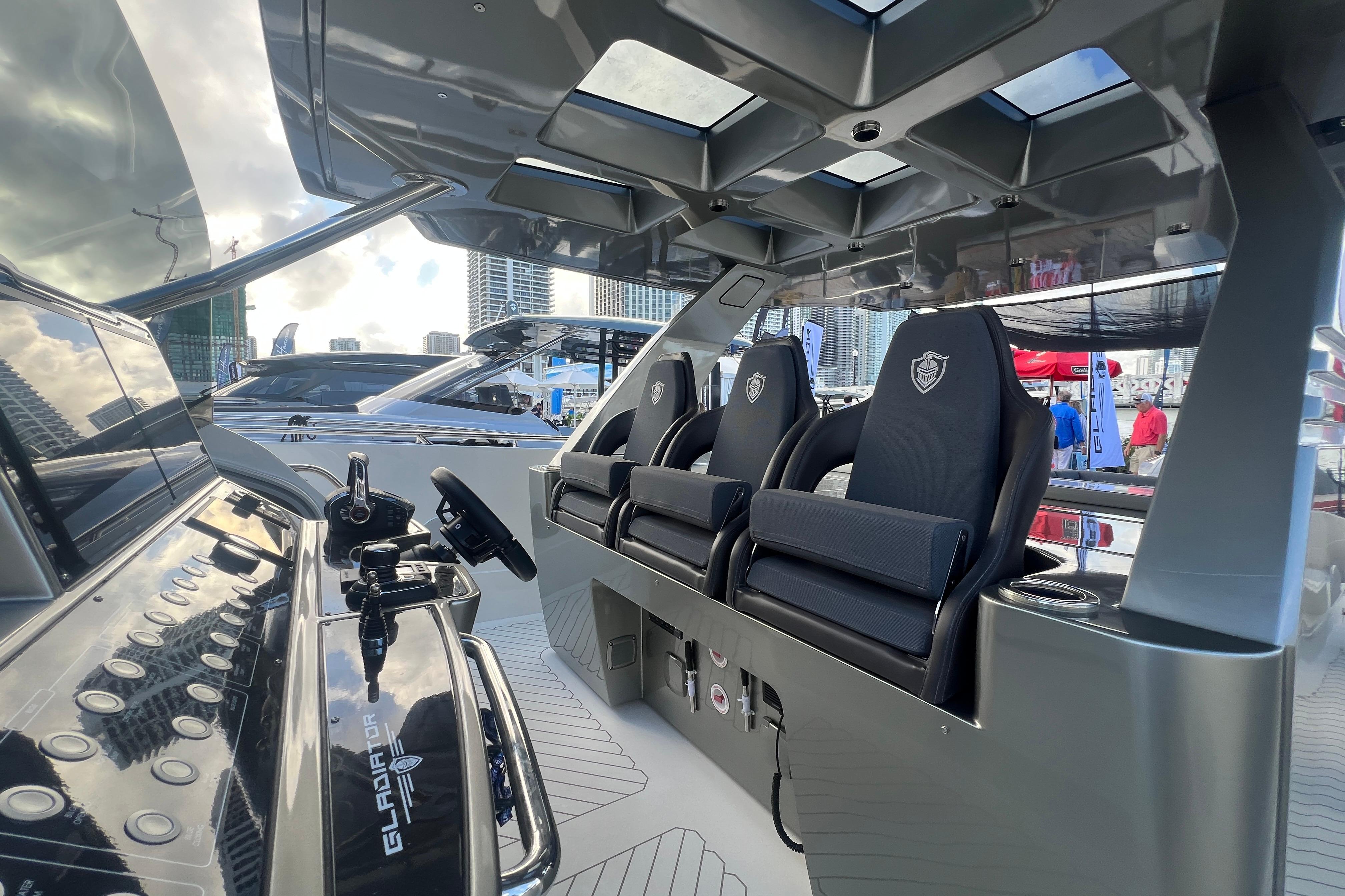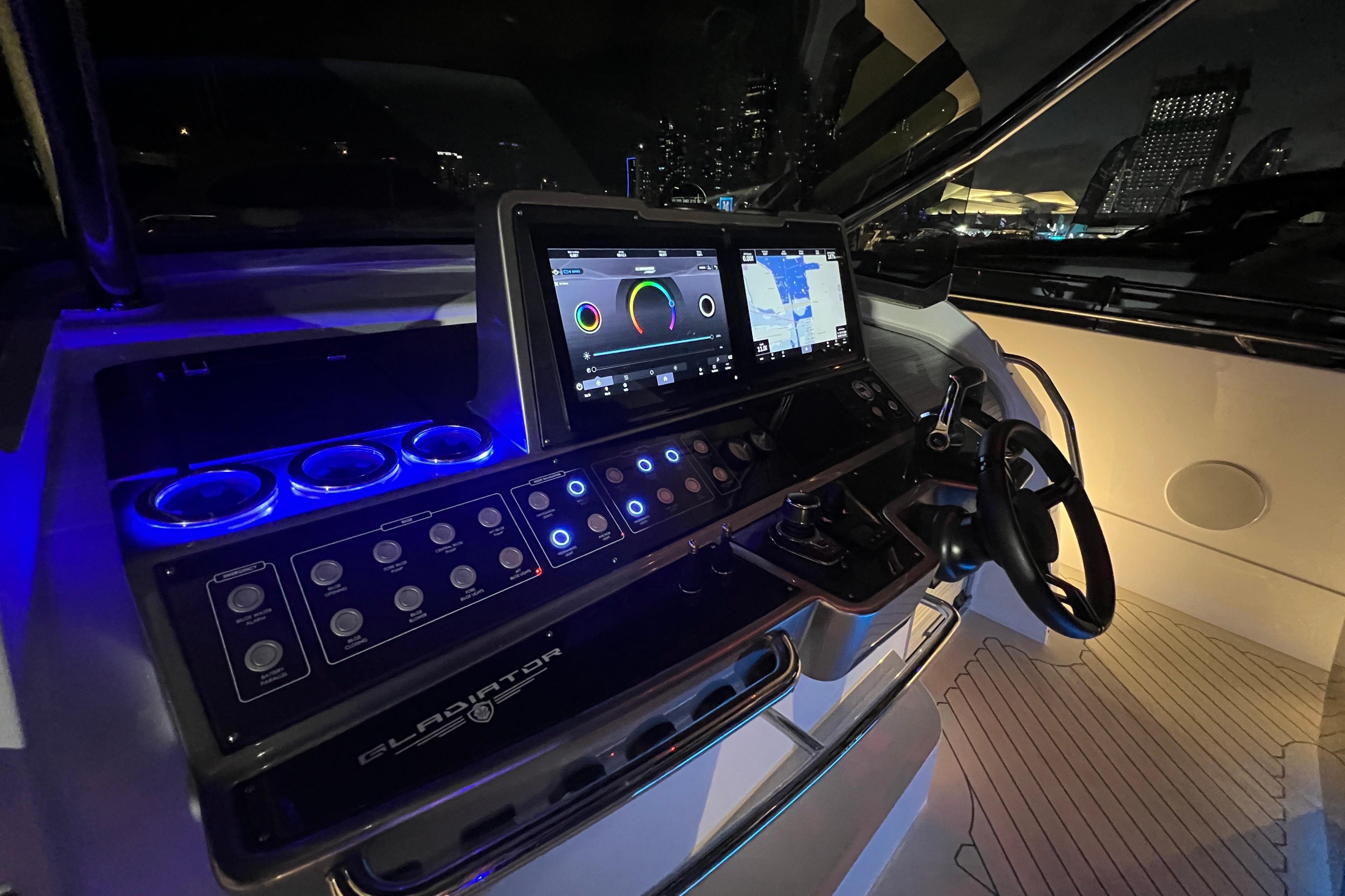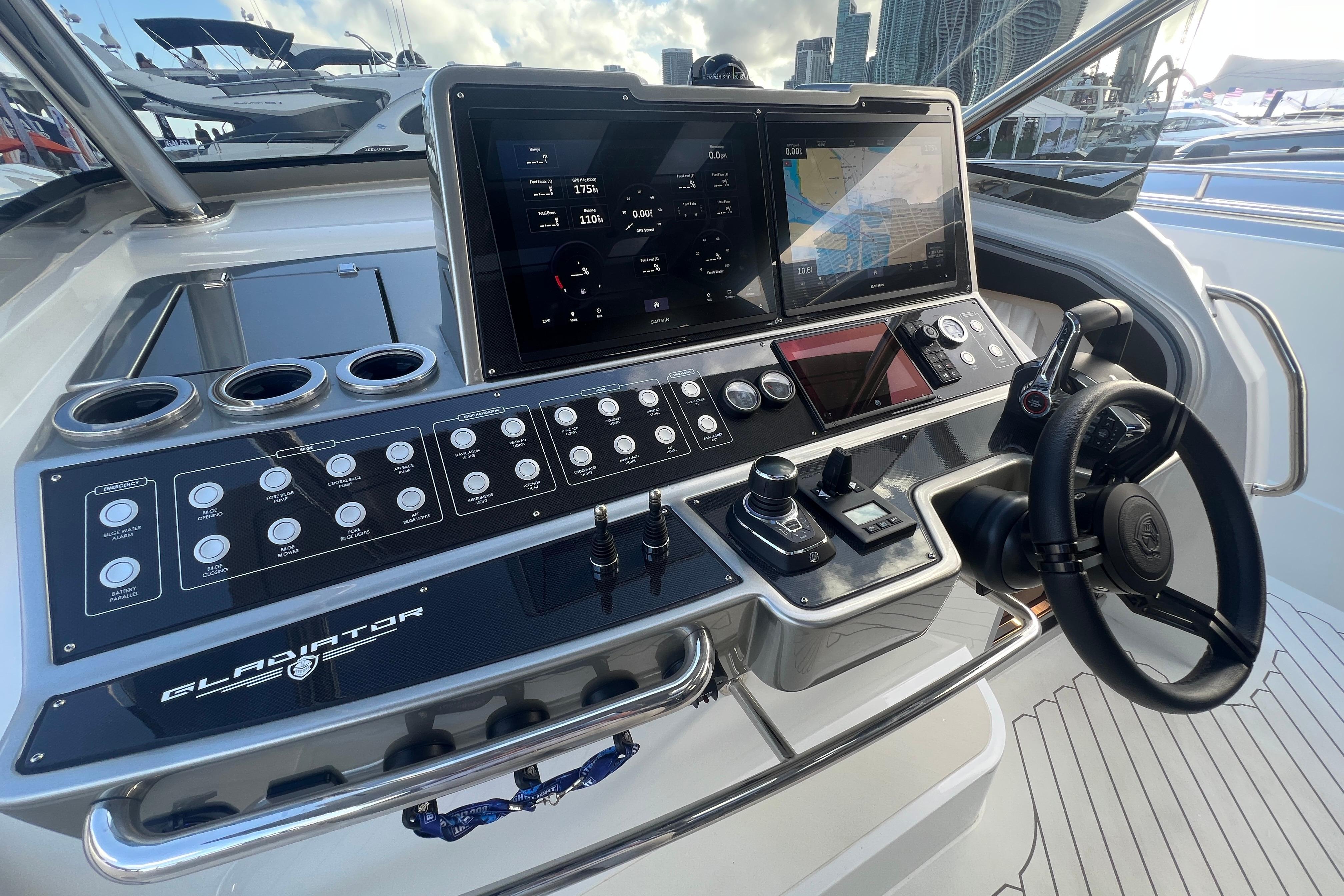 Ex-Demo — Ready for Immediate DeliveryThis New Ex Demo 2023 Canados Gladiator 493 is equipped with triple 600hp Mercury V12s. Two cabins, a spacious cockpit lounge, forward sunpad, and full wet bar make this 49-foot yacht perfect for weekend escapes or high-end entertaining. Perfect for traveling with the family, evening cocktail cruises, sand bar days and more. The gladiator 493 has a generator, seakeeper, carbon fiber helm suite with Flir, and bow thruster just to name a few options. Ready for immediate delivery. Features & Options:Two bespoke cabinsHead with private showerMassive cockpit loungeForward sunpadFull wet barSeakeeper stabilizationOnboard generatorAmple storage throughoutColor-matched speakersCarbon fiber accents throughoutPremium finishes throughoutBig-yacht amenities on a sport yacht platform