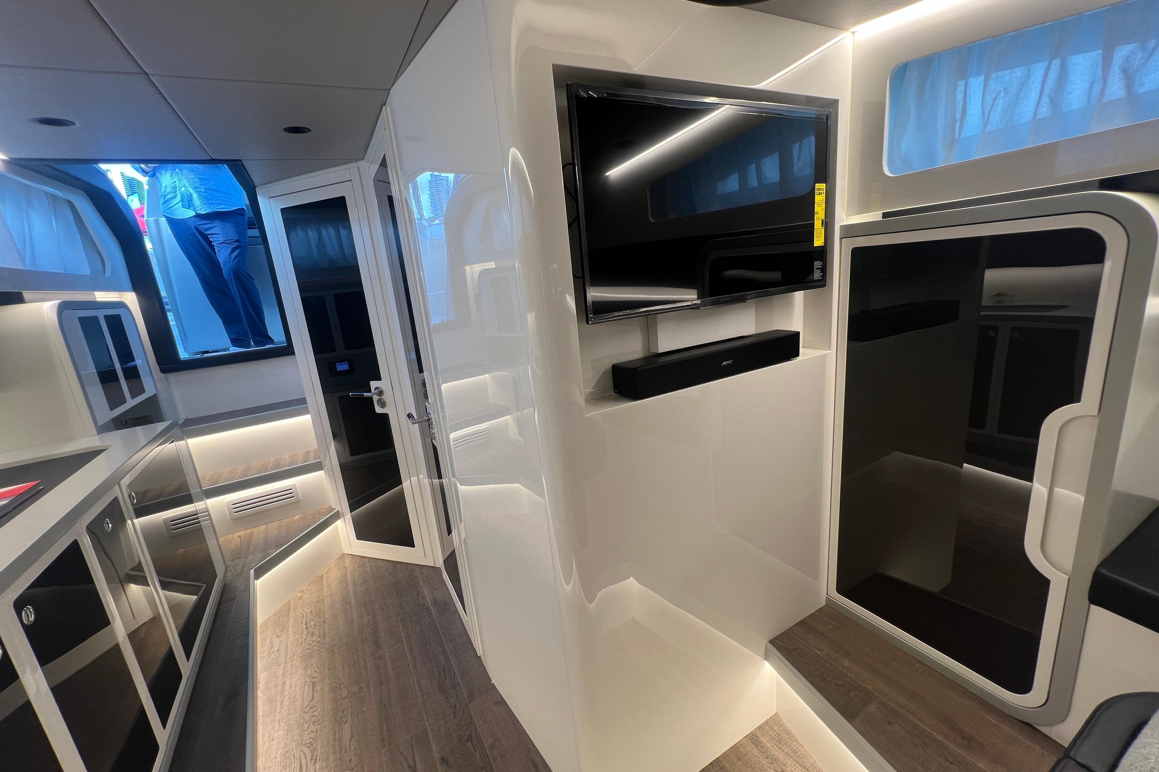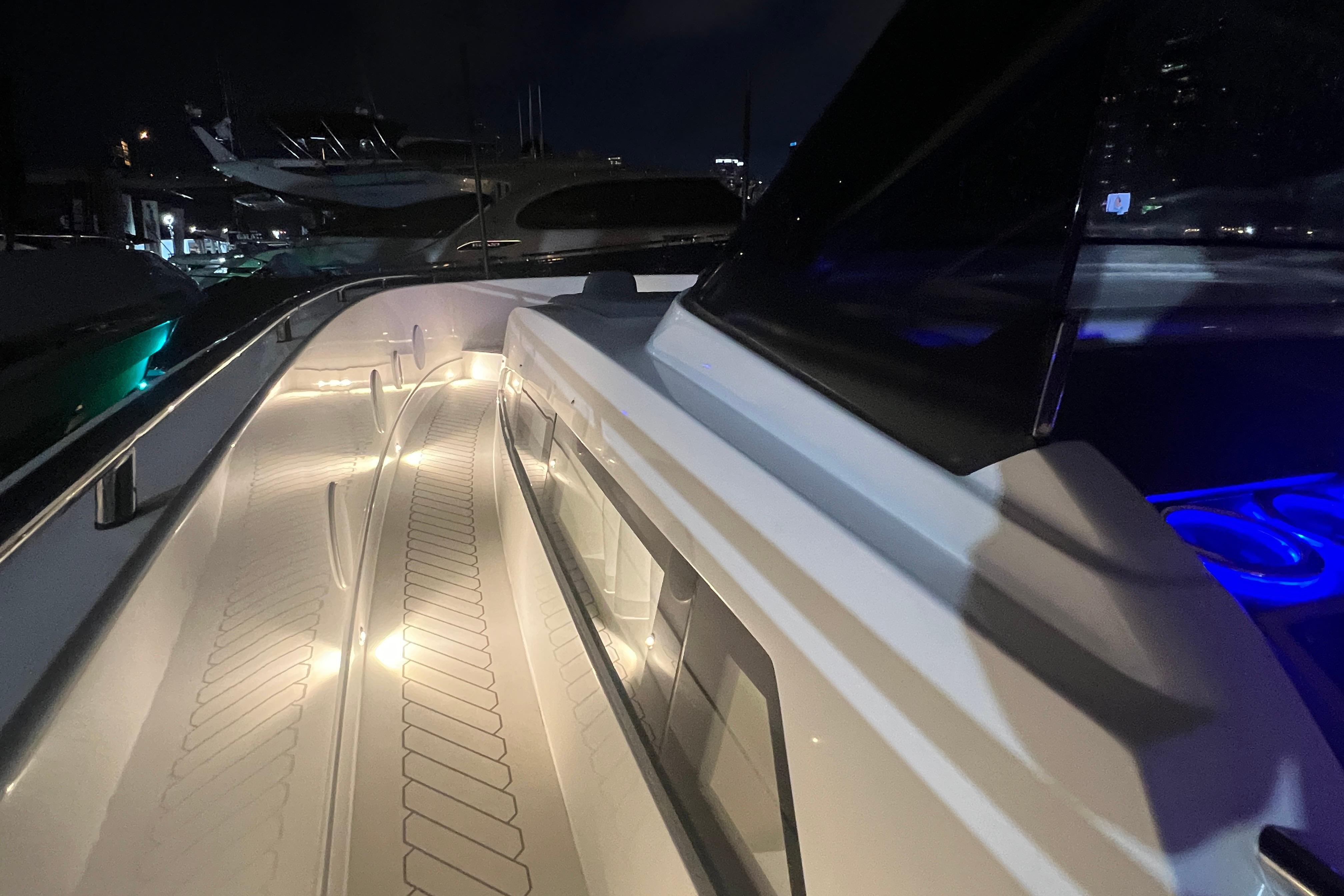 - Indirect LED strip light bars around the main cabin escape hatch leather panel, around the floor steps, on the side of the main ceiling and above the starboard side furniture block;