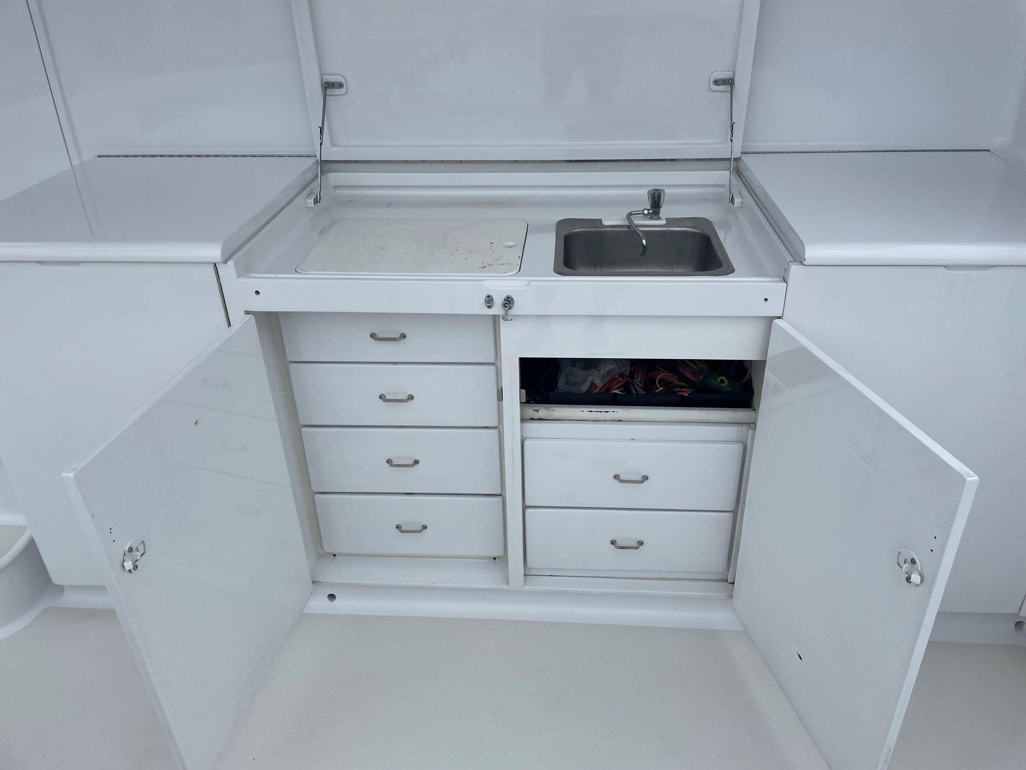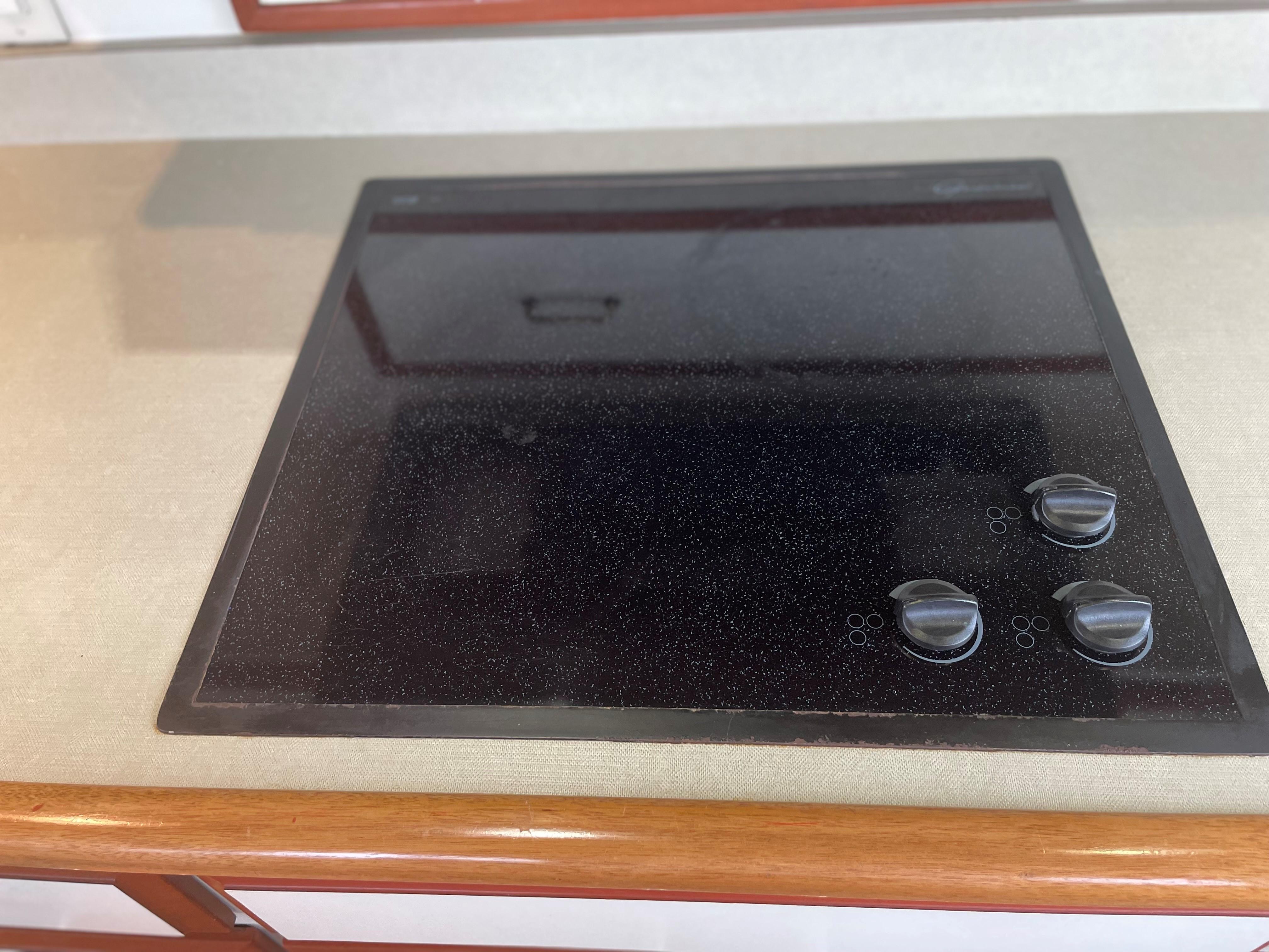 The U-shaped galley is forward on starboard side and features a large sink, electric stove, microwave, two Subzero refrigerator units under peninsula countertop, and an abundance of drawer and cabinet storage. The cabinets and drawers are white Formica with beautiful satin-finished teak trim. Galley sole is cherrywood with black accent grooves.
