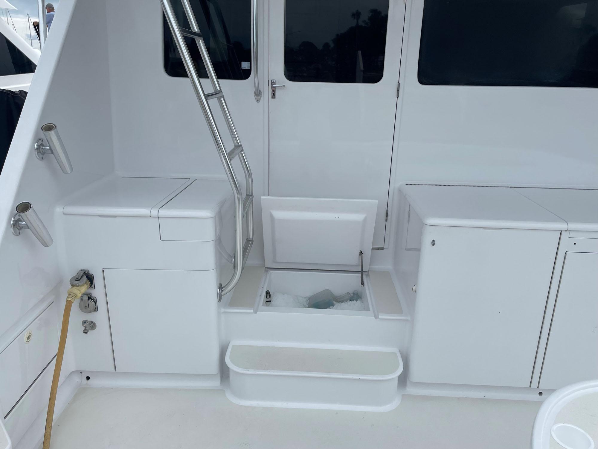 - Large removable cooler forward of flybridge console seating can double as table and is secured to deck with custom aluminum railing