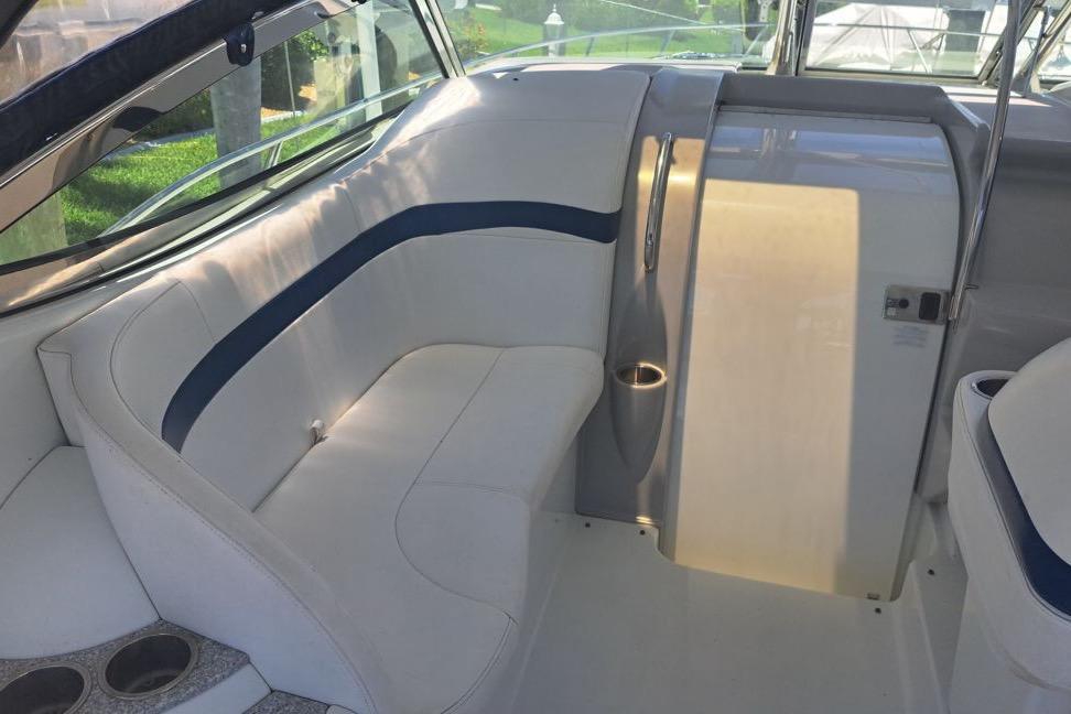 Spacious cockpit with a double helm seat, flip up bolsters, and double seat on the port side