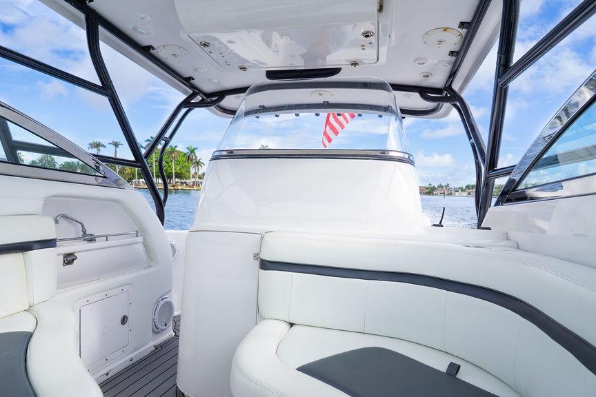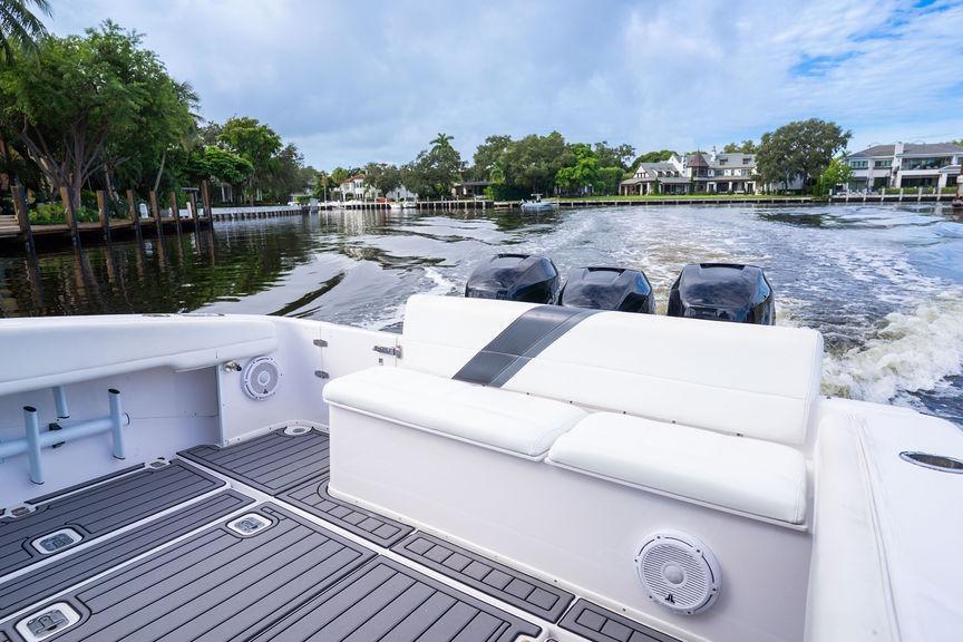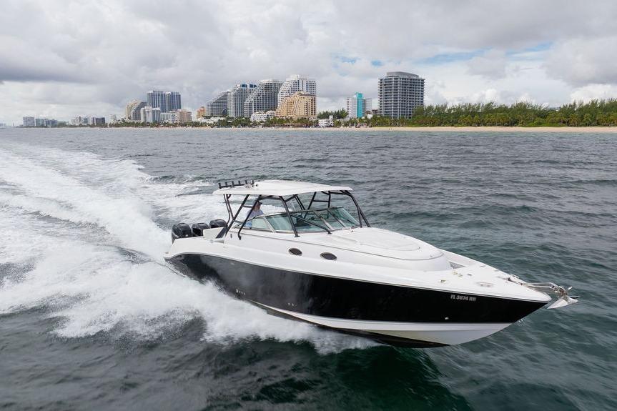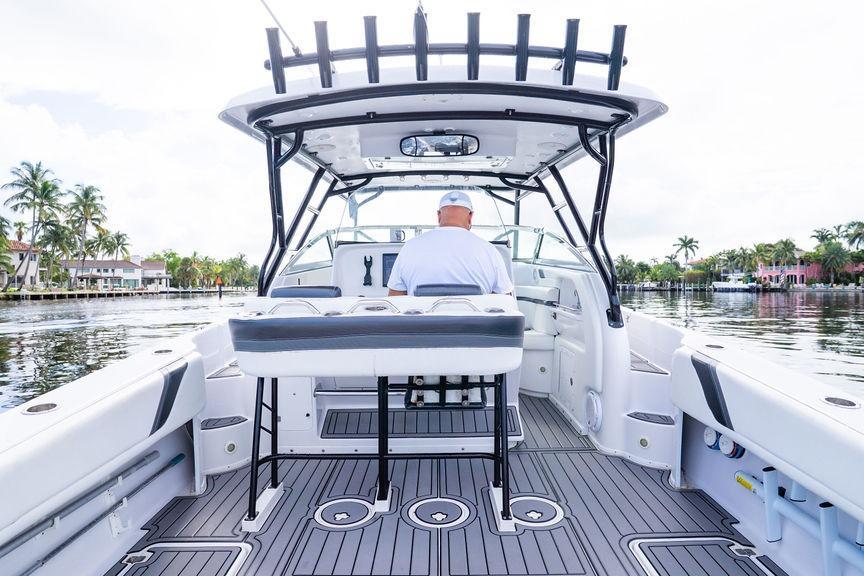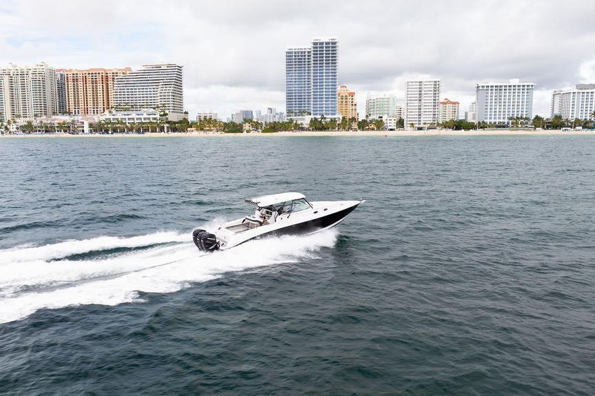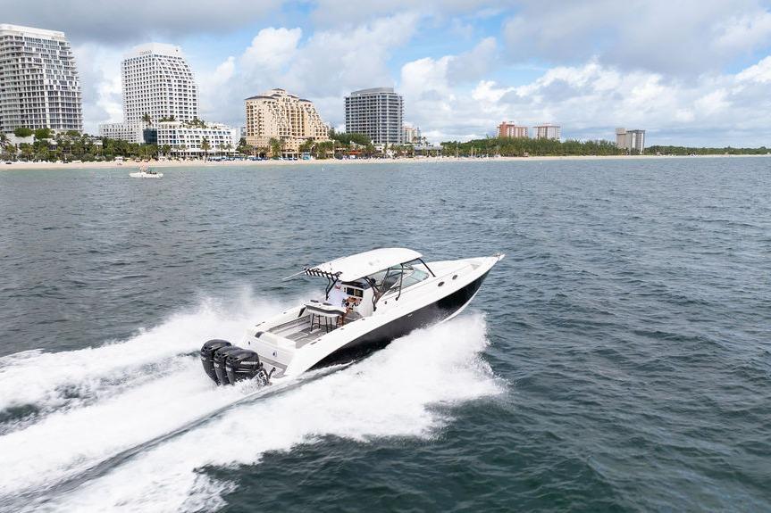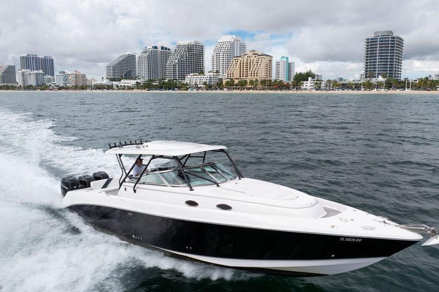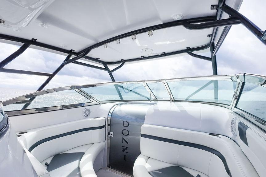 The Donzi 38 ZF Cuddy has been designed to offer great looks, blistering performance, and unmatched versatility. Designed with thoughtful features throughout, this offshore speed machine performs equally well whether tournament fishing, cruising, entertaining, diving, or pursuing any other activity. The 38 ZF has been finished with upscale touches throughout. The sculpted, richly-padded drop-down bolster seats at the helm would be right at home on the sportiest high performance boat. The same goes for the wraparound cockpit coaming bolsters. There?s room to stand inside the roomy console with fiberglass inner liner, where a freshwater sink, shower, and head are housed. A curved, tempered-glass console windshield offers great looks as well as protection from the wind. With its proven ventilated hull design and triple Mercury 4-stroke Verado outboards, the 38 ZF offers great speed, nimble handling and a smooth, dry ride.