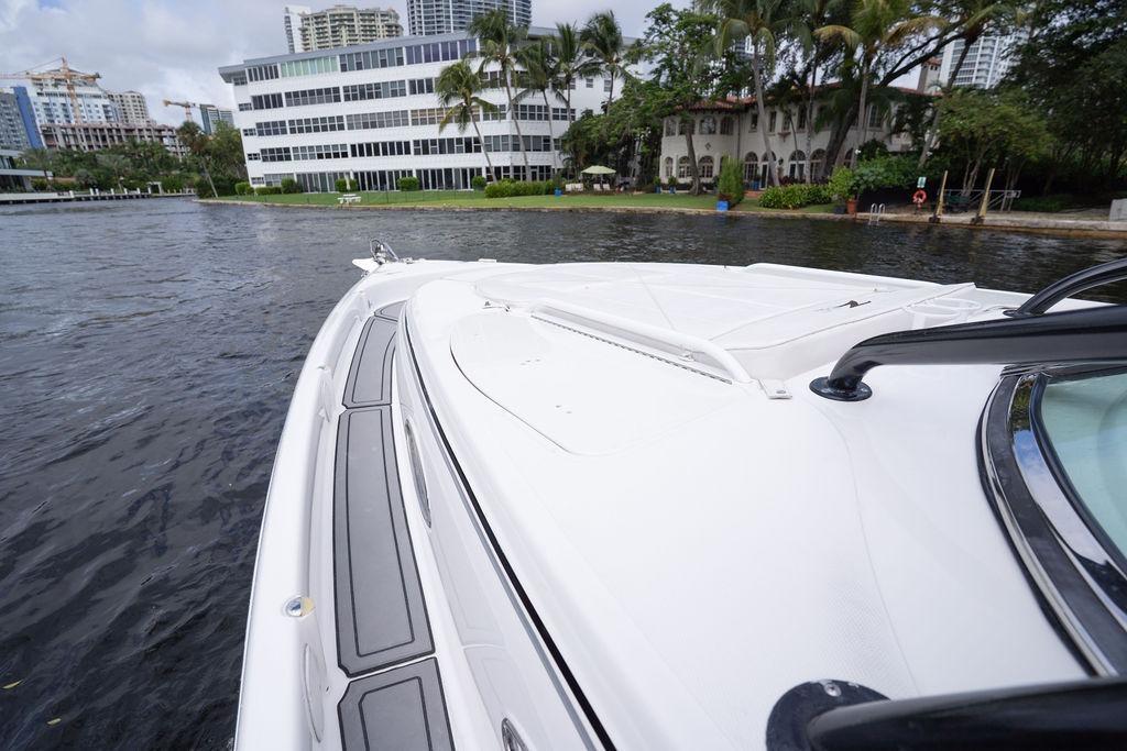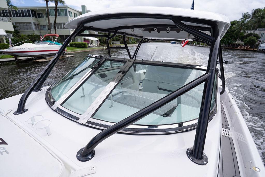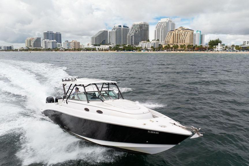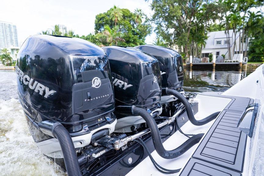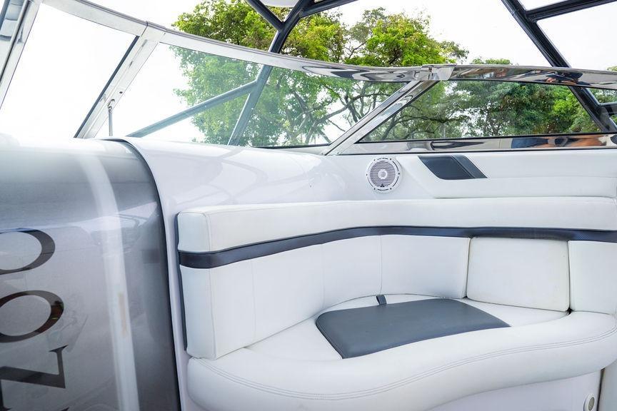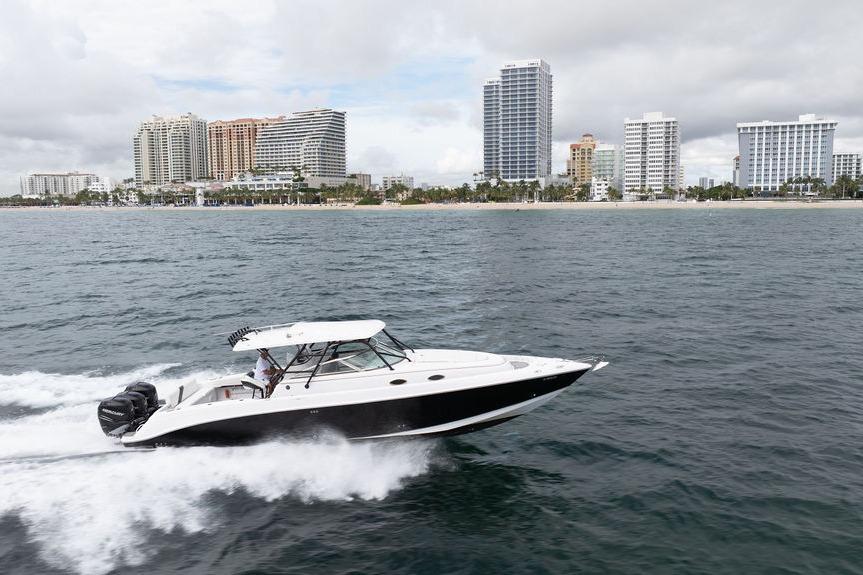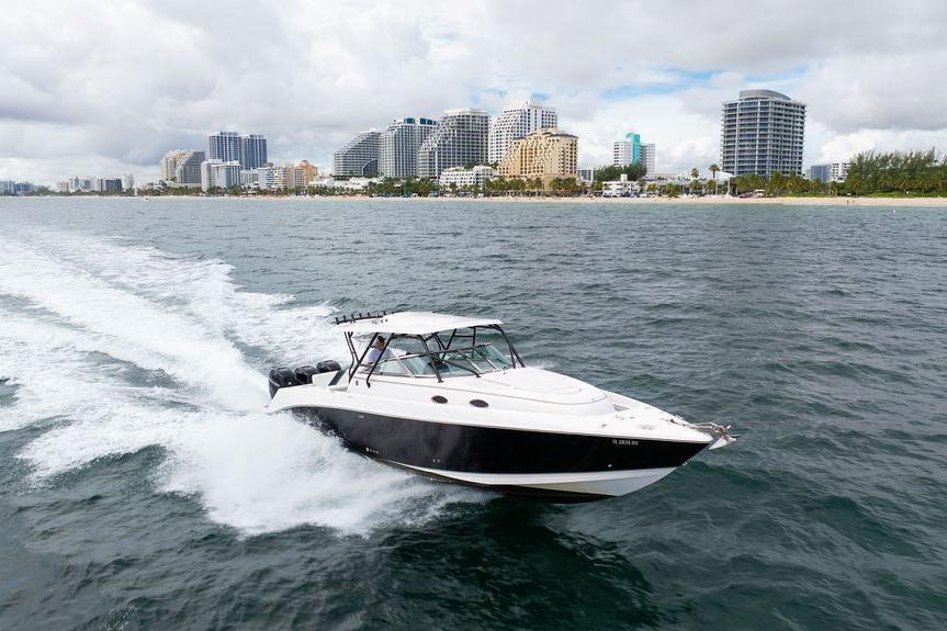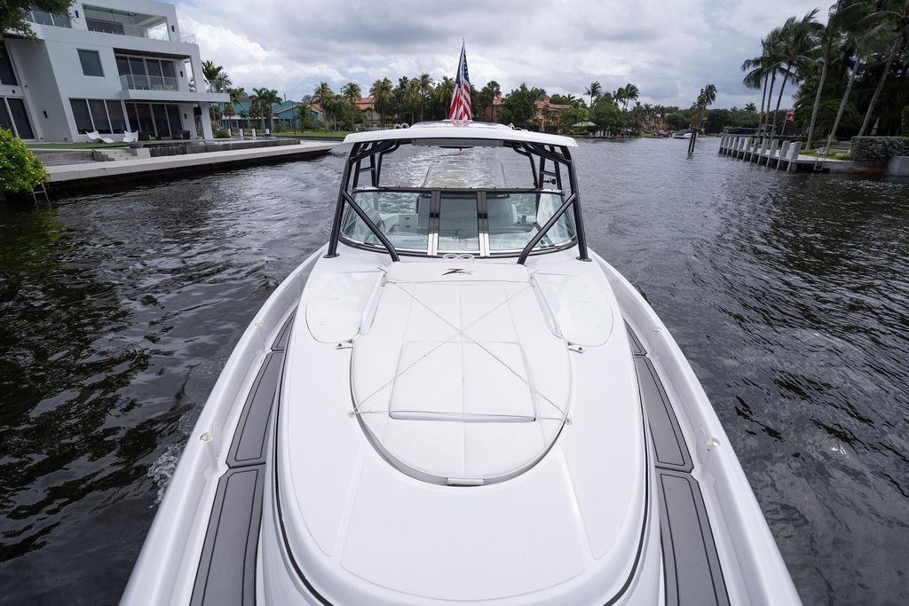 The Donzi 38 ZF Cuddy has been designed to offer great looks, blistering performance, and unmatched versatility. Designed with thoughtful features throughout, this offshore speed machine performs equally well whether tournament fishing, cruising, entertaining, diving, or pursuing any other activity. The 38 ZF has been finished with upscale touches throughout. The sculpted, richly-padded drop-down bolster seats at the helm would be right at home on the sportiest high performance boat. The same goes for the wraparound cockpit coaming bolsters. There?s room to stand inside the roomy console with fiberglass inner liner, where a freshwater sink, shower, and head are housed. A curved, tempered-glass console windshield offers great looks as well as protection from the wind. With its proven ventilated hull design and triple Mercury 4-stroke Verado outboards, the 38 ZF offers great speed, nimble handling and a smooth, dry ride.