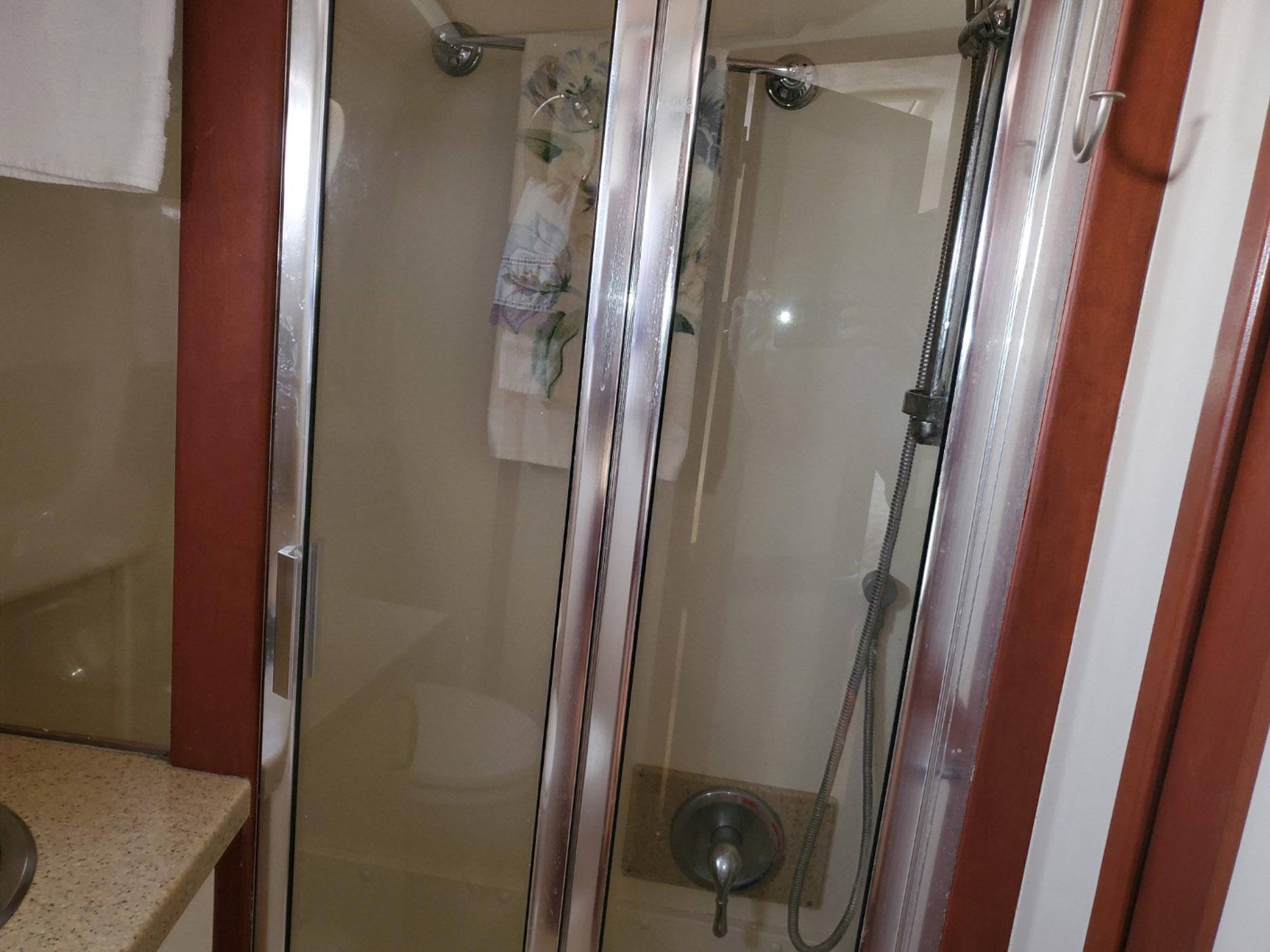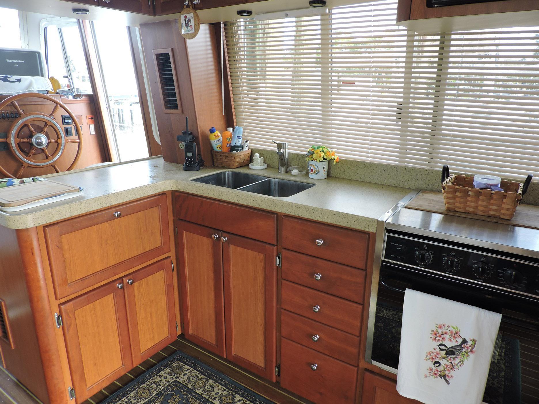 Once you enter the large sliding door, you will notice the entire vessel’s interior is trimmed in high-gloss cherrywood and features a very well kept teak and holly sole. The layout consists of a large main salon with the well appointed galley to starboard and a sleeper sofa to port. The dining area is forward, to port, opposite the lower helm, which has an easy to bow access door. There are large opening windows, ensuring plenty of light and cross breeze if you desire. Below is the owners queen berth forward with hanging lockers and en-suite access to the head. The guest quarters are to port under the dinette’s sole and has twin berths. Ascending the wide formed steps to the enclosed flybridge, you will not only find the upper helm that has a comfortable captain’s chair, but a surprising amount of usable space for entertaining which can easily be done with the summer kitchen that includes a large grill. All Eisenglass, canvas and upholstery are in excellent condition throughout.