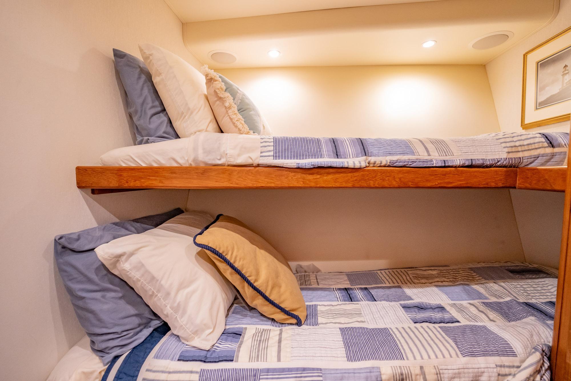 Forward are the guest staterooms, each with direct entry heads and showers. A bunk bed stateroom is on stbd opposite the laundry center. Further forward is the VIP guest with a queen berth on the centerline. New flat screen smart TVs in each stateroom as well.