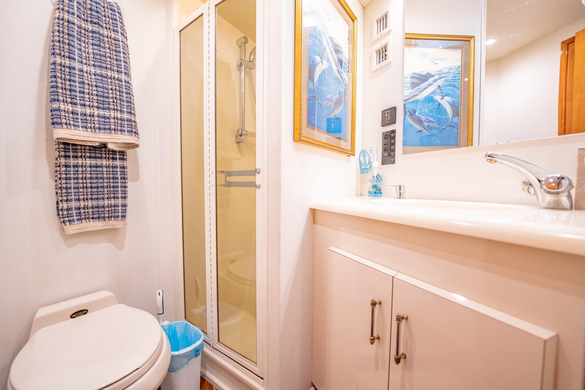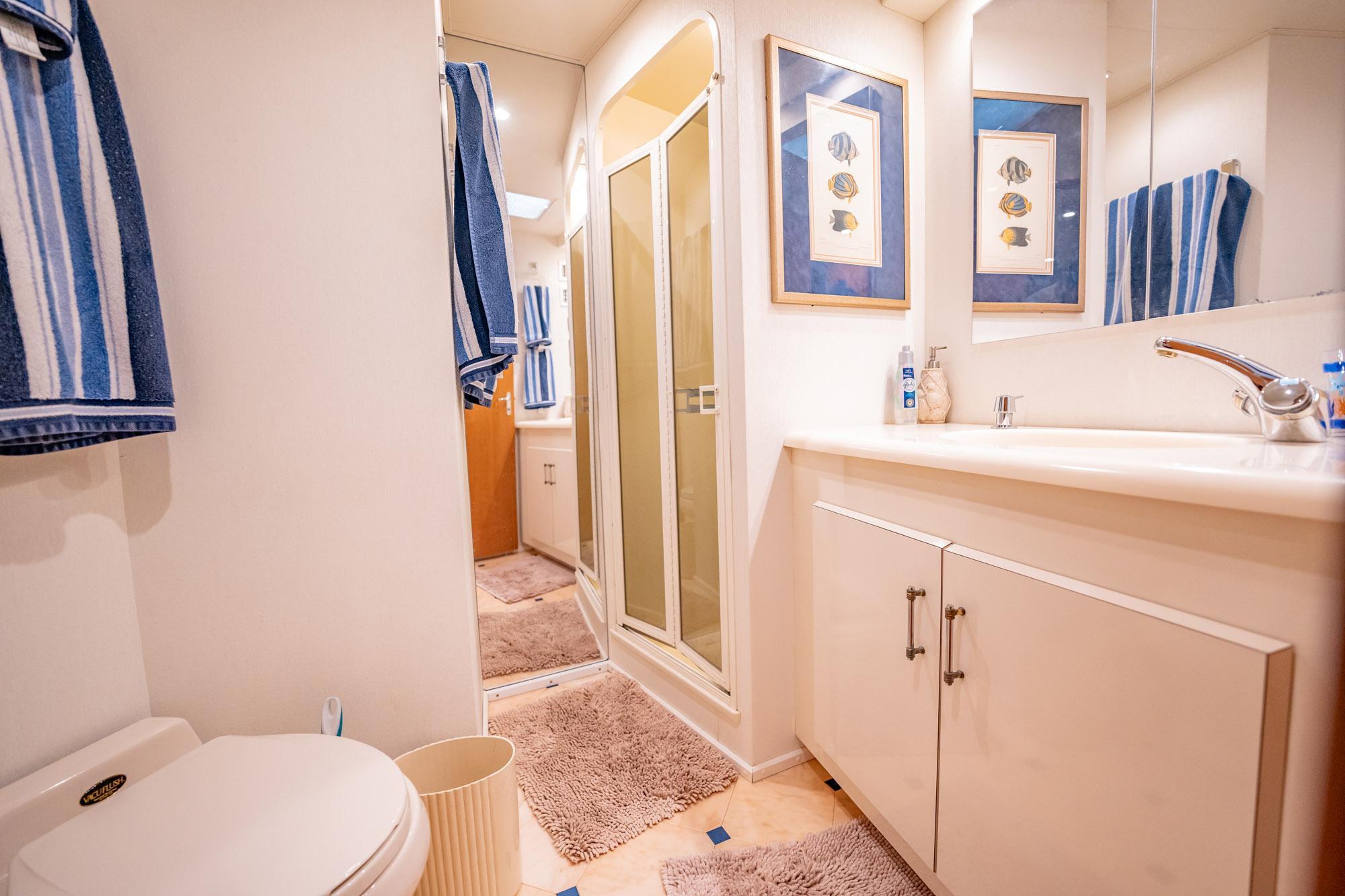 The fully enclosed and air conditioned flybridge and aft deck virtually double the space for entertainment of family and guests compared to most boats of this size. Three staterooms, three heads and three real stall showers!