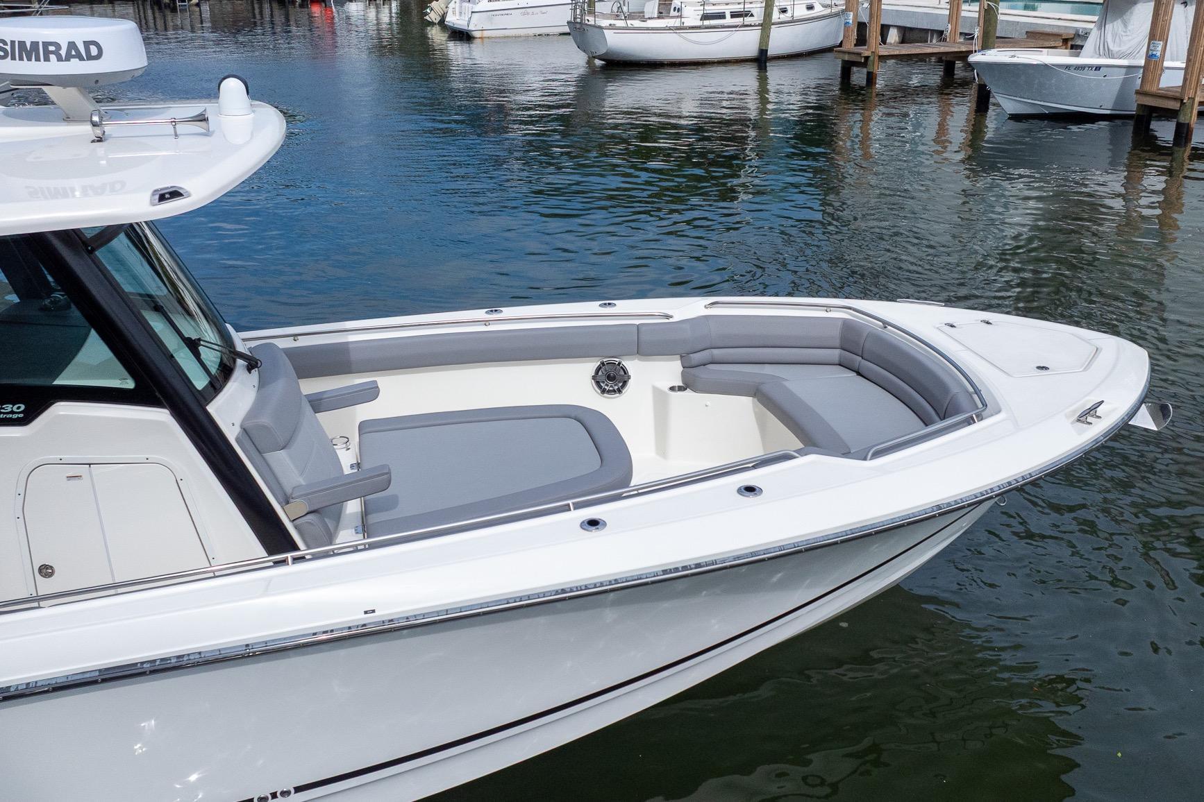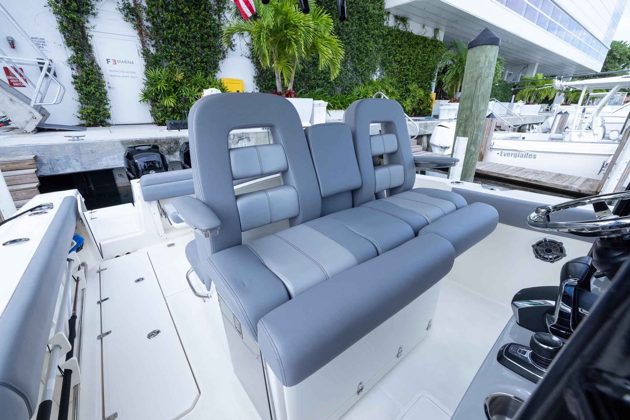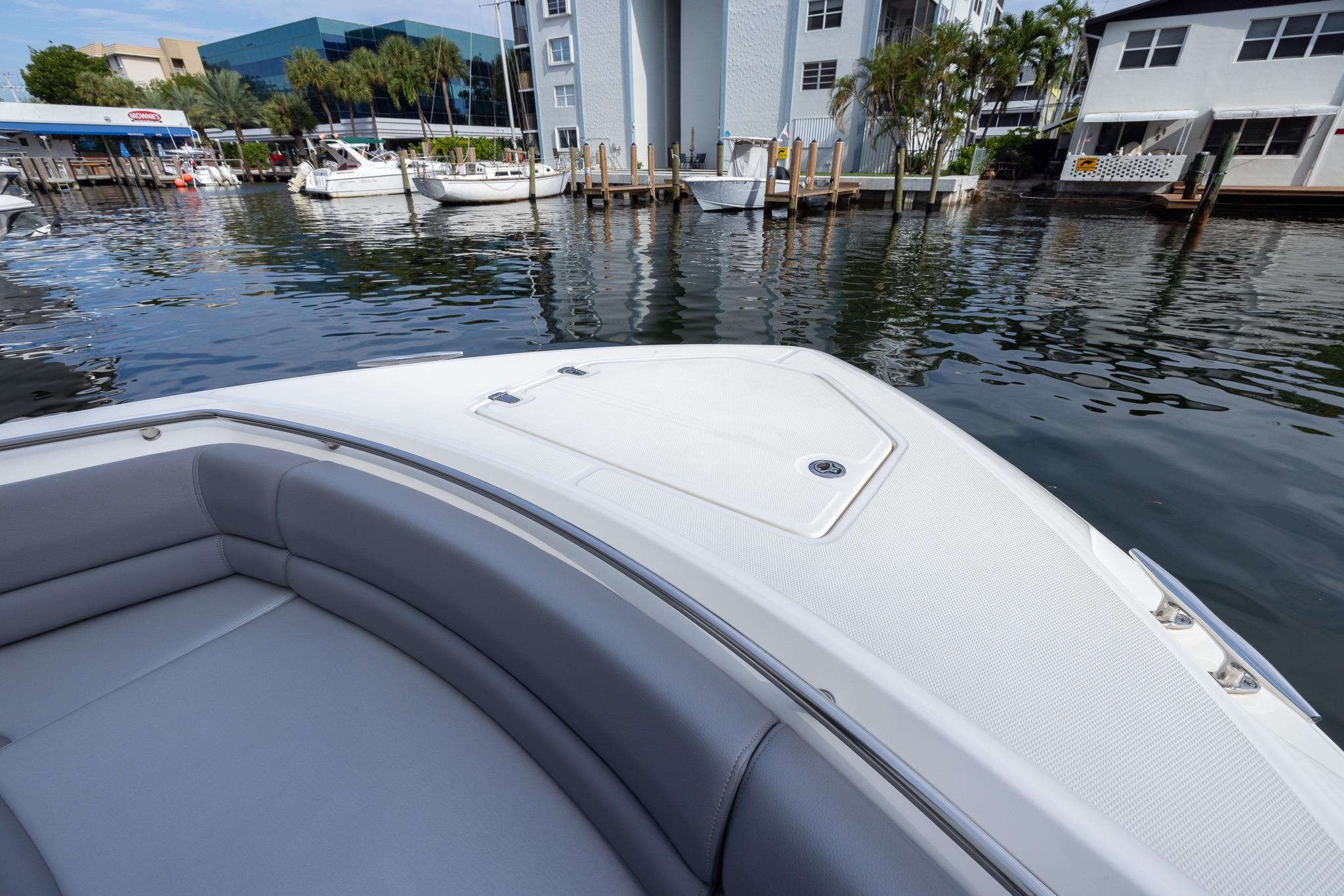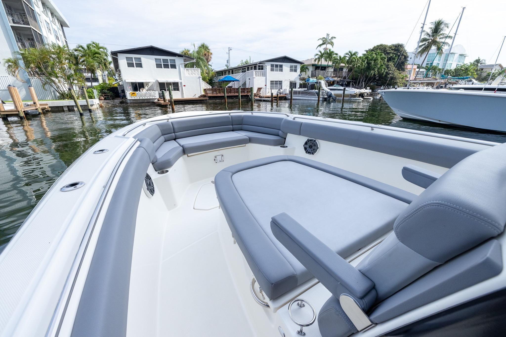 - Forward island deck seating with (2) drink holders, bolsters and removable cushions