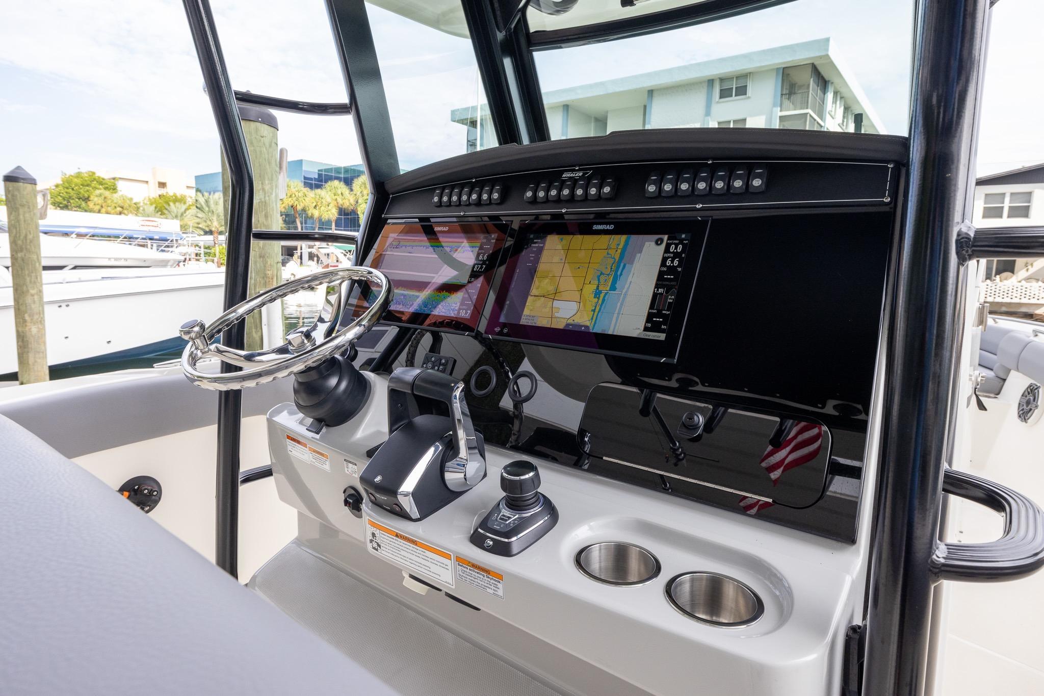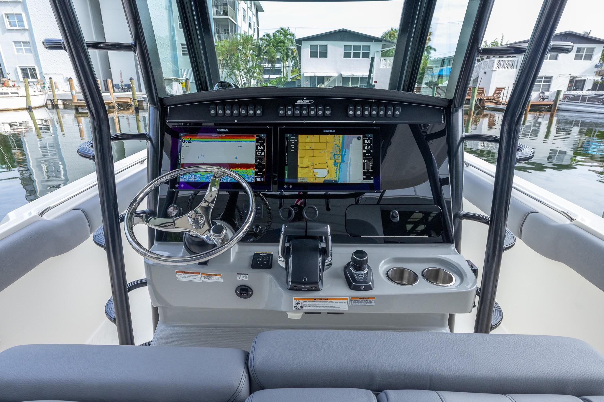 - (2) 16" Simrad NSO evo3S additional display Electronics Package, Simrad NSO evo3S 16" screen (GPS/chart plotter/fishfinder), dash surface - custom black acrylic integrated with switch panels