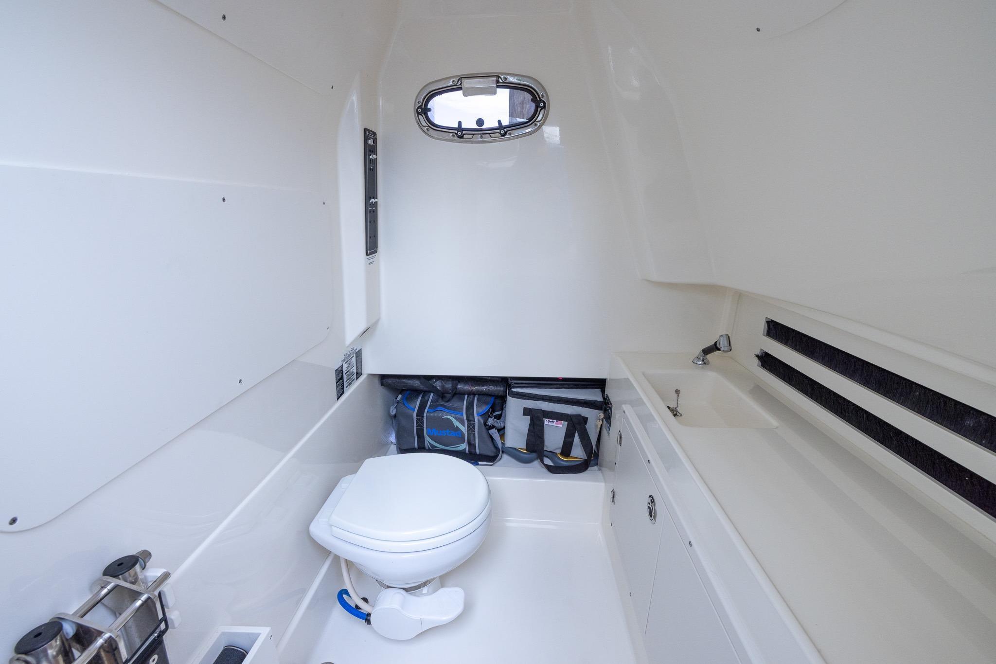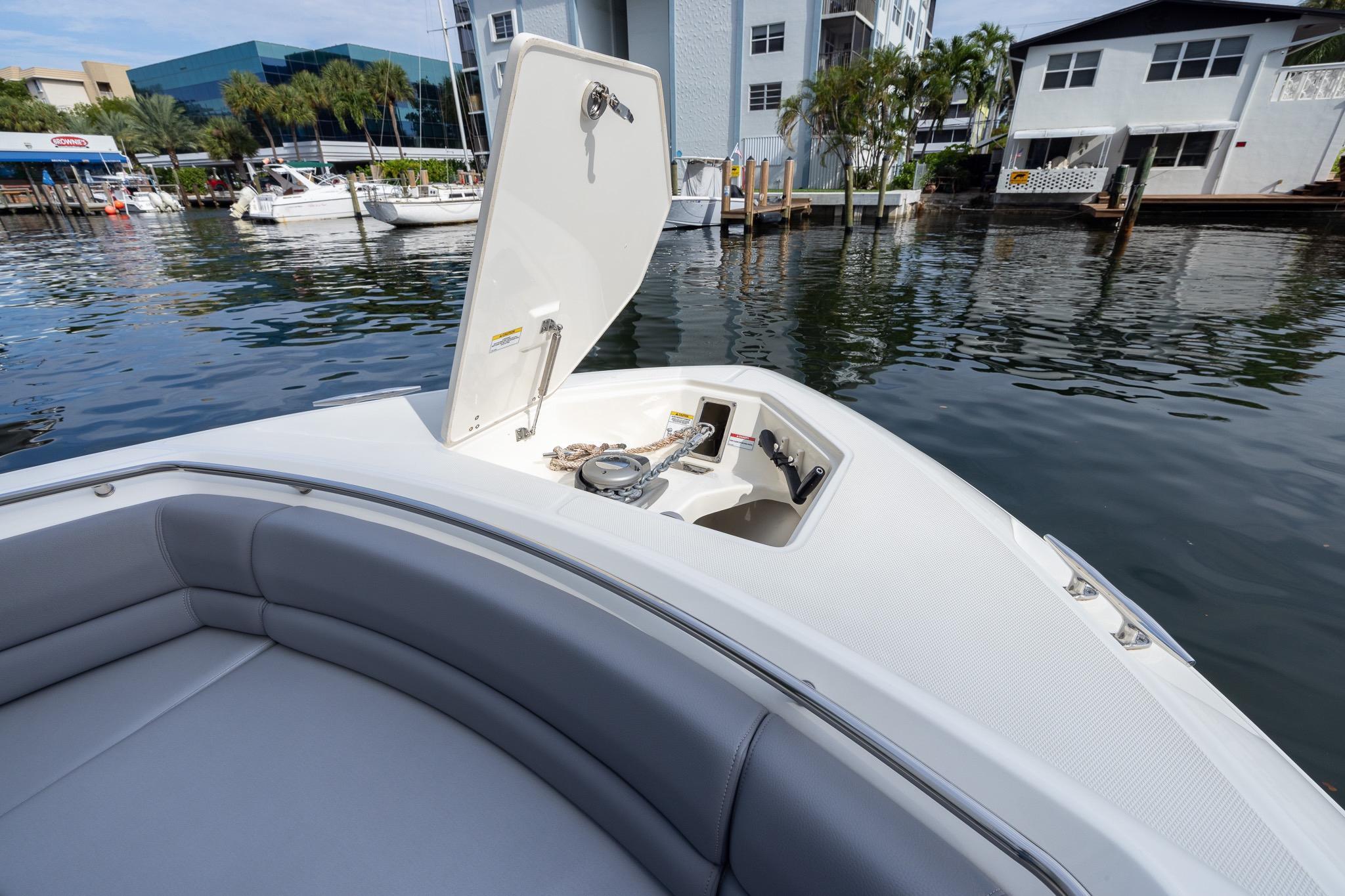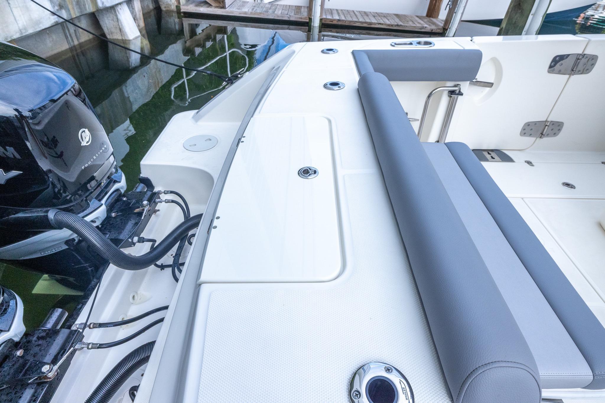 - Freshwater system (40 gallons) with sink in console, transom shower and anchor washdown