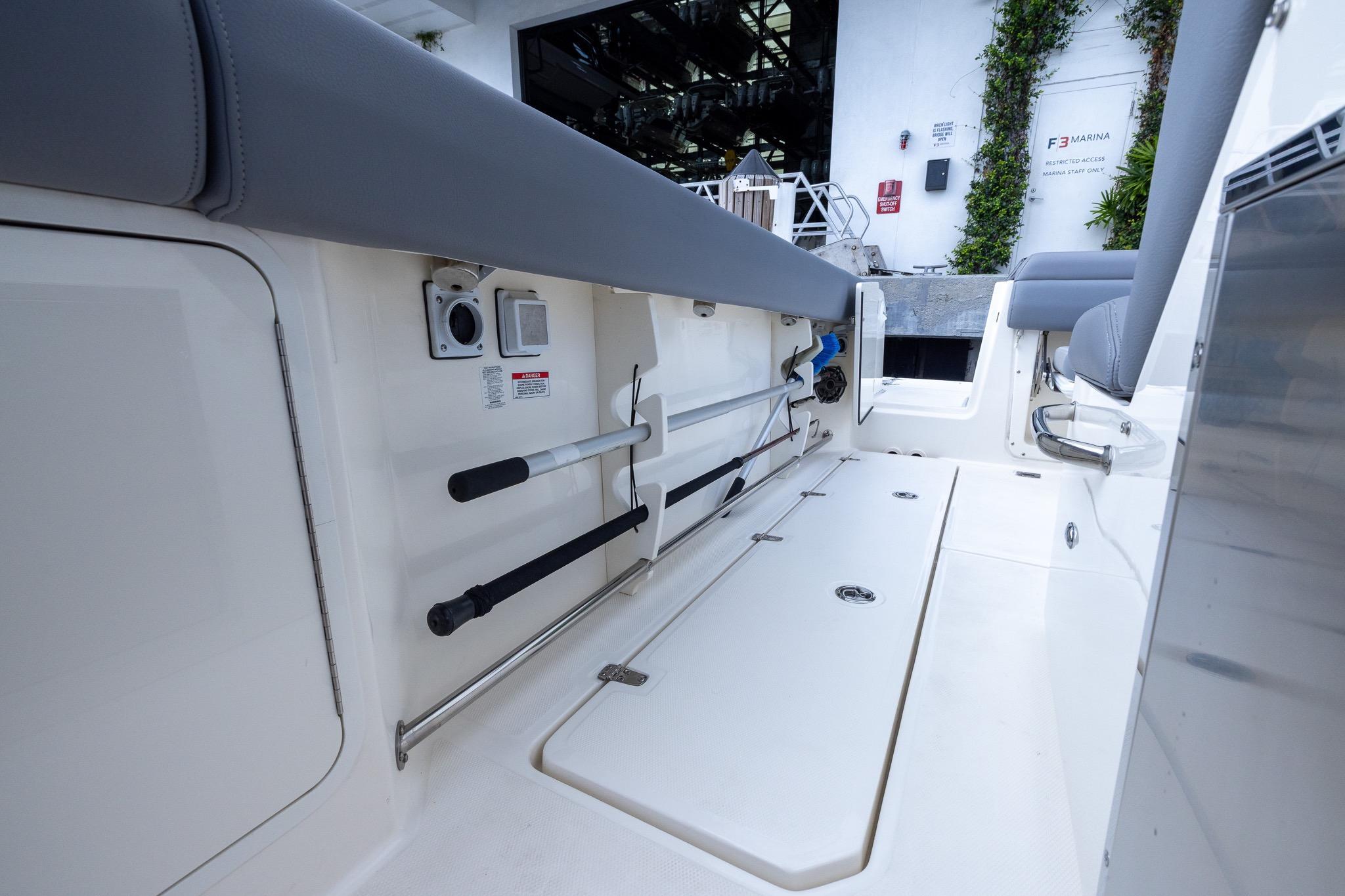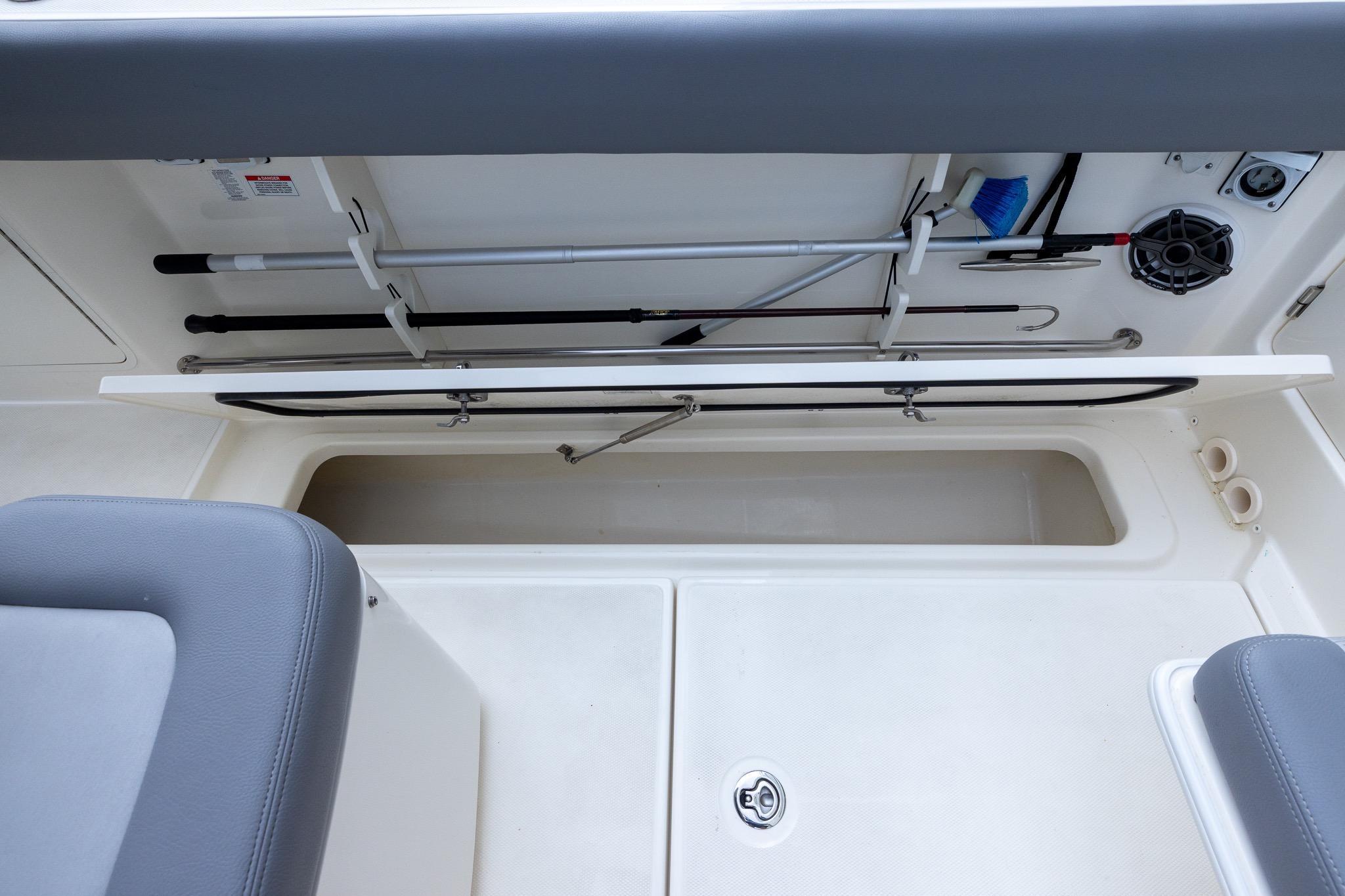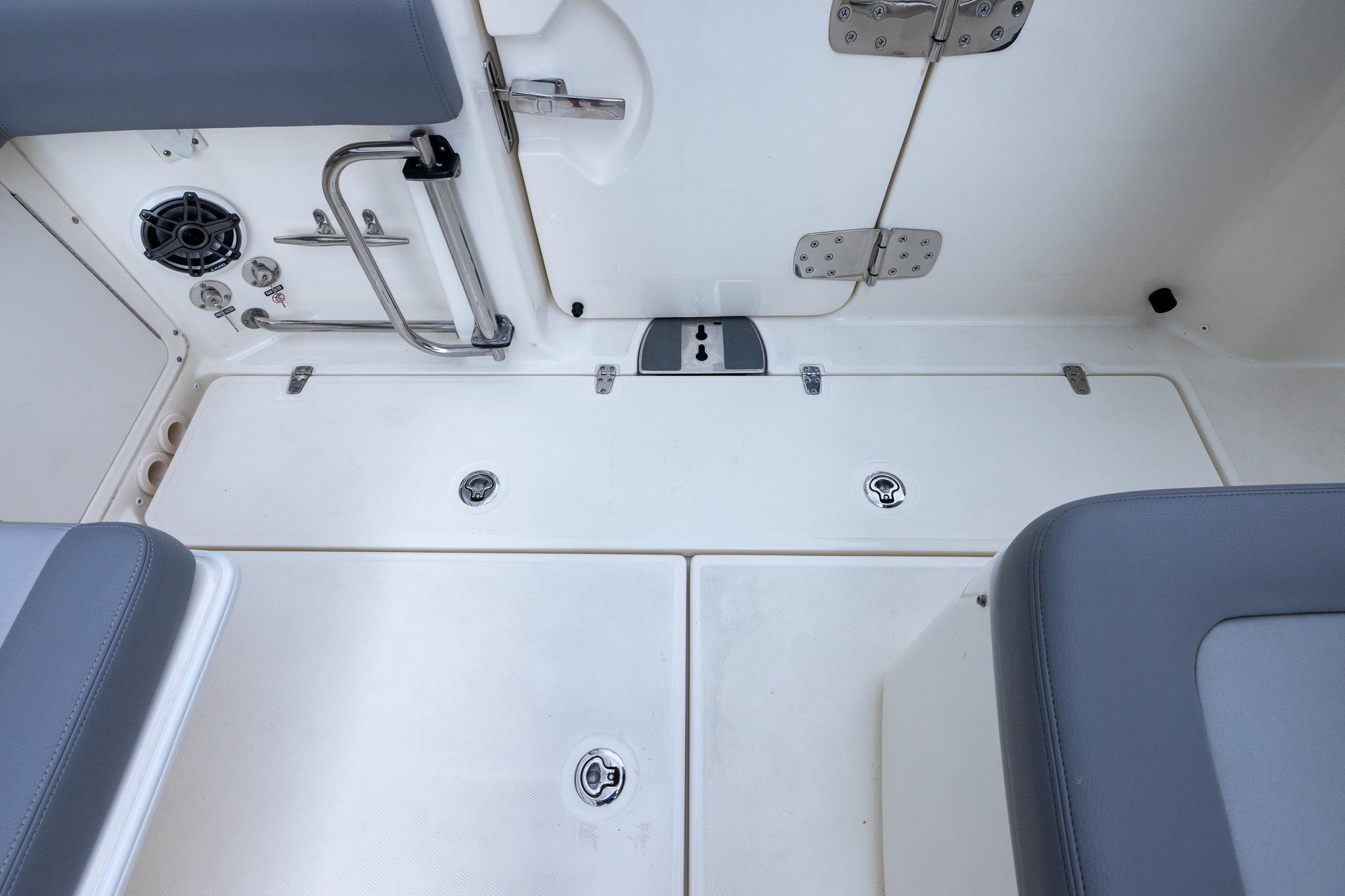 - Port aft storage at fishing prep area (can store a 5-gallon bucket)