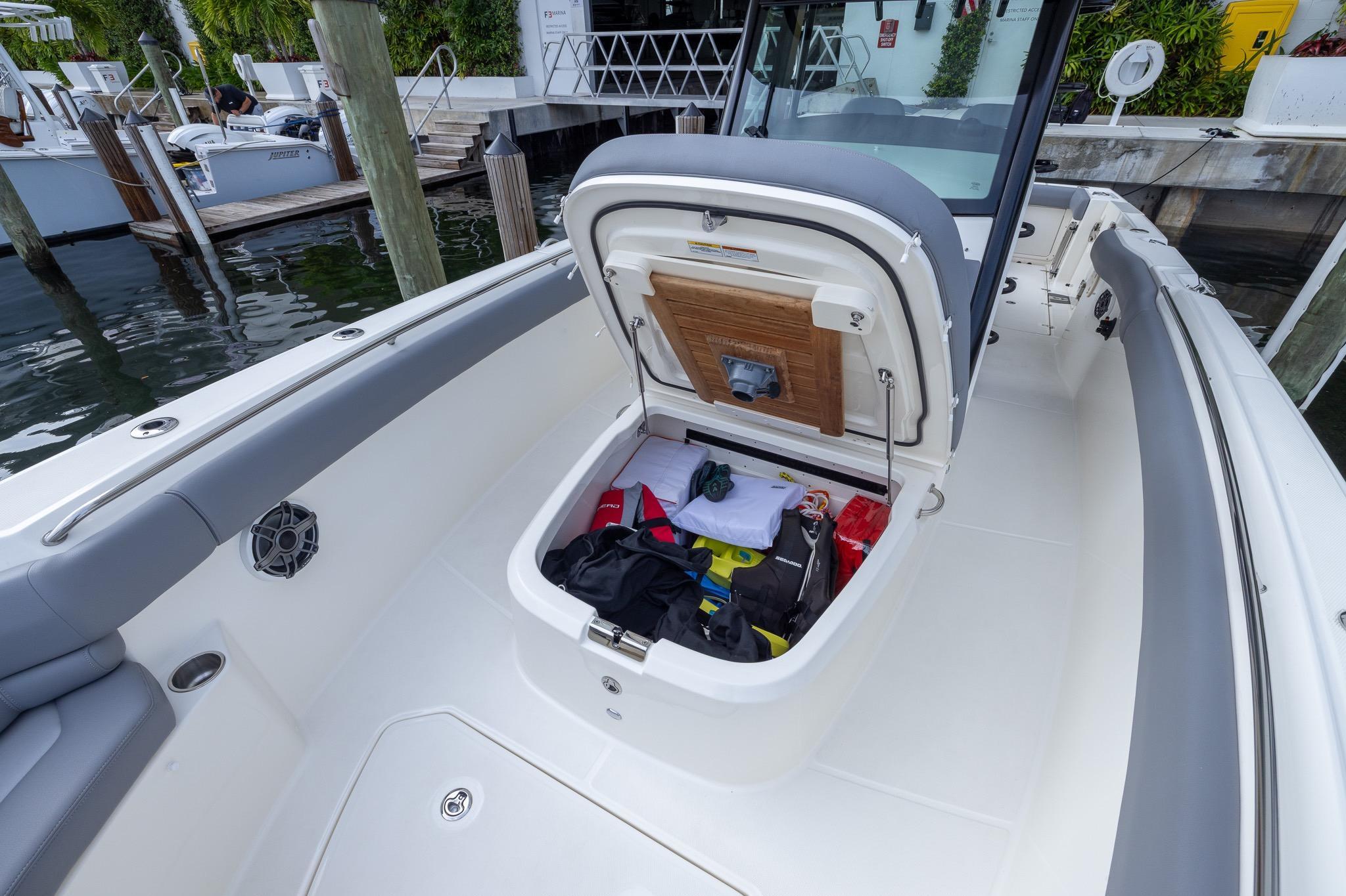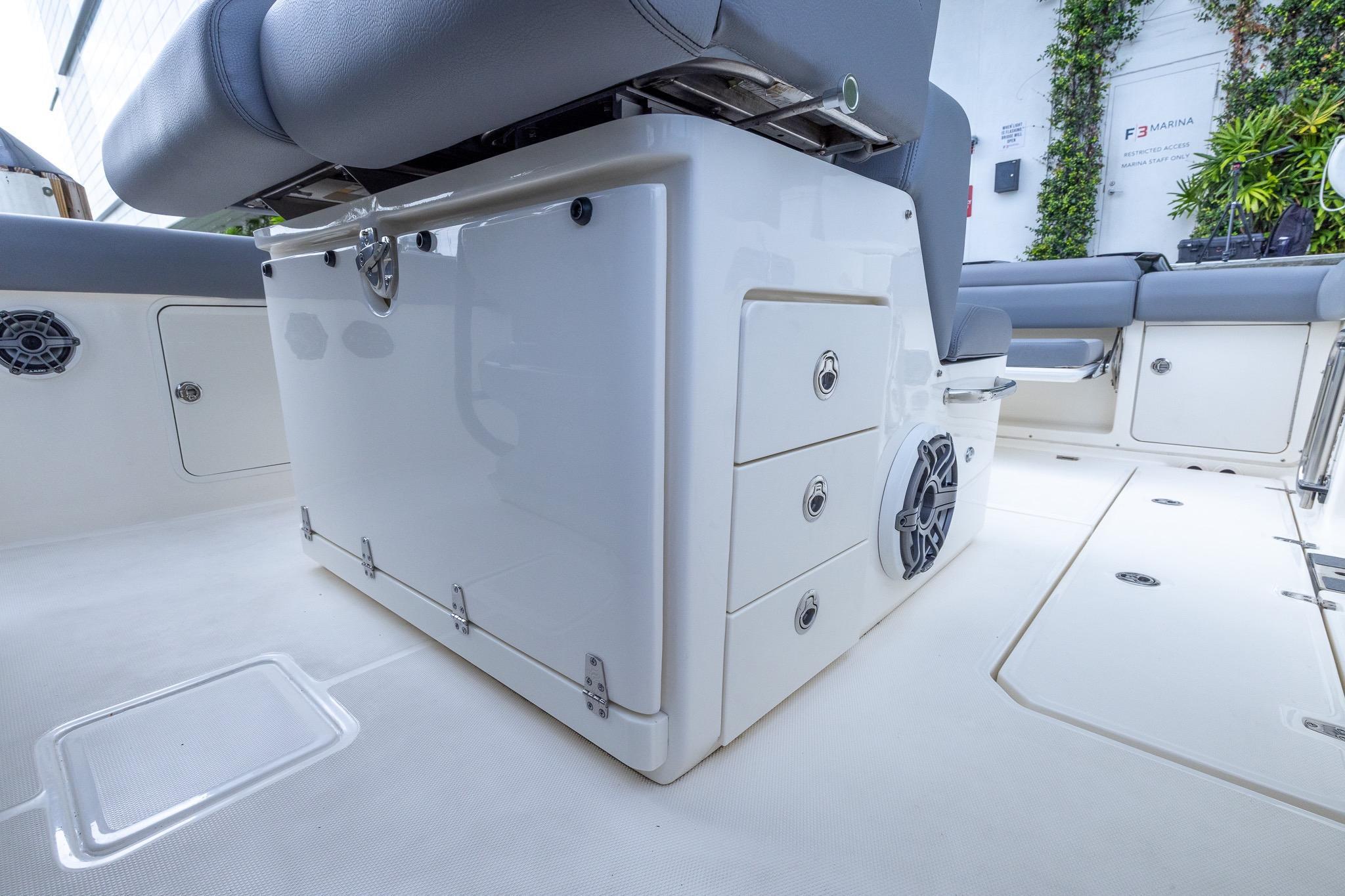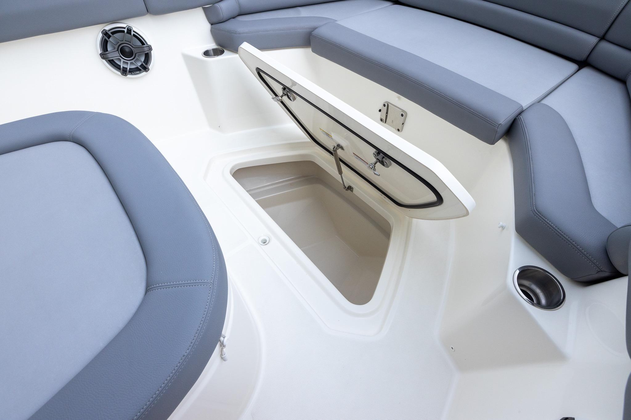 - Port aft storage at fishing prep area (can store a 5-gallon bucket)