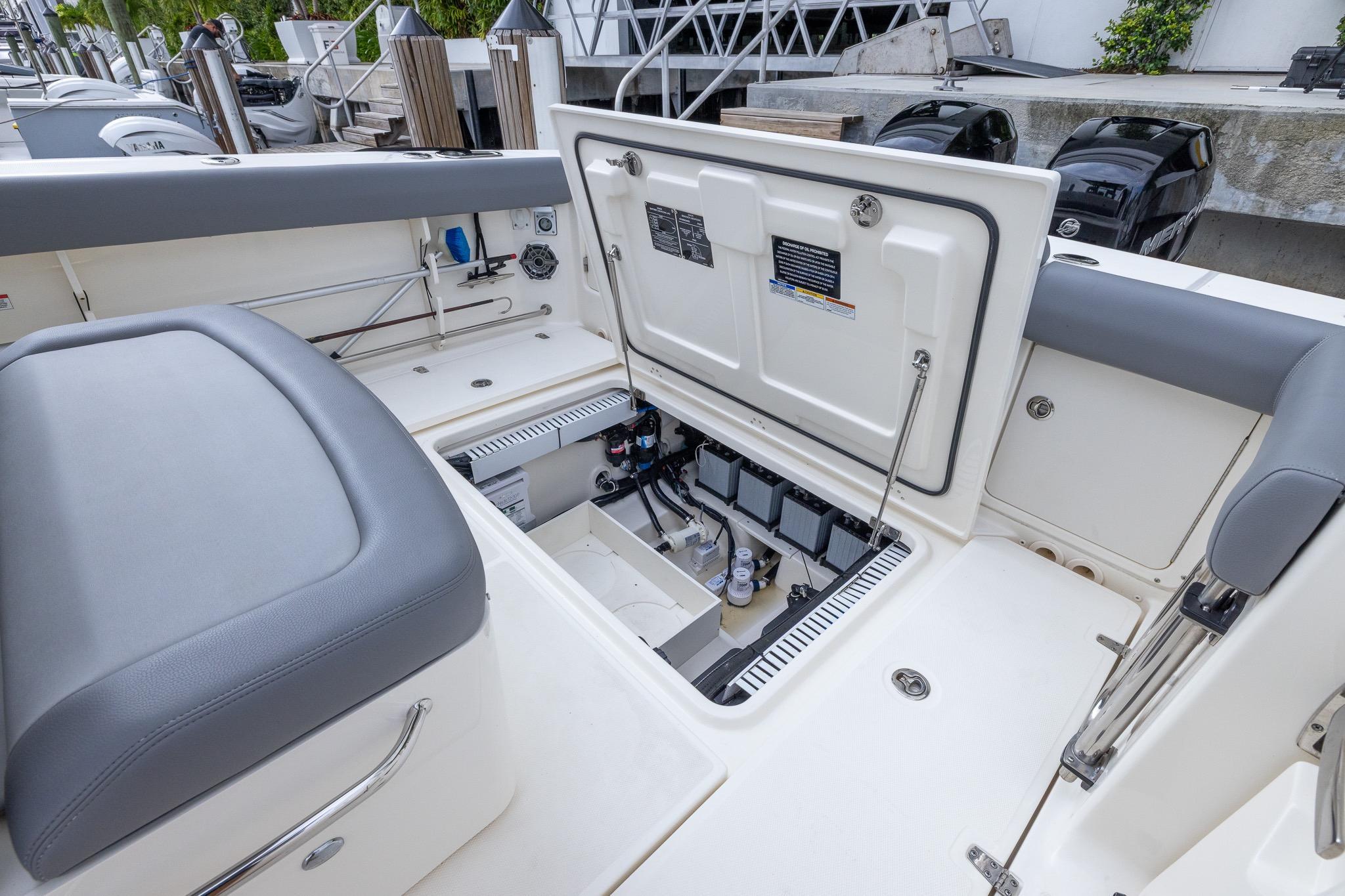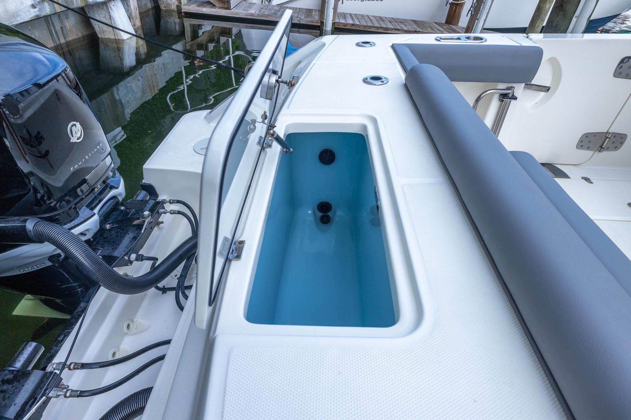 - (2) Insulated in-floor fishboxes with pump-out (57 gallons) at aft