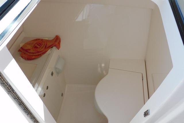 - Vacuum flush marine head with 10-gallon holding tank, macerator discharge pump, deck pump-out fitting, and bronze through hull fitting